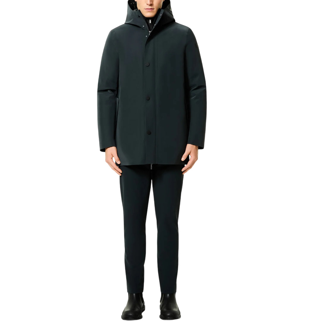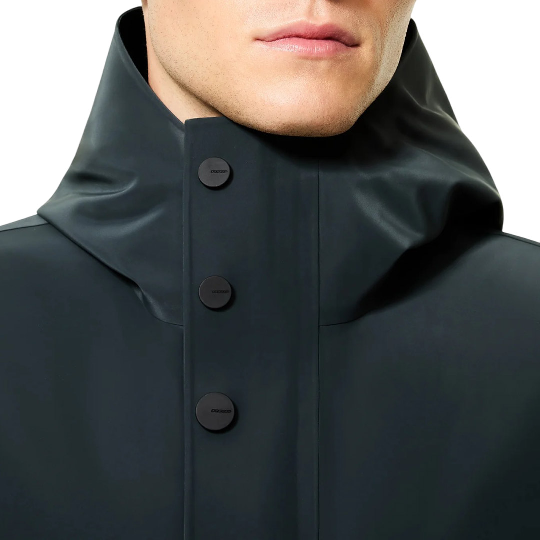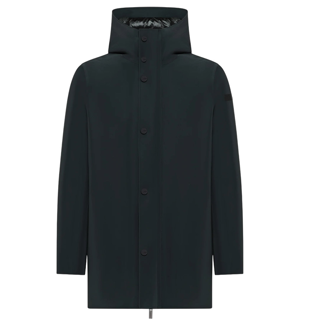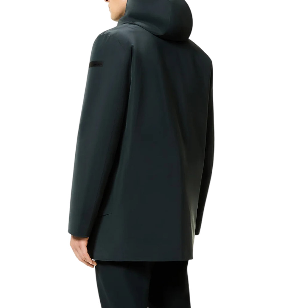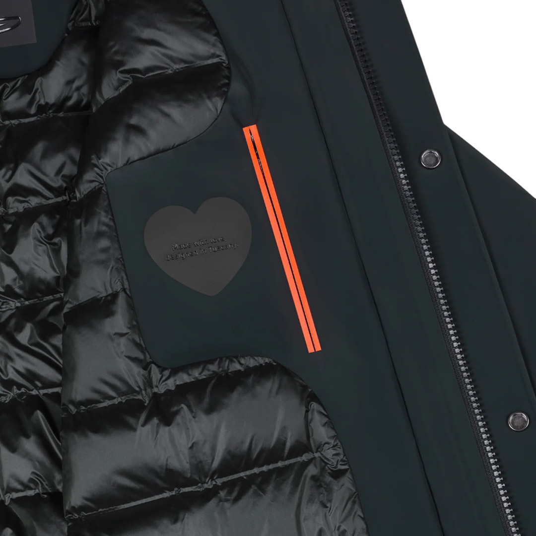 This high-tech reinterpretation of the parka design reveals a unique and surprising winter coat, thanks to its refined construction and meticulously chosen materials. The original iridescent look of the Stratofabric#3 membrane fabric is achieved thanks to a special silicone coating. The laser-cut and heat-bonded construction makes the parka waterproof and weatherproof. Its minimalist elegance is underscored by the essential design, accentuated by the rubberized snap button flap that hides the two-way metal zipper. This zip opens to close the padded, enveloping hood, providing effective protection from wind and rain. Thermal insulation is ensured by the soft 90/10 duck down padding, contained within completely stitch-free tubular channels. Its innovative Floating Shield system features a cavity that increases comfort and allows for a straight, flawless fit. The interior features a small pocket with an invisible zipper and is highlighted by a double neon orange trim, next to the heart-shaped "Made with love, designed in Tuscany" tag. The black micro-injected logo on the left sleeve completes the parka with an iconic touch.