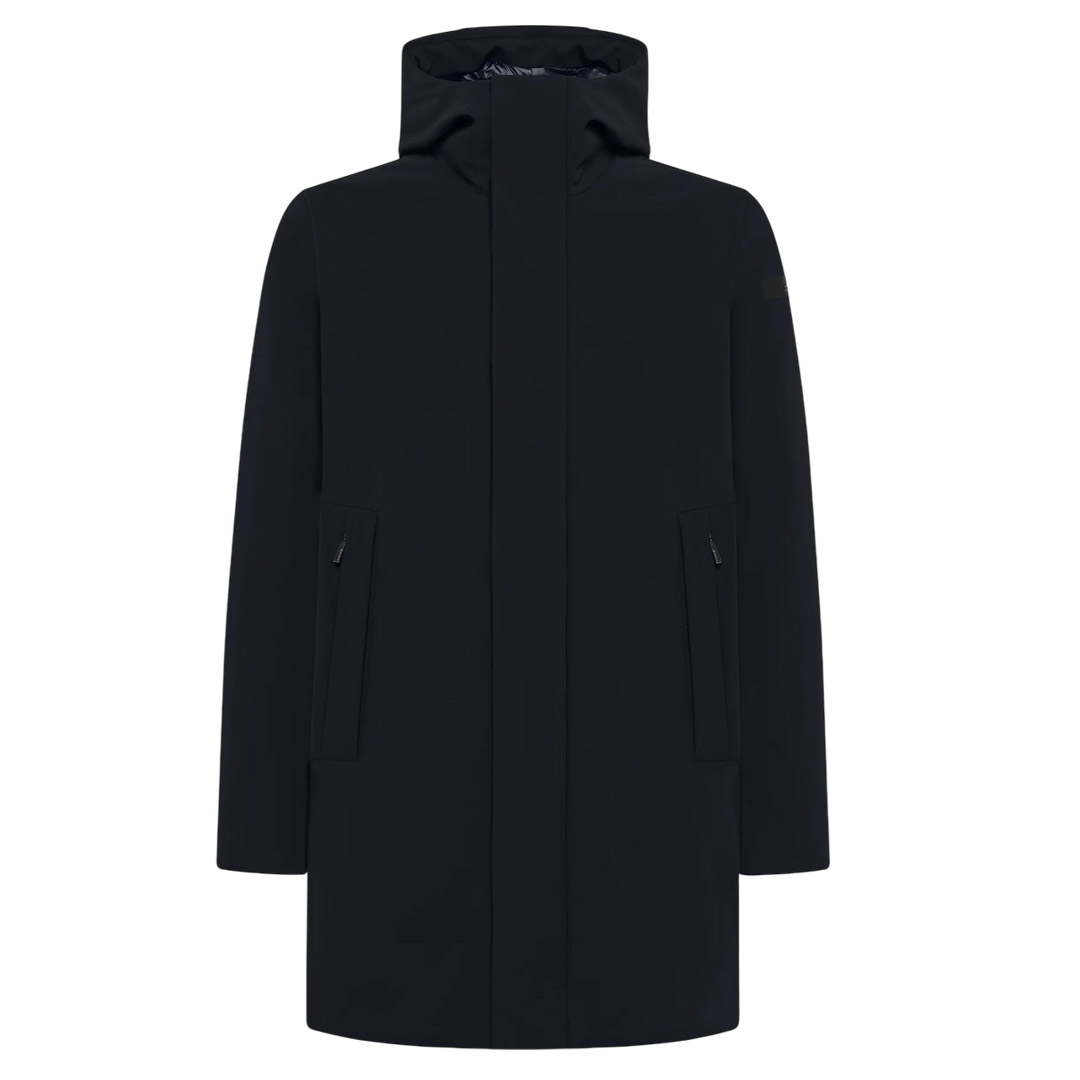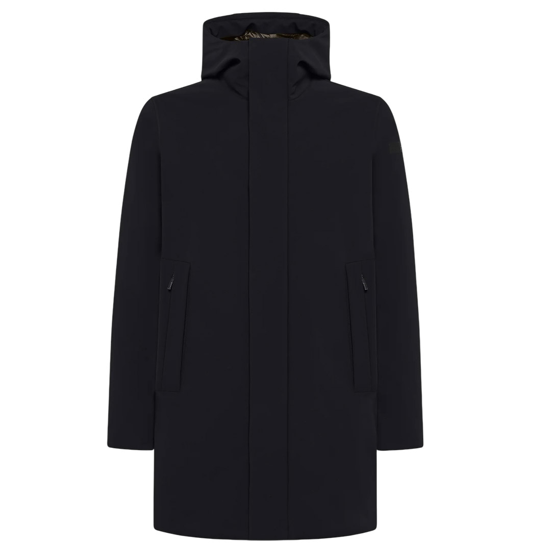 The timeless parka design transforms into a luxurious, high-tech, and minimalist outerwear piece, guaranteeing superior protection from the cold and harsh weather. This lightweight and comfortable model features a fixed, padded hood and is constructed from waterproof and breathable Stratofabric #3 membrane fabric. The ultra-matte look of the exterior, made from the exclusive SURFLEX® stretch fabric, enhances the sharpness of the design. The metal-buttoned flap conceals the two-way zipper closure, flanked by practical side pockets with invisible zippers. Warmth is ensured by the soft and lightweight 90/10 duck down padding, contained in tubular channels that prevent material from escaping. The interior features two internal pockets. The black micro-injected logo on the left sleeve adds an iconic touch to the outerwear piece.
