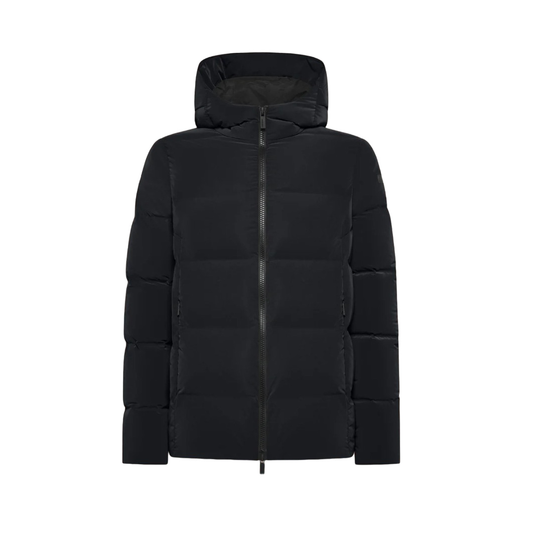 The regular-fit, medium-length down jacket stands out for its ultra-light, silicone-coated outer fabric, which enhances its resistance to atmospheric agents and its pleasant sensation to the touch. The minimalism and cleanliness of the design are emphasized by the oversized heat-sealed tubular channels. The absence of stitching emphasizes the continuity of the texture and prevents the 90/10 duck down padding from escaping, which is ultra-light and super warm, natural and sustainable. The padded hood effectively protects and warms the garment. Attention to detail is revealed in the double-slider heat-taped zip fastening on the front, flanked by invisible zip pockets; and in the interior featuring a practical zip pocket, embellished with double fluorescent orange piping and the heart-shaped "Made with love, designed in Tuscany" tag. The black micro-injection logo adds a further distinctive note to the left sleeve.