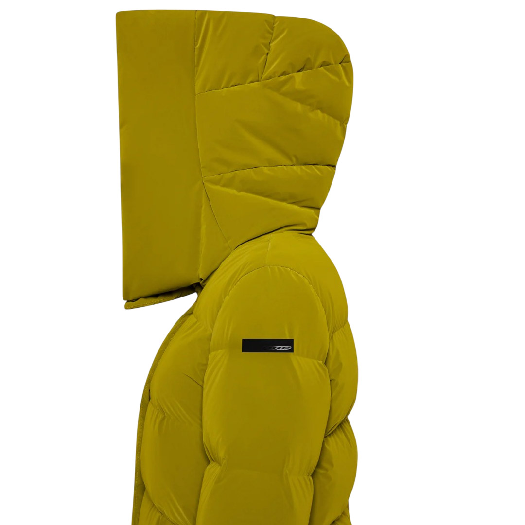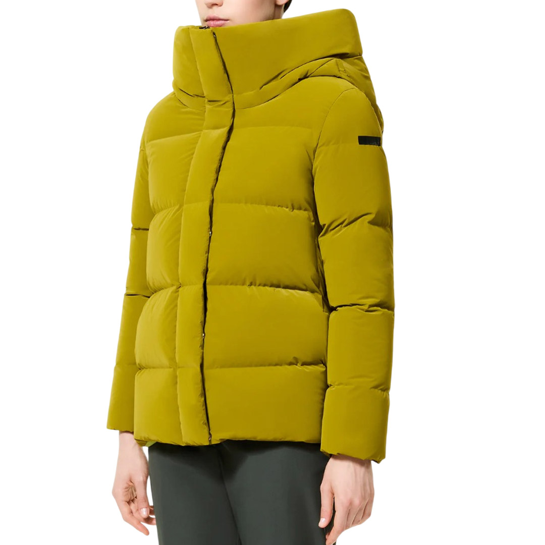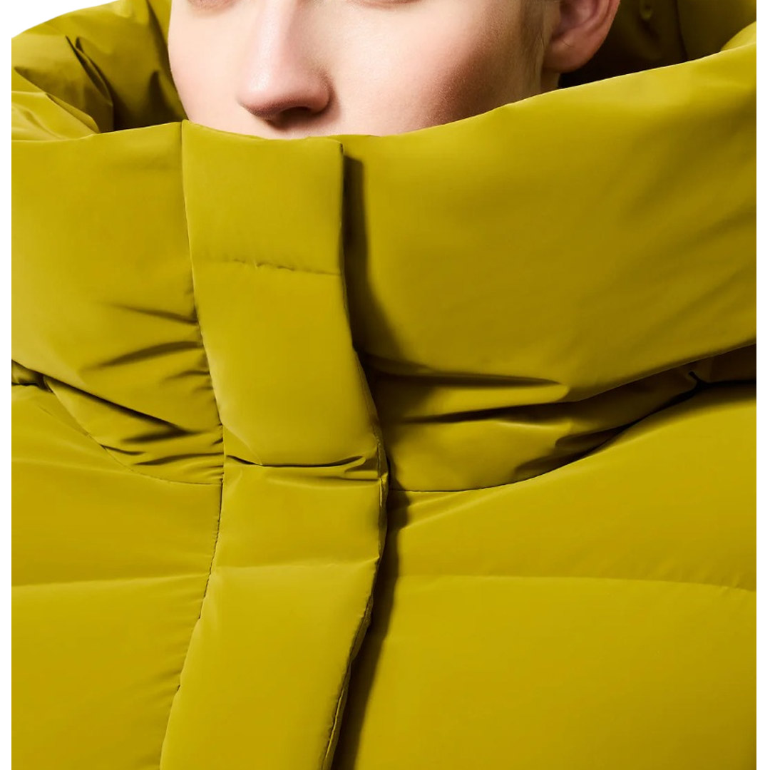 A modern and dynamic reinterpretation of a winter wardrobe classic, this boxy fit and cocoon-like design define this waist-length down jacket, embellished with a large, enveloping hood. The delicately iridescent finish of the silicone-coated fabric and its soft feel lend a touch of comfort and originality to the large, heat-sealed tubular channels that contain the particularly warm and soft 90% duck down padding. The down jacket's streamlined look is accentuated by the snap-button placket, which conceals the heat-sealed zipper, flanked by spacious, invisible side pockets. The black micro-injected logo on the left sleeve completes this piece, which pairs perfectly with a masculine-cut shirt and carrot pants for a vibrant, contemporary look.