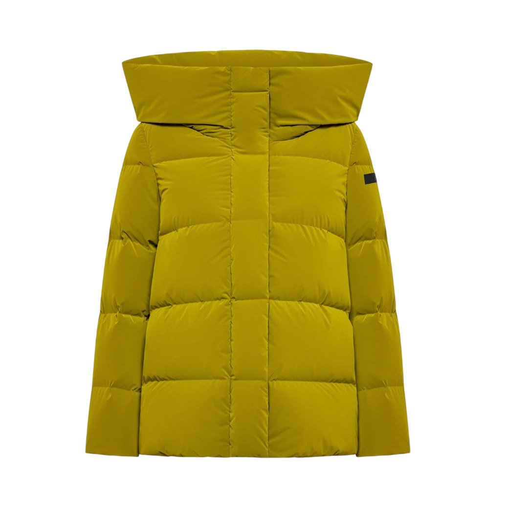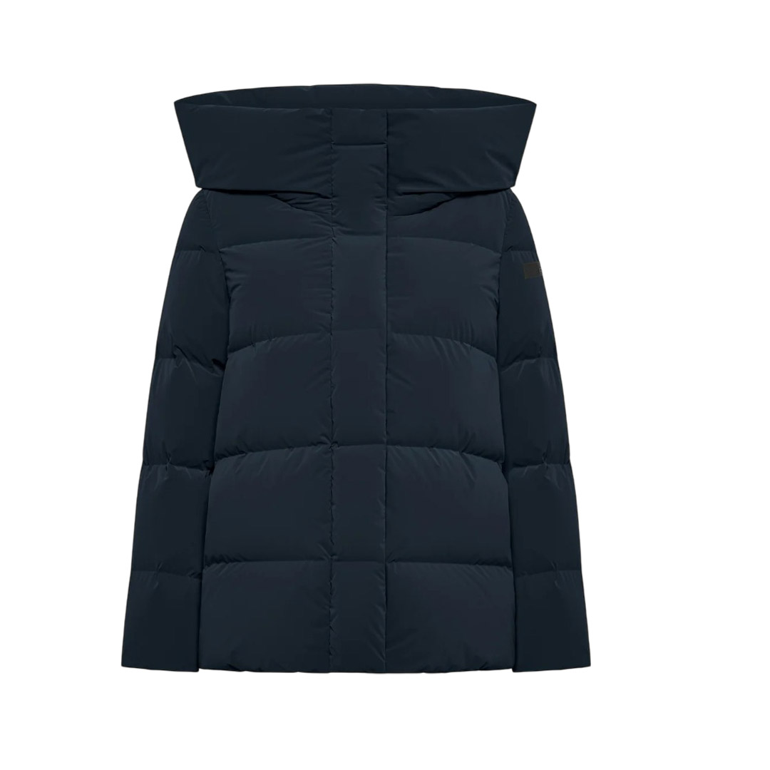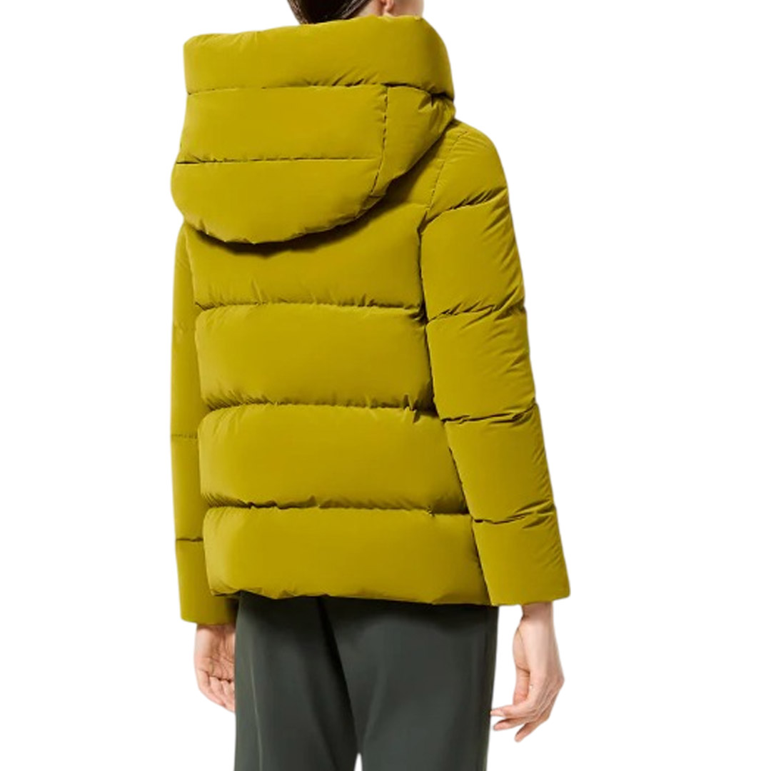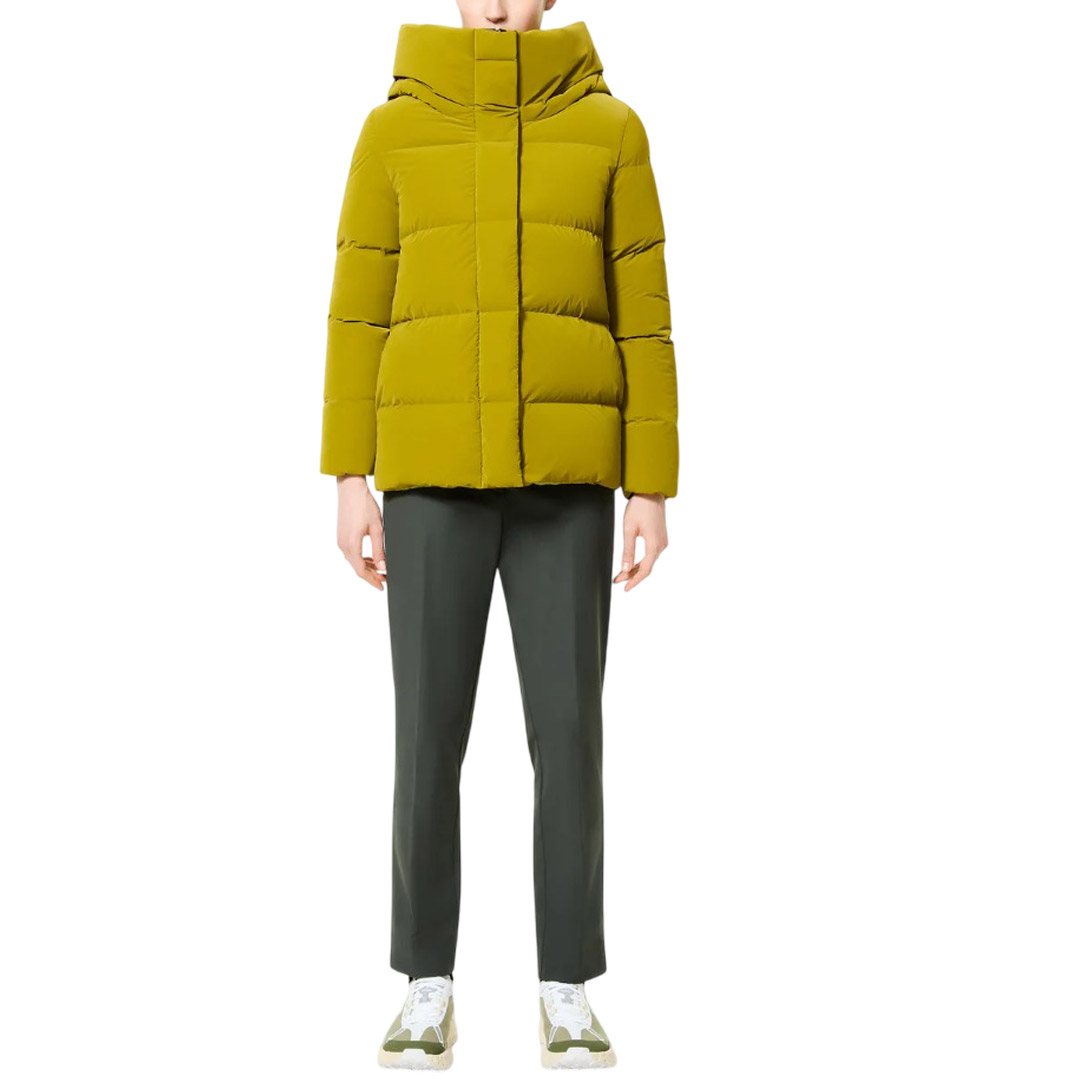 A modern and dynamic reinterpretation of a winter wardrobe classic, this boxy fit and cocoon-like design define this waist-length down jacket, embellished with a large, enveloping hood. The delicately iridescent finish of the silicone-coated fabric and its soft feel lend a touch of comfort and originality to the large, heat-sealed tubular channels that contain the particularly warm and soft 90% duck down padding. The down jacket's streamlined look is accentuated by the snap-button placket, which conceals the heat-sealed zipper, flanked by spacious, invisible side pockets. The black micro-injected logo on the left sleeve completes this piece, which pairs perfectly with a masculine-cut shirt and carrot pants for a vibrant, contemporary look.