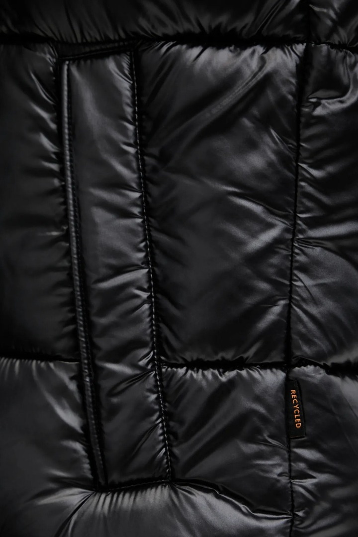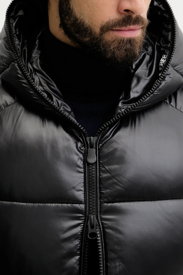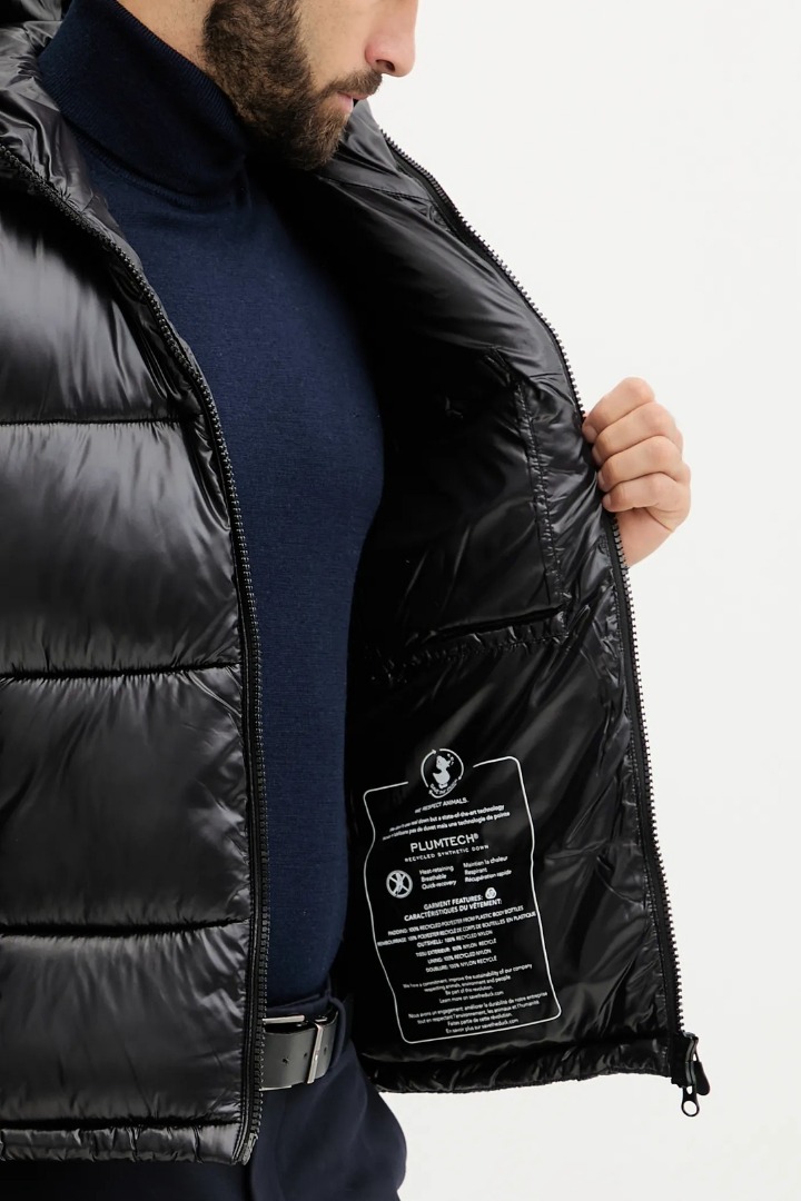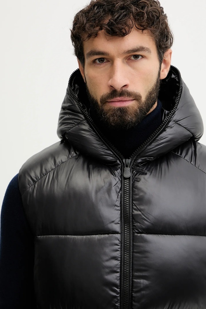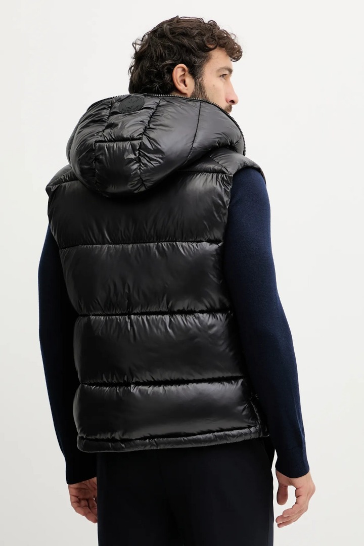 Men's nylon vest, regular quilted with hood, side pockets and logo patch applied on the hood, lined interior with detail and full zip closure on the garment including at the tip of the hood