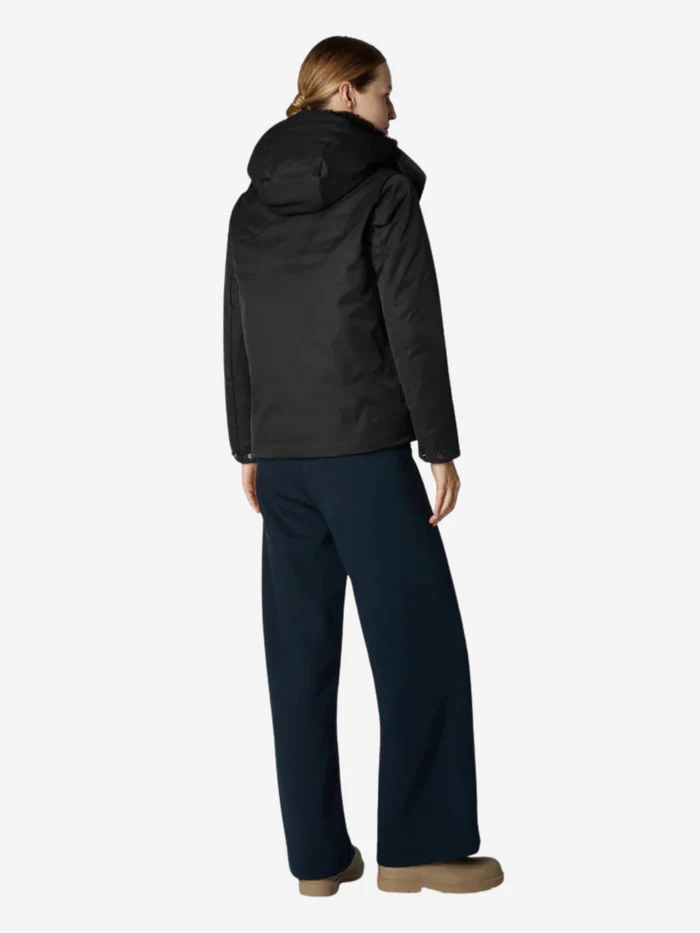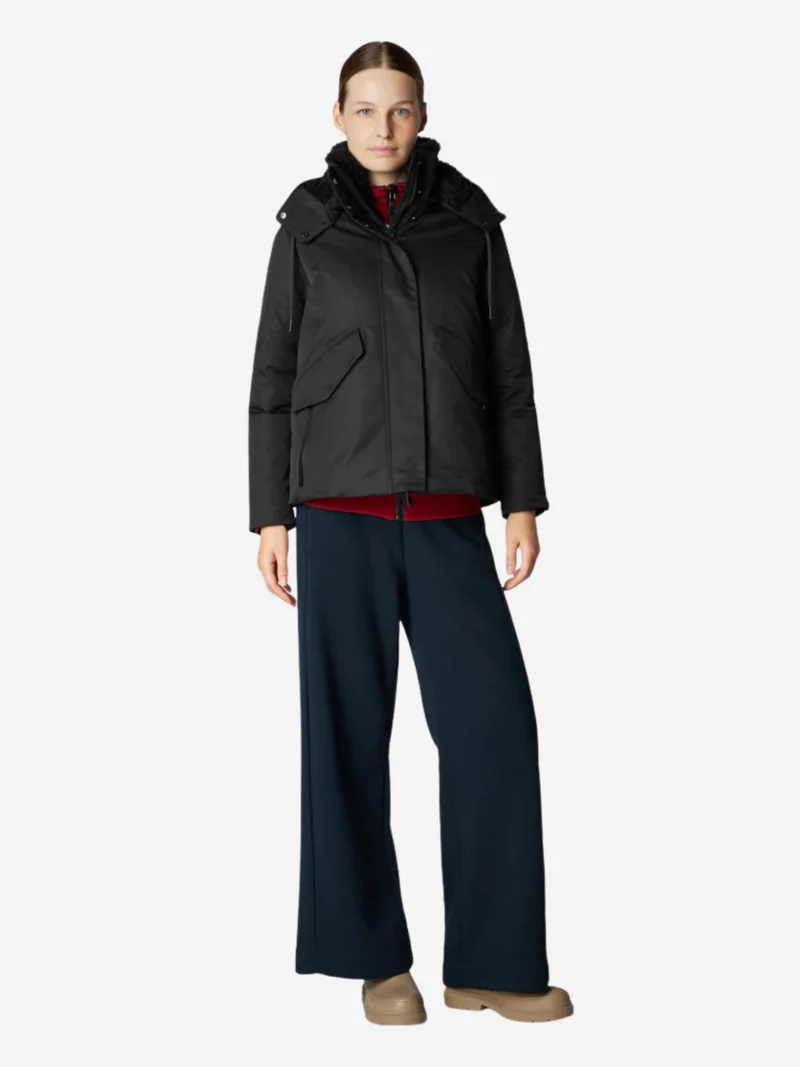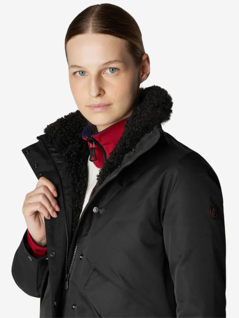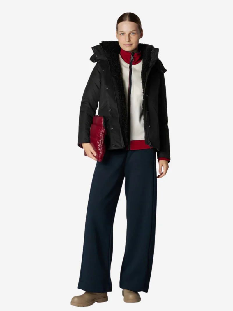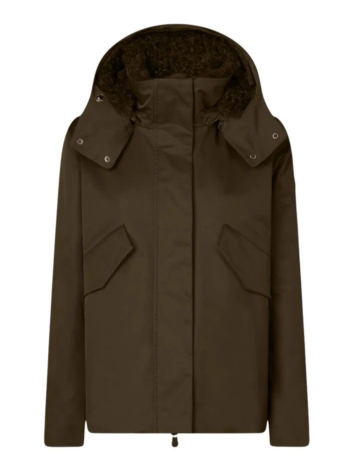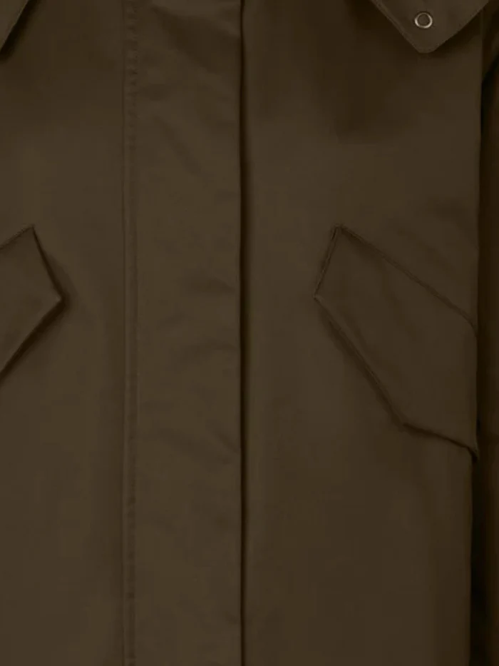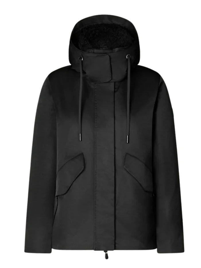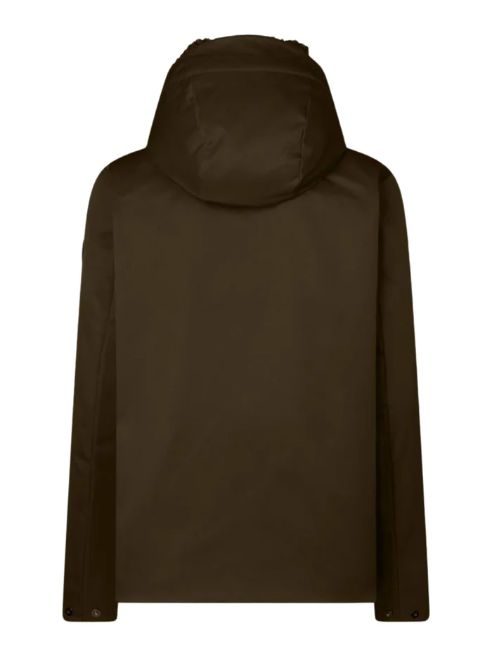 Midweight, non-stretch technical twill jacket Water-repellent and wind-resistant Rubber logo patch on sleeve Drawstring hood with faux sherpa lining Snap-down chin guard Hooded neckline Long sleeves with snap cuffs Snap fly with hidden two-way zipper Multiple exterior pockets