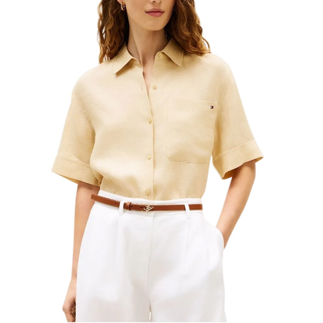 The relaxed fit, short-sleeved shirt in pure linen, with the iconic embroidered flag, is yarn-dyed for added durability • Pure linen • Yarn-dyed • Semi-spread collar • Patch pocket on the chest • Centre back pleat • Signature tape on the side • Tommy Hilfiger branding • Tommy Hilfiger flag embroidered on the pocket