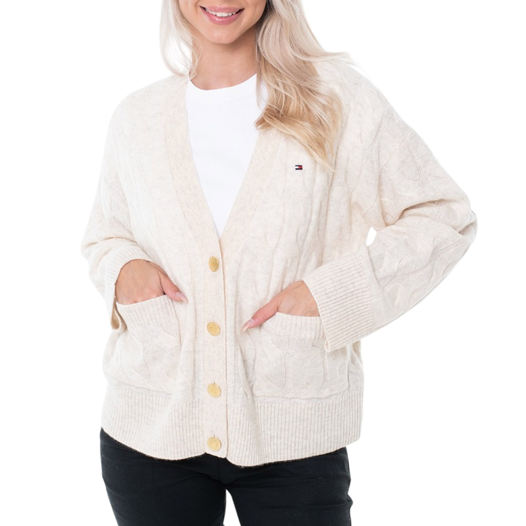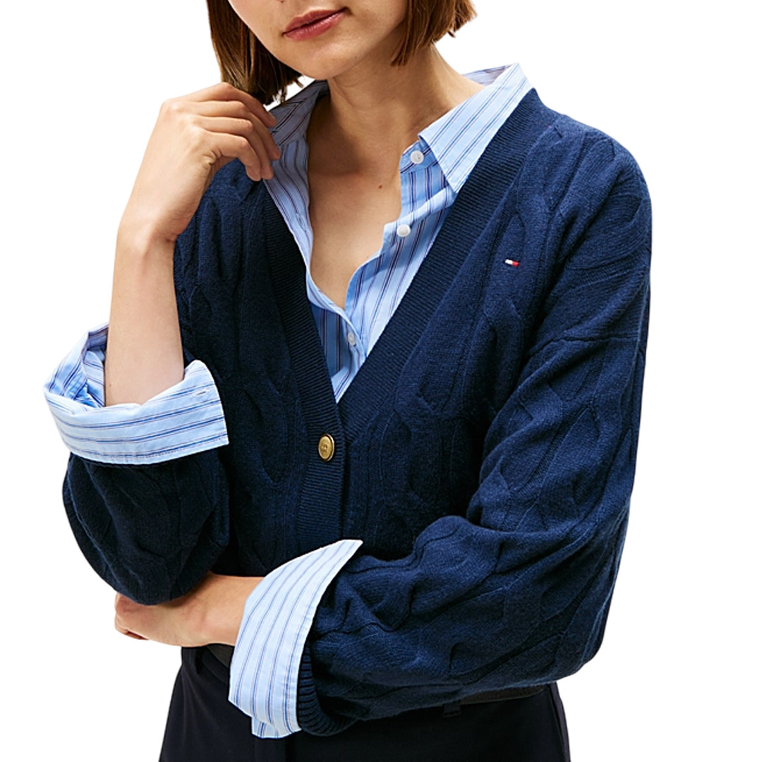 This timeless cardigan, crafted from a super-soft pure wool knit, has an oversized fit that's perfect for layering. • Pure wool • All-over knit • Gold buttons • V-neck • Button closure • Two front patch pockets • Ribbed collar, placket, cuffs, and hem • Embossed Tommy Hilfiger flag on the buttons • Tommy Hilfiger branding • Tommy Hilfiger flag embroidered on the chest • Oversized fit • Dropped shoulders