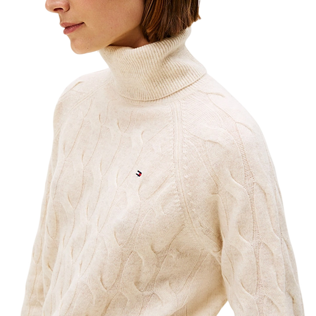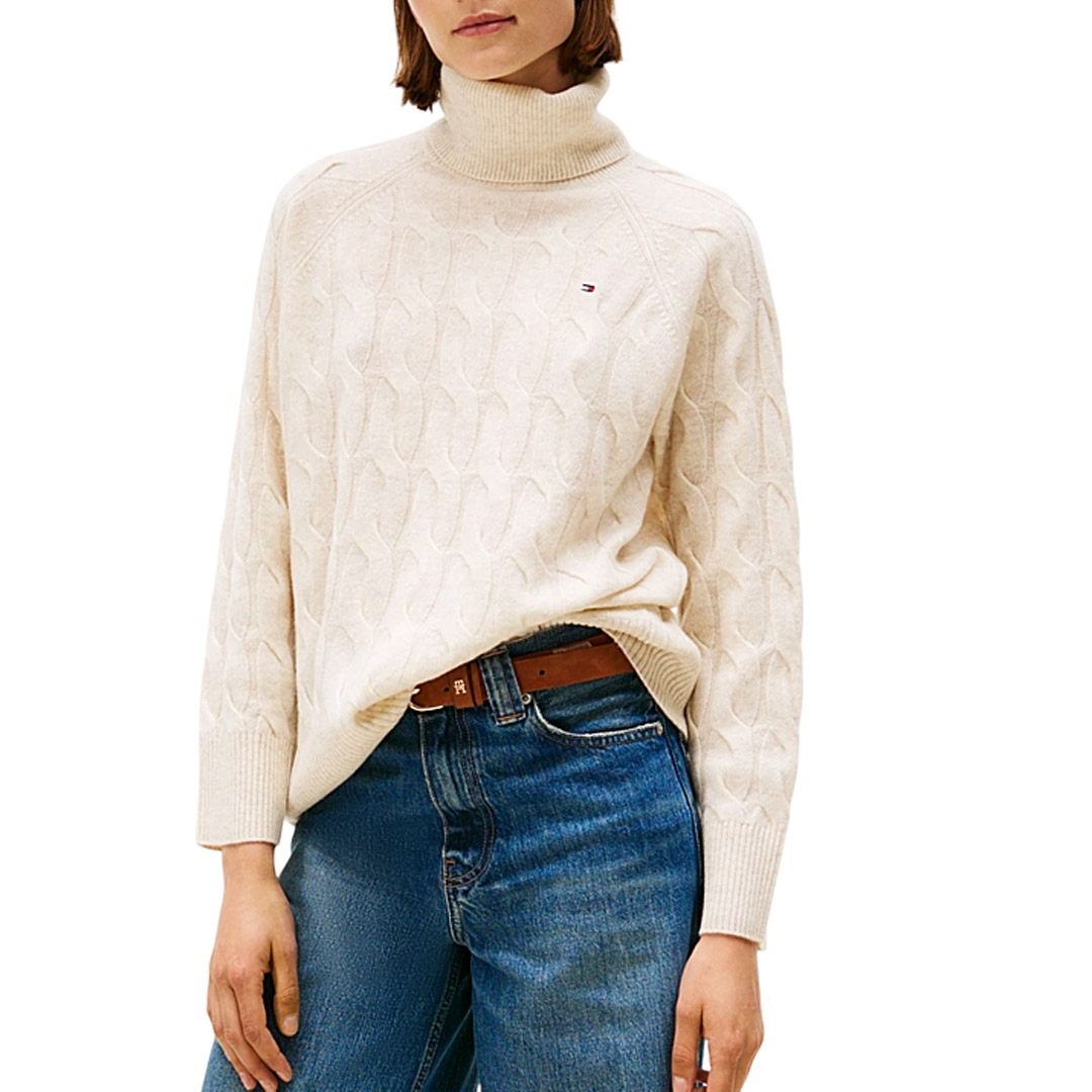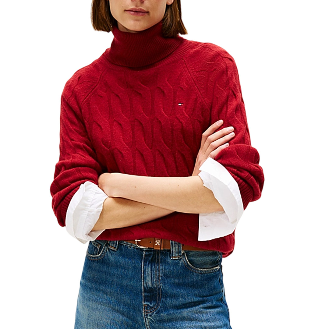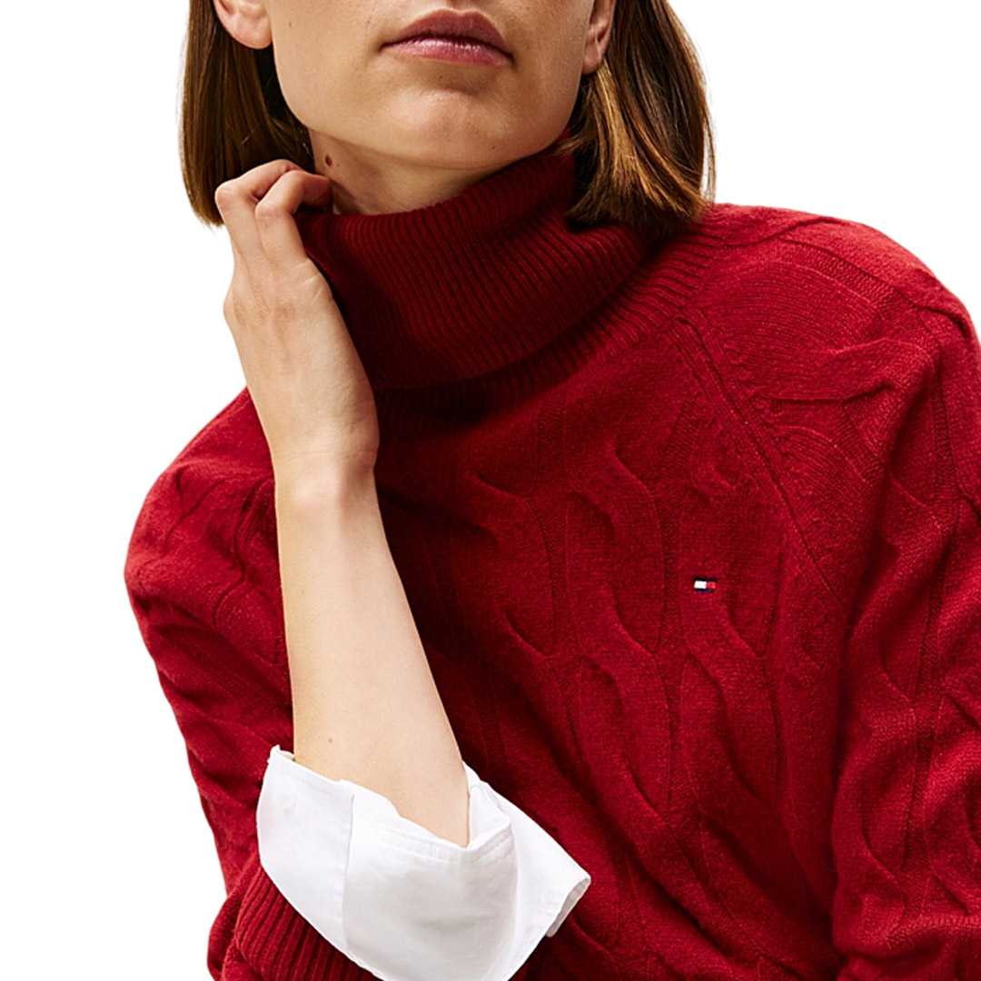 The soft pure wool turtleneck sweater features an original oversized woven design for a modern and unmistakable style. • Pure wool • Woven knit • Turtleneck • Ribbed collar, cuffs, and hem • Tommy Hilfiger branding • Tommy Hilfiger flag embroidered on the chest • Relaxed fit • Raglan sleeves
