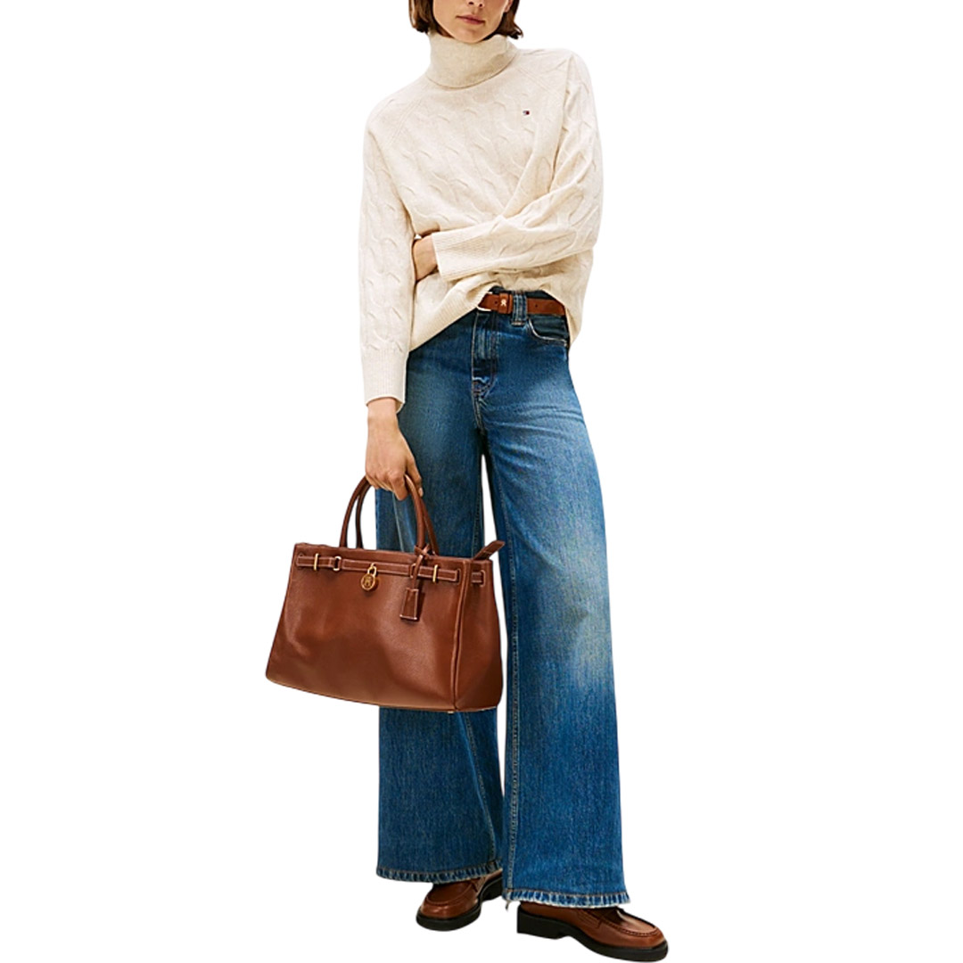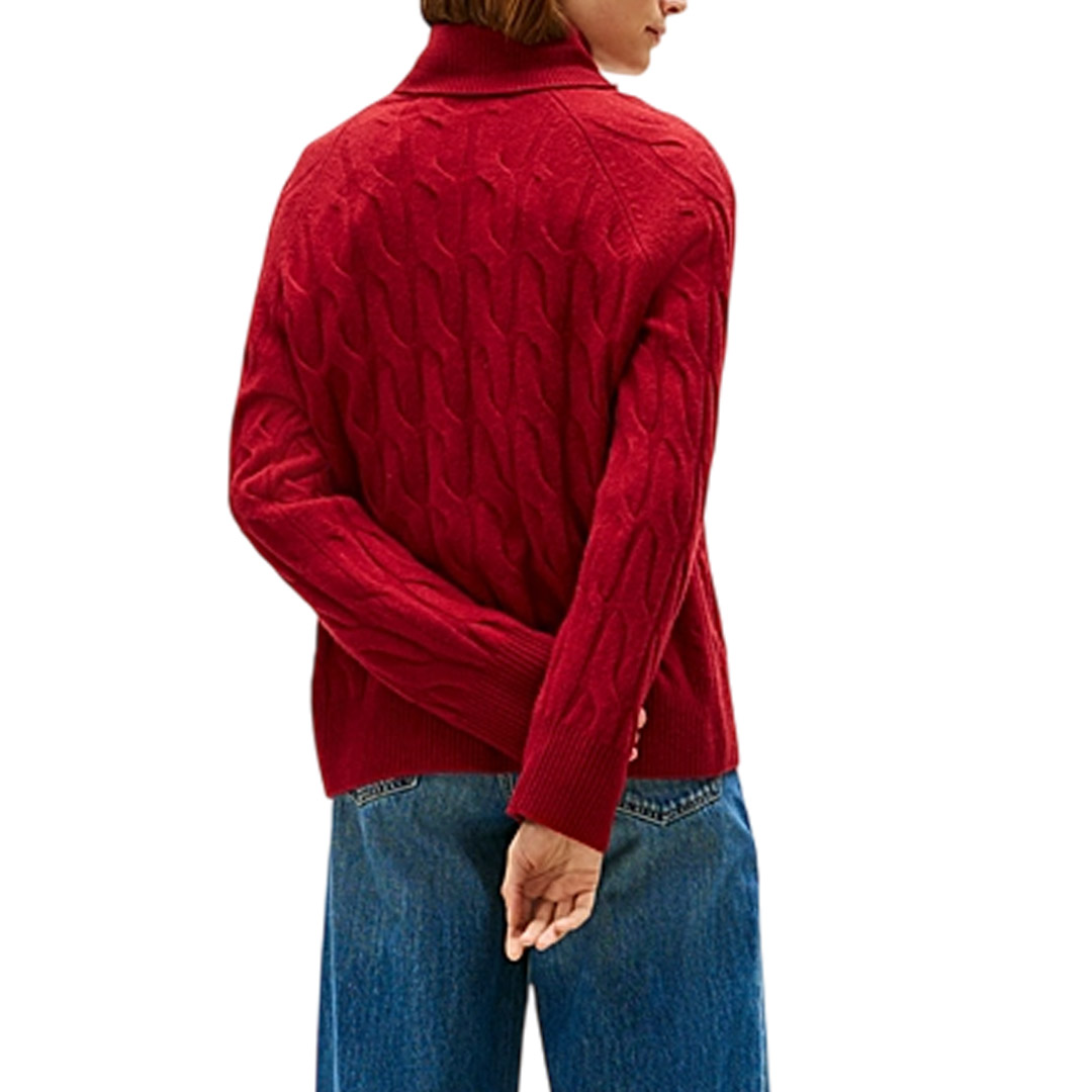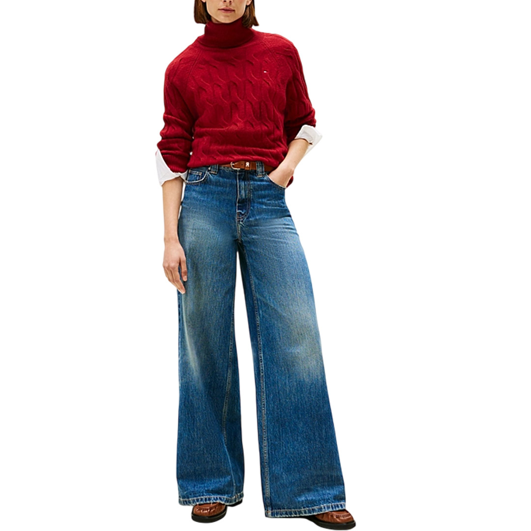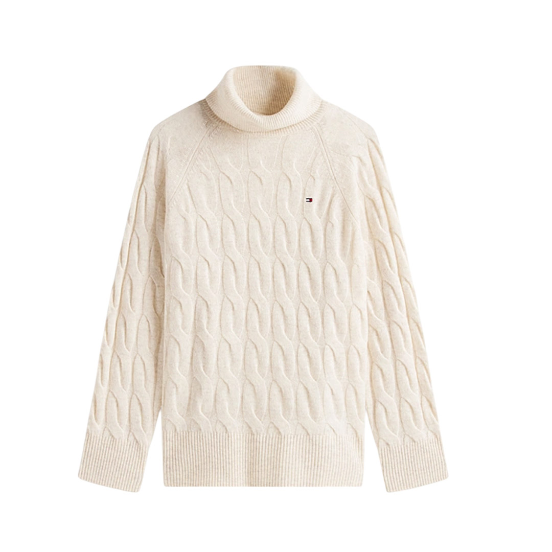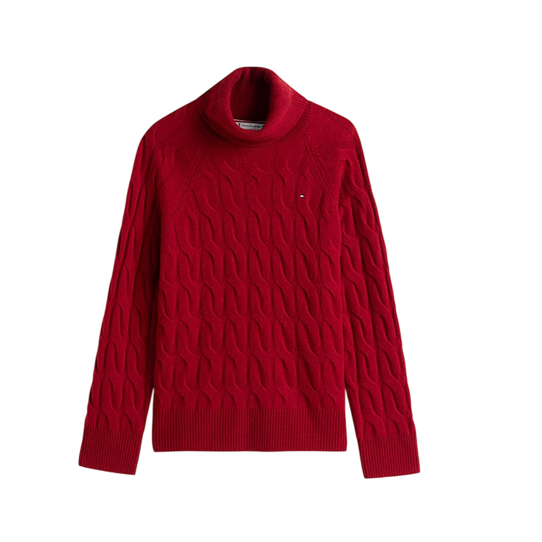 The soft pure wool turtleneck sweater features an original oversized woven design for a modern and unmistakable style. • Pure wool • Woven knit • Turtleneck • Ribbed collar, cuffs, and hem • Tommy Hilfiger branding • Tommy Hilfiger flag embroidered on the chest • Relaxed fit • Raglan sleeves