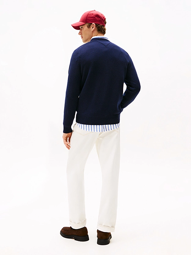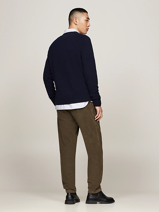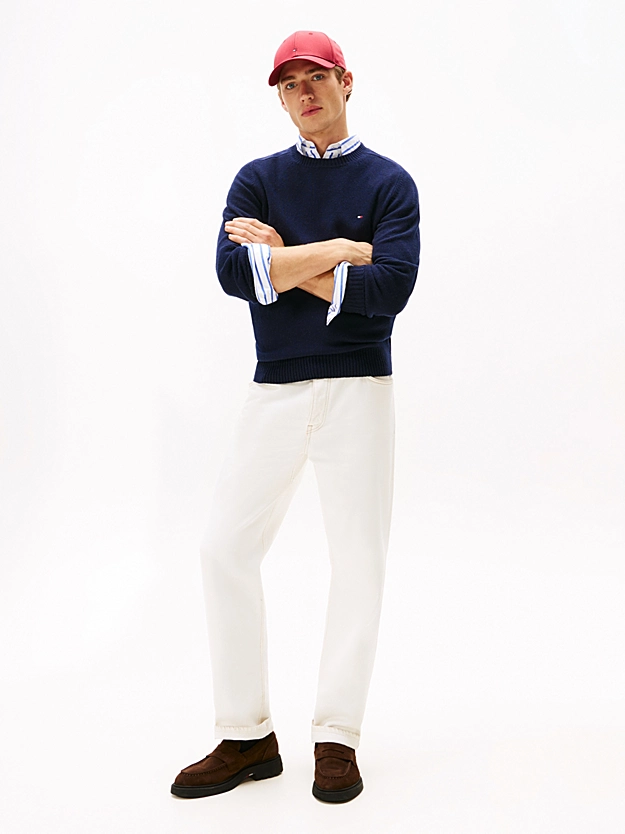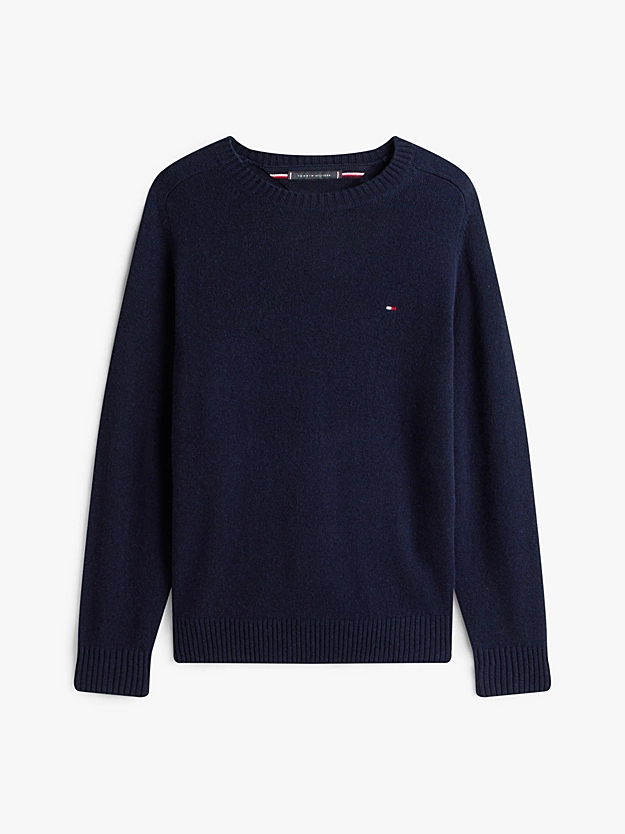 Soft pure wool fabric adds a luxurious touch to the classic silhouette of this comfortable round neck sweater. Key Features • Pure wool • Crew neck • Ribbed collar, cuffs and hem • Signature tape inside neckline • Tommy Hilfiger branding • Tommy Hilfiger flag embroidered on chest Style & Fit • Regular fit