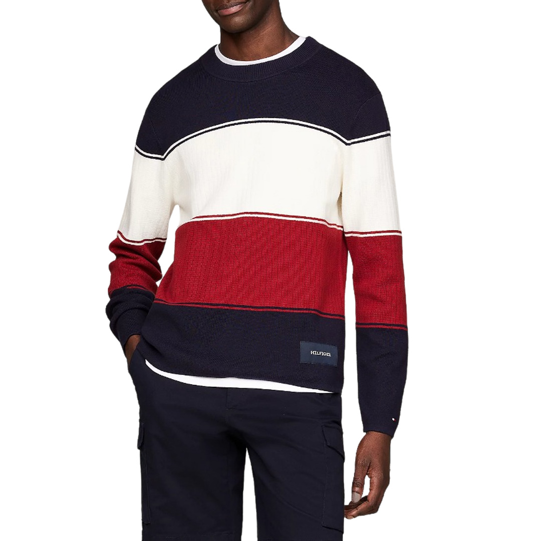 The timeless plain and ribbed knit pullover features the timeless color block pattern, ideal for adding an iconic touch to your layering looks. • Pure organic cotton • Color block pattern • Mixed knits • Crew neck • Ribbed collar • One-piece Hilfiger logo patch on the hem • Tommy Hilfiger branding • Tommy Hilfiger flag embroidered on the cuff • Relaxed fit • Slightly dropped shoulders