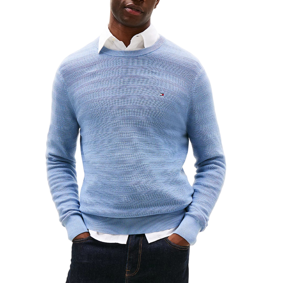 The sweater is made of pure cotton knit with a striped pattern in different directions and a unique texture, for an original reinterpretation of the classic round neckline model. Main features • Pure cotton • All-over textured stripes • Crew neck • Ribbed collar, cuffs and hem • Tommy Hilfiger branding • Tommy Hilfiger flag embroidered on the chest
