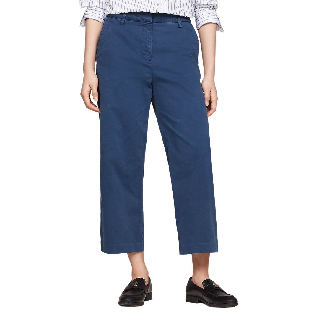 Stretch cotton chinos feature a figure-flattering straight fit and modern ankle length. • Stretch cotton • Zip and concealed hook fastening • Two side welt pockets • Two back flap pockets • Tommy Hilfiger branding • Tommy Hilfiger flag embroidered on back • Relaxed fit • Straight fit