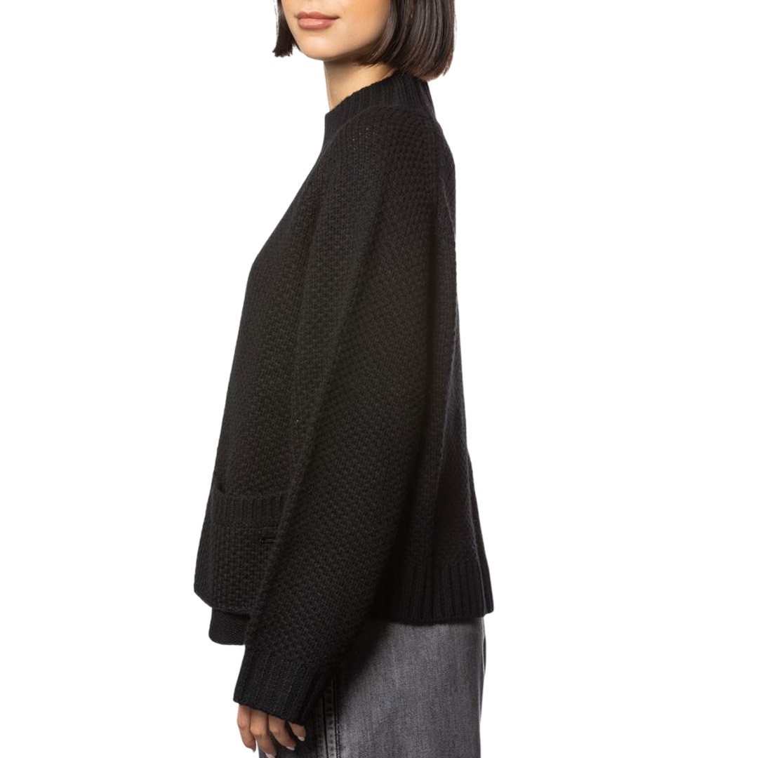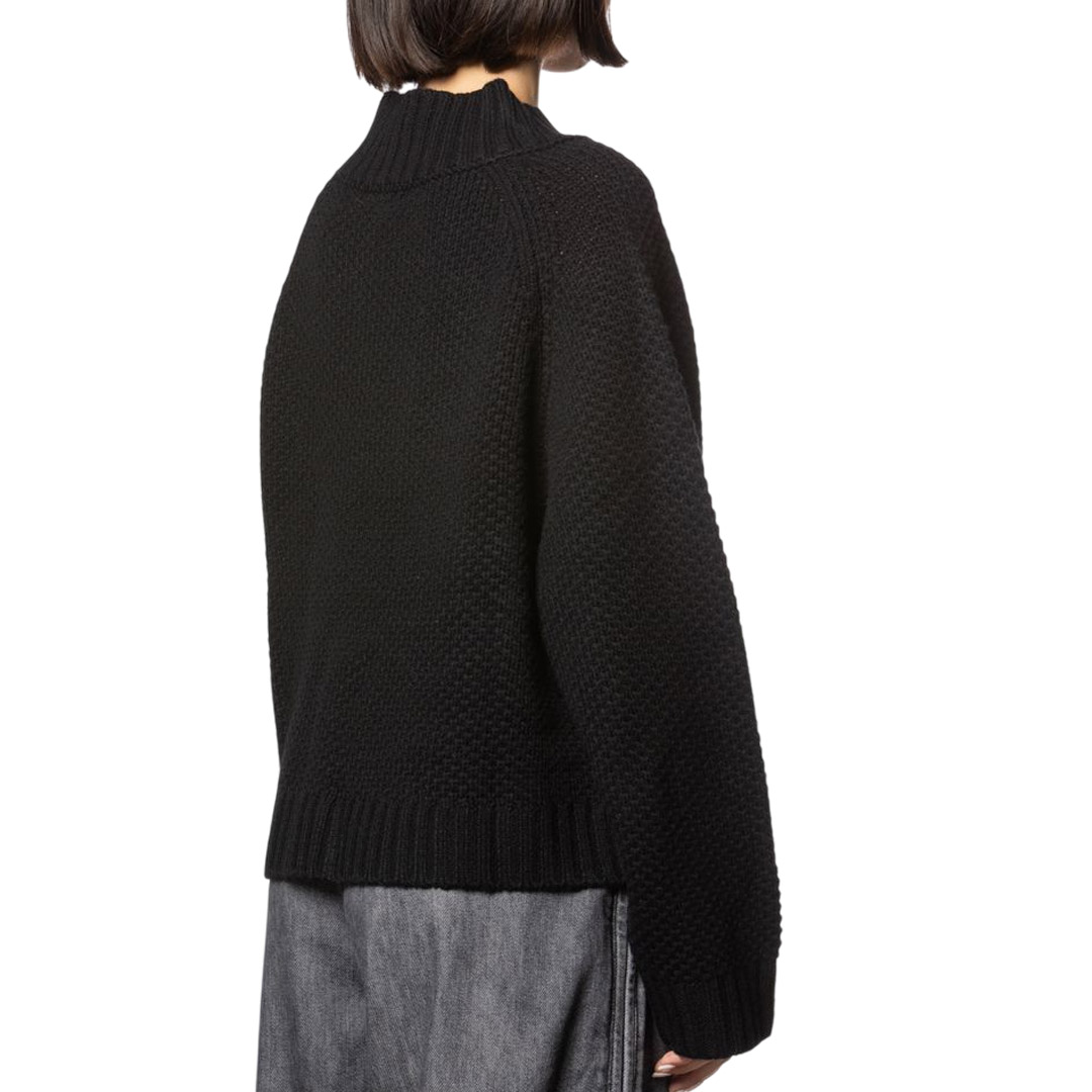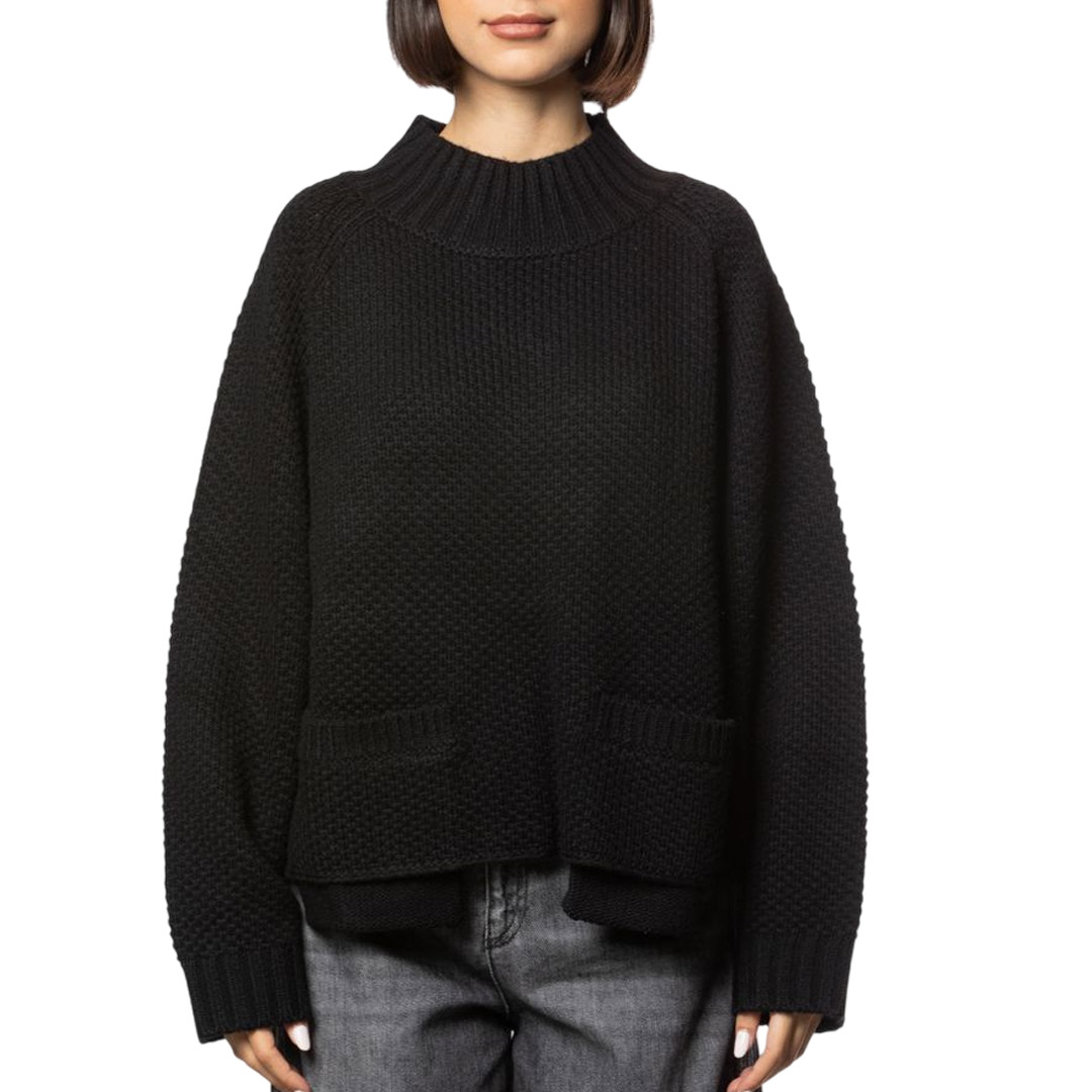 High neck sweater with raglan sleeves. Front pockets with visible pocket.