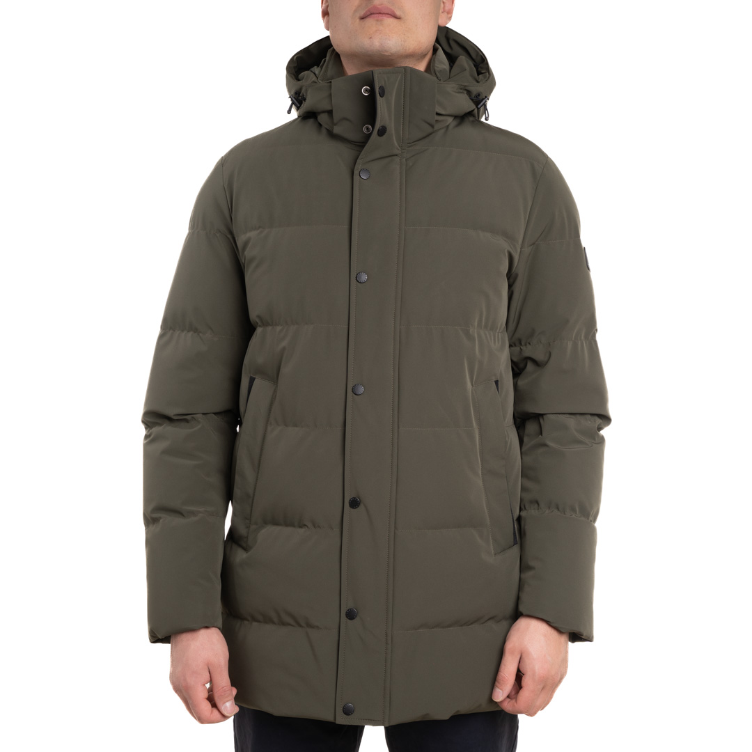Real down nylon jacket. The bomber color, the bottom and the cuffs are finished in contrasting colors. The brand's circular logo on the chest is the dot. Inside it is packed with good quality feathers and feathers, and the warmth is exceptional. The front is a specific double zip that can be organized with two sliders. In addition to jeans, we also recommend street taste coordination combined with jogging pants.