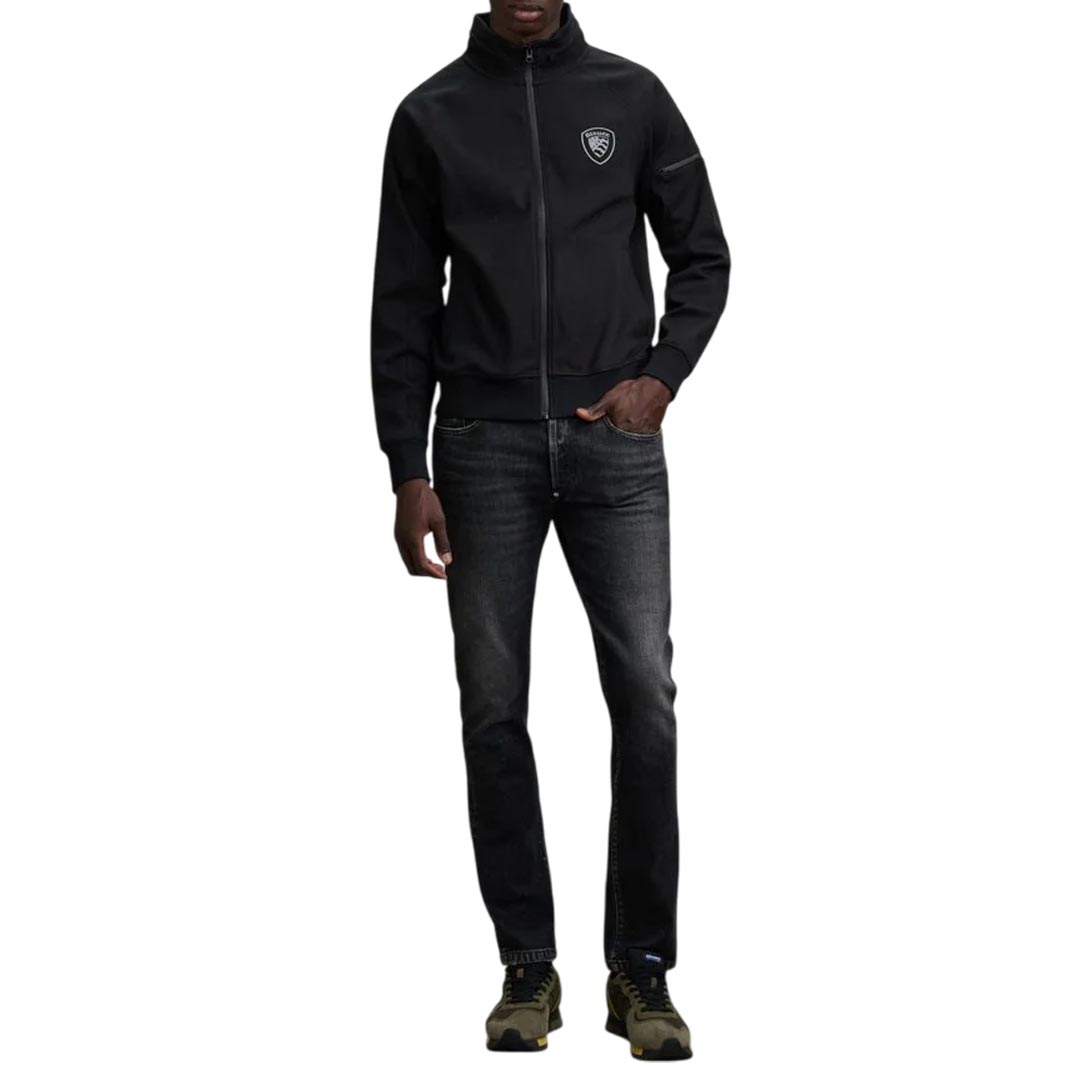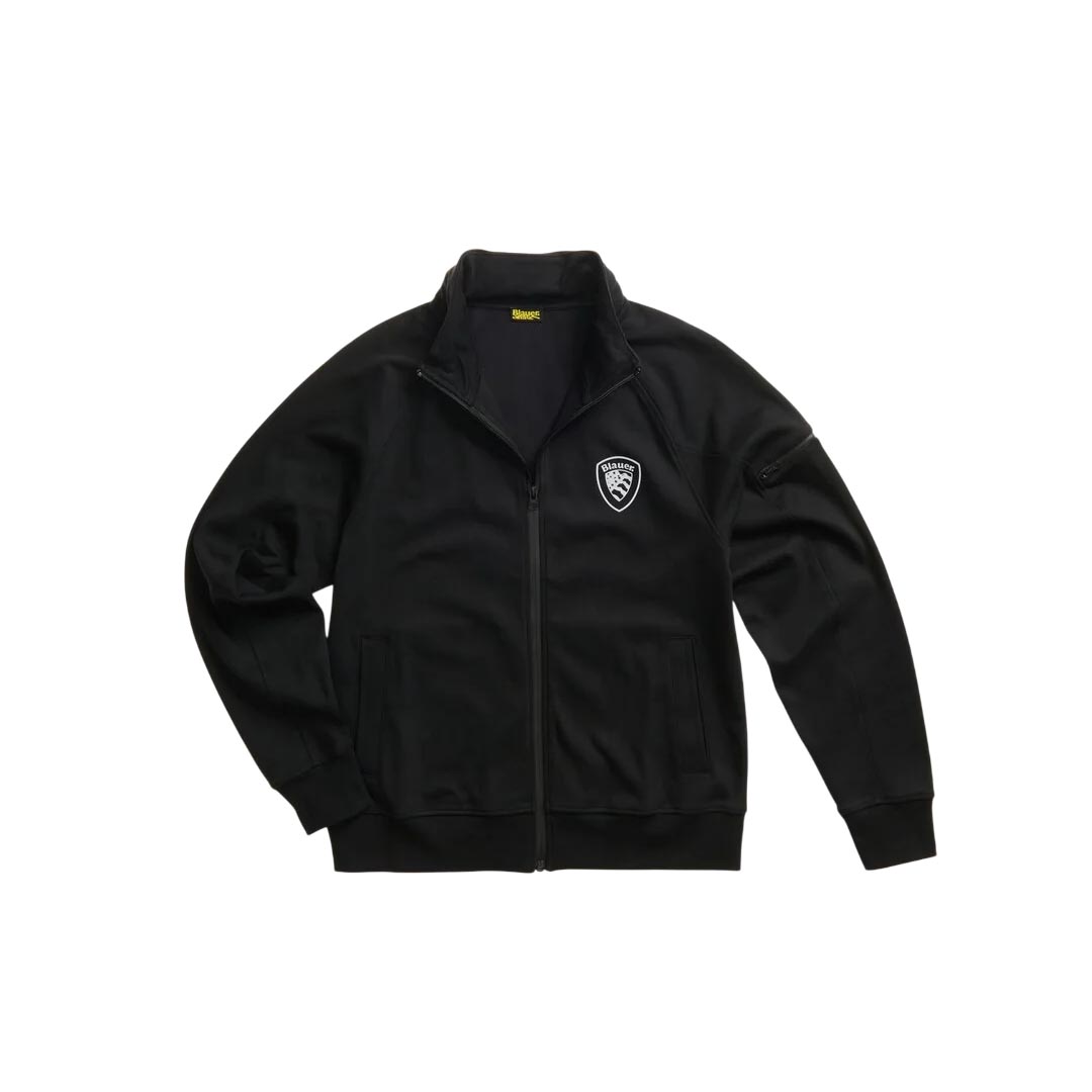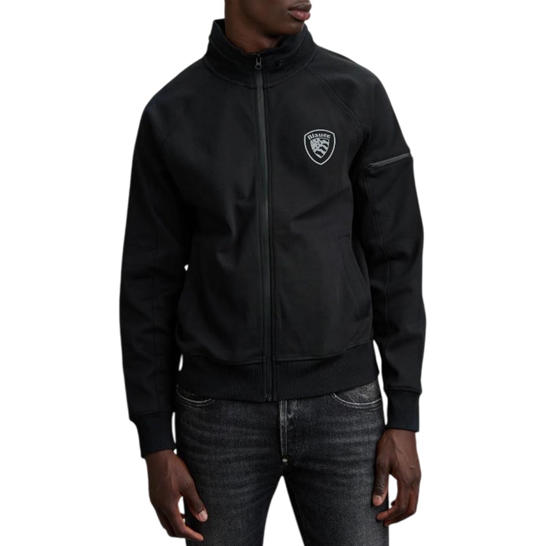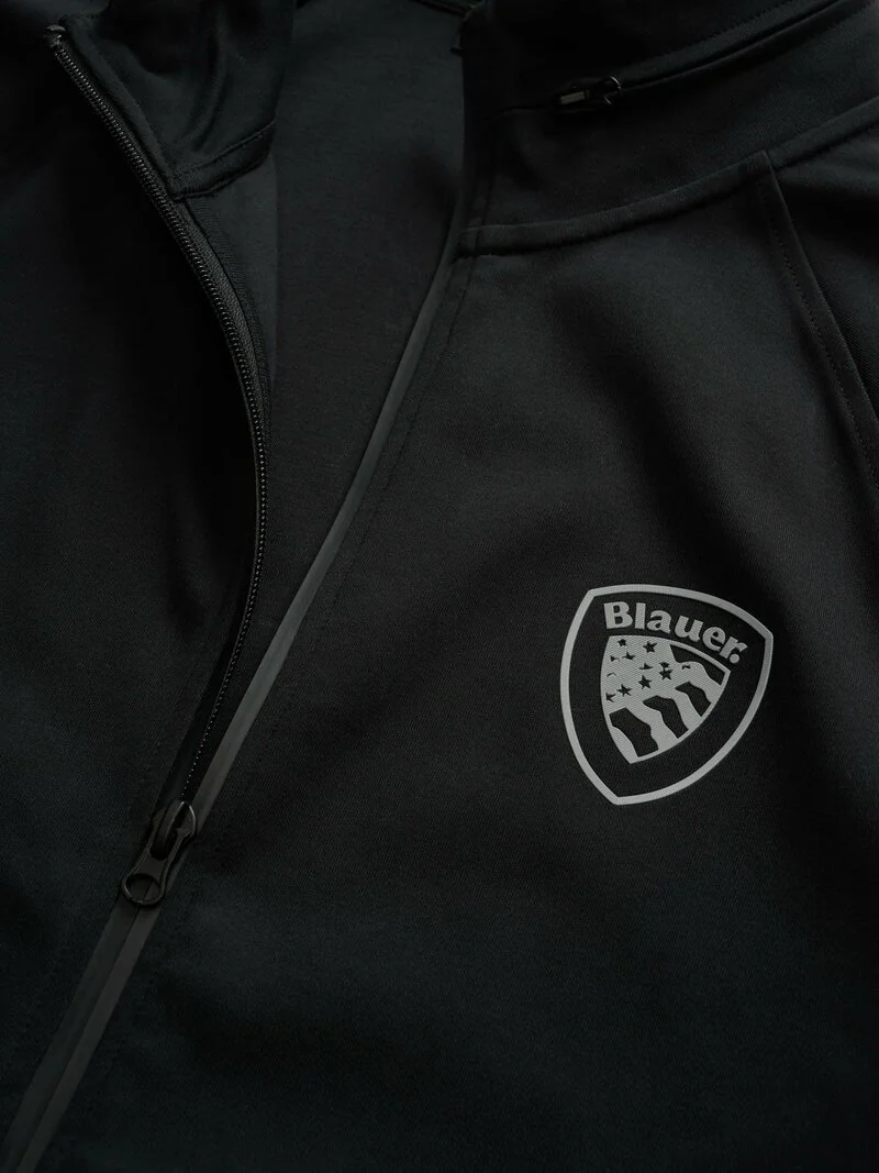 Zip-up sweatshirt with rubberized, reflective Blauer logo on the chest. Nylon hood hidden in the collar. Zip pocket with logo on the sleeve. • Long raglan sleeves • Coated zip on the front • Warm, soft fabric • Ribbed hem • Ribbed cuffs • Two front pockets • Rubberized logo