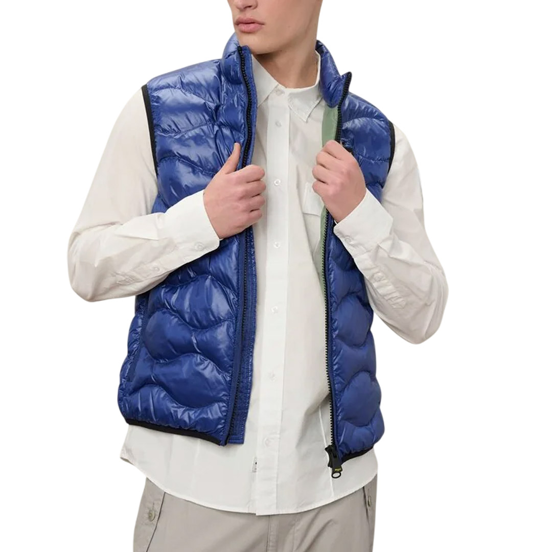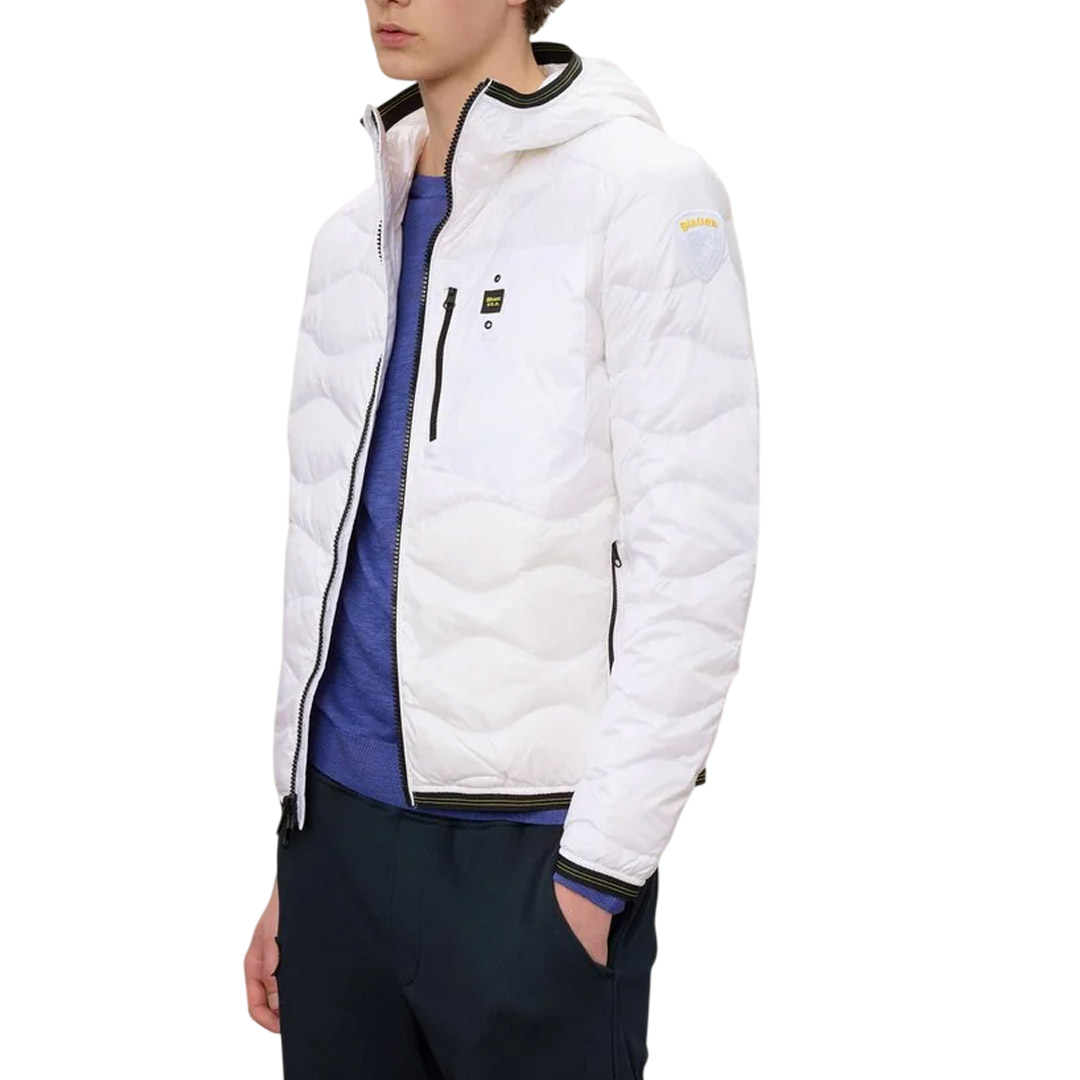 Cool and breathable poplin cotton jacket, unlined with contrasting color interior. Hood with drawstring and peak, removable via zip. Hidden central closure with double slider zip on the front and internal zip guard. Two large bellows pockets on the front with double opening; one towards the sides and one under the horizontal flap; Double snap buttons with herringbone reinforcement. Two internal pockets with velcro closure. On the left sleeve another pocket with flap, snaps and reinforcement tape; sleeve bottom with tab and double automatic closure. Drawstring with elastic tubing on the bottom of the garment. Characteristic Blauer loop sewn on the left chest and Blauer shield patch on the sleeve