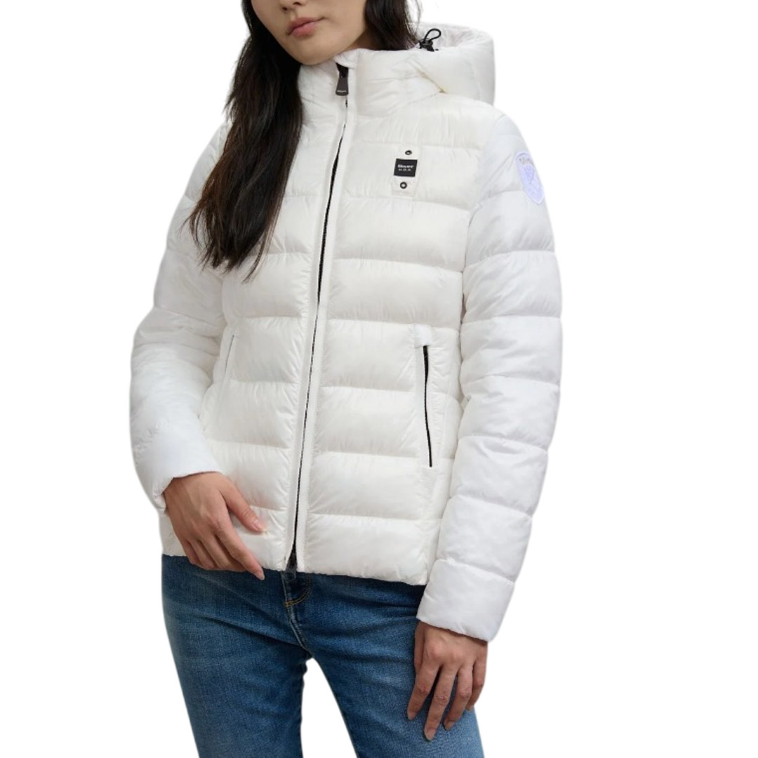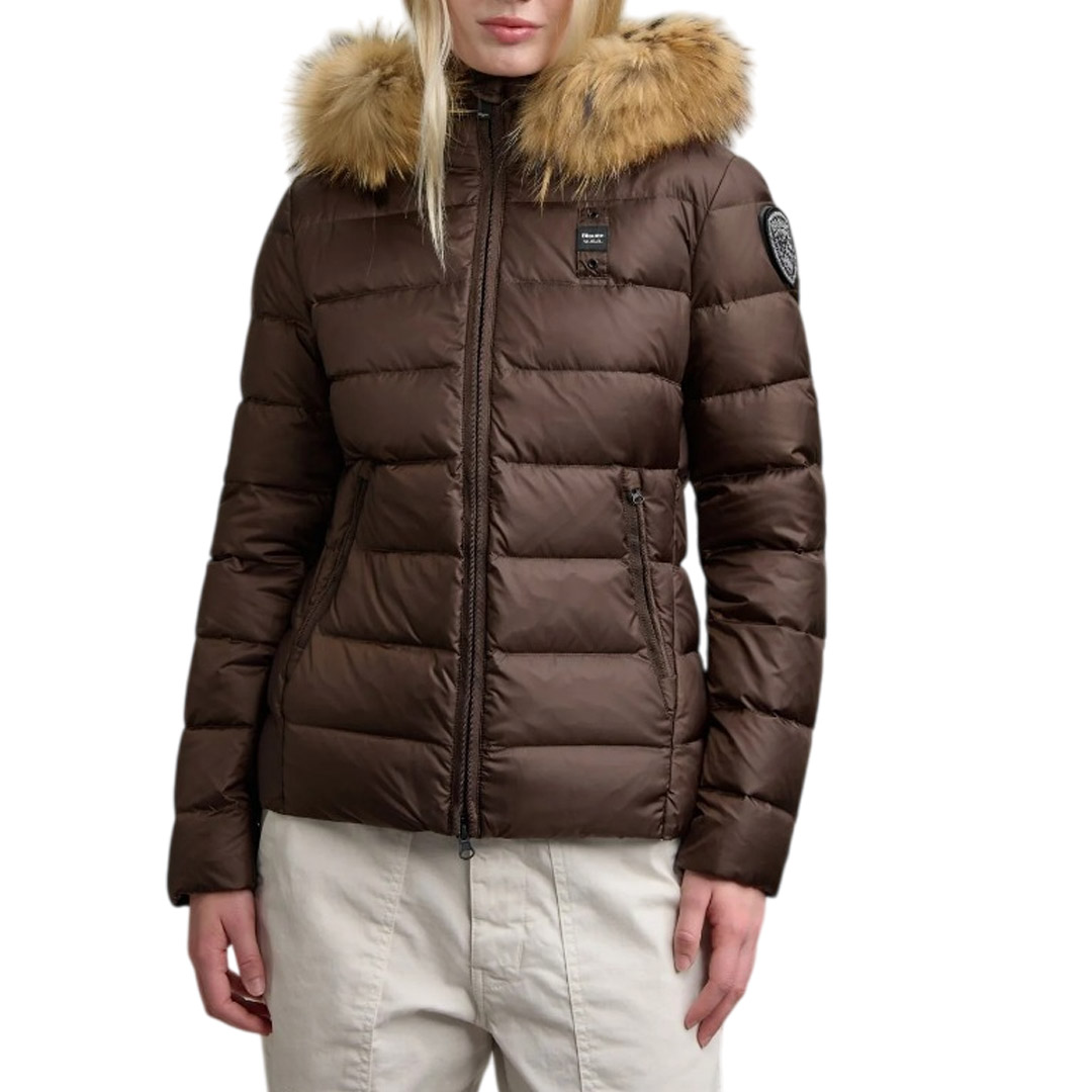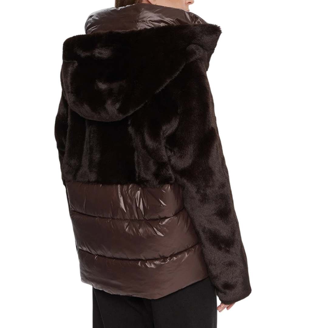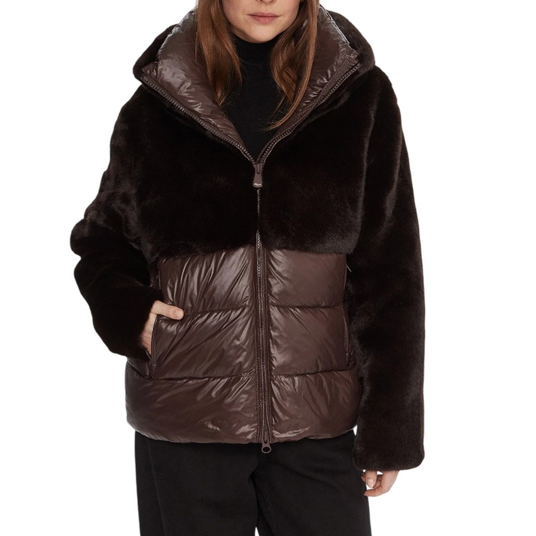 Jacket with faux fur on the upper part and shiny nylon on the lower part. Warm hood and horizontal striped stitching underneath; a garment designed to protect from the harshest winters without sacrificing style. • Fixed faux fur hood with drawstring • Made of nylon and faux fur • Lined in matching shiny nylon • Filled with Sorona® Aura wadding • Zip closure • Pockets with zip and slider cover • Double cuffs with internal elastic • Drawstring at the bottom • Internal pockets with Velcro