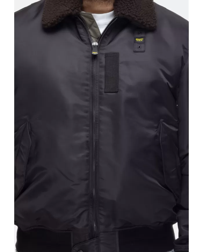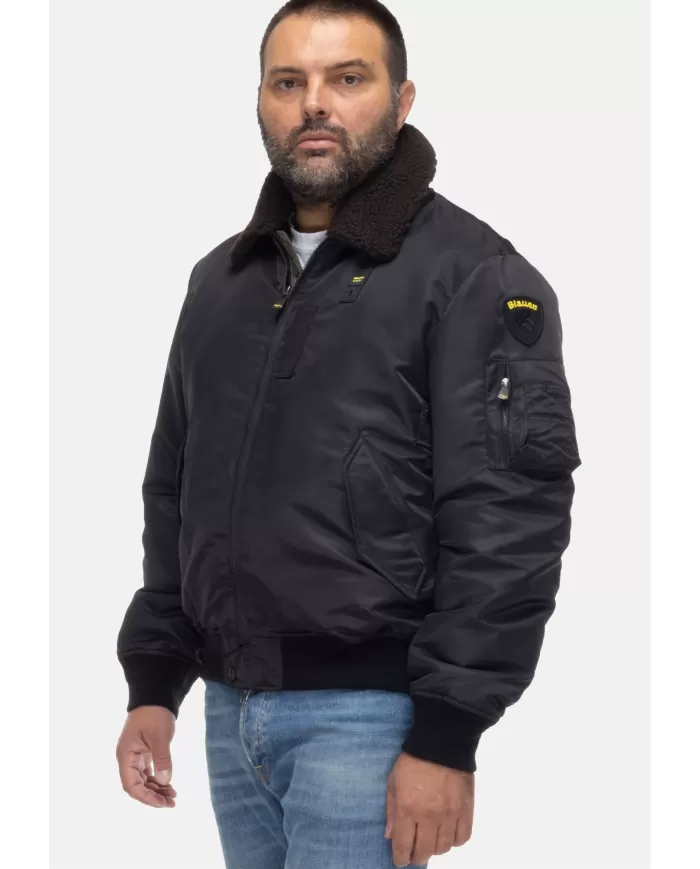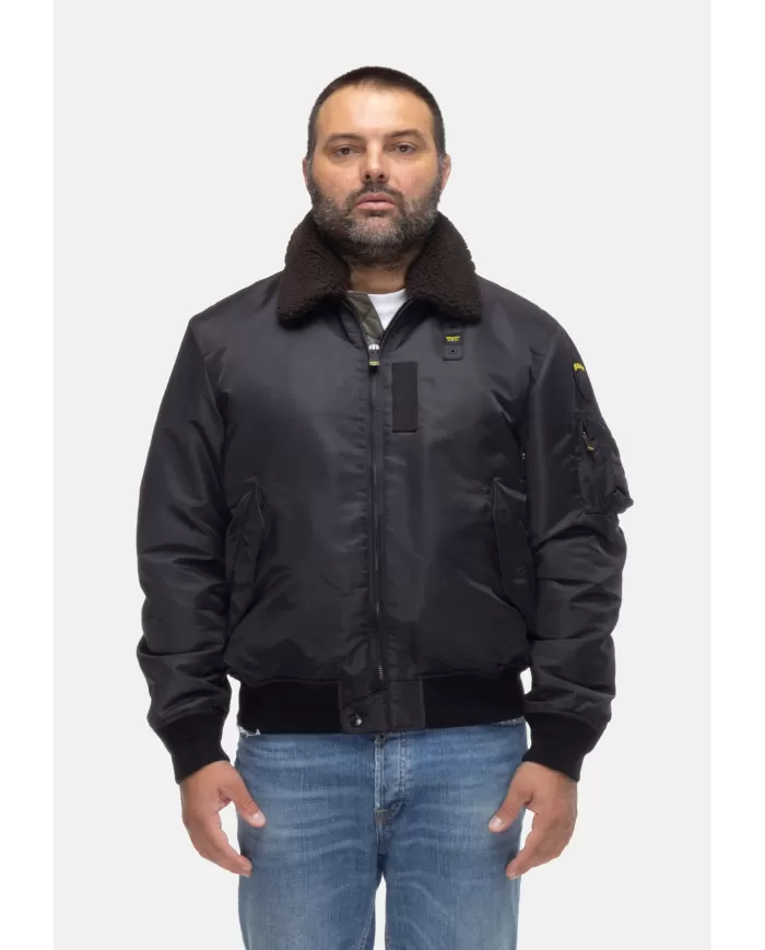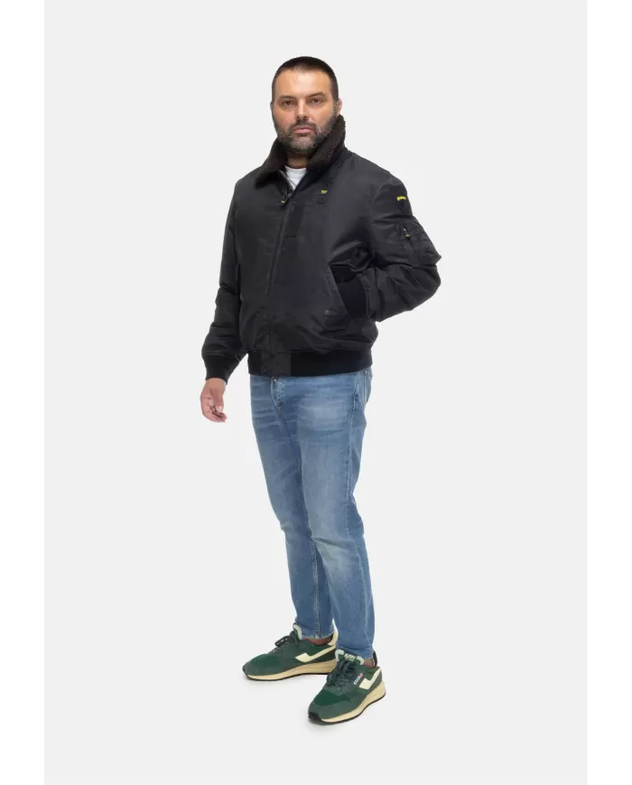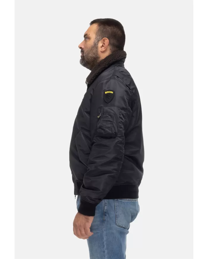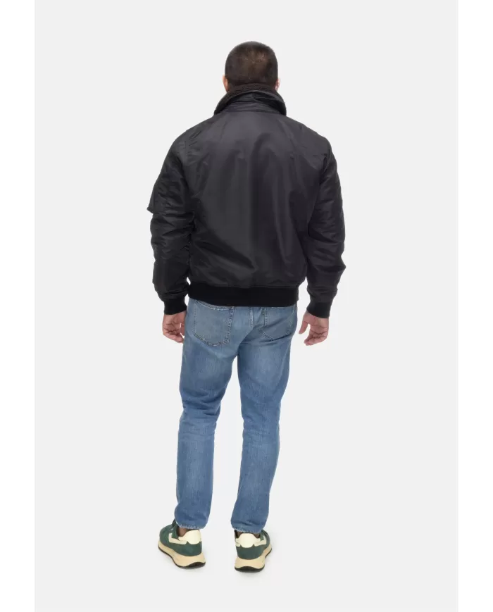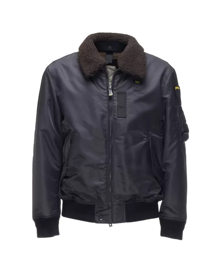 Water-repellent bomber jacket with eco-friendly padding. A classic and contemporary piece that combines military style with urban style. Removable faux sheepskin collar. • Faux fur collar • Sorona® Aura wadding filling • Zip closure • Snap pockets • Zippered left sleeve pocket with pen holder • Matching ribbing on the bottom and cuffs • Inside snap pockets • Logo patch and loop
