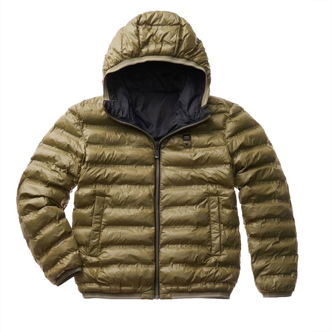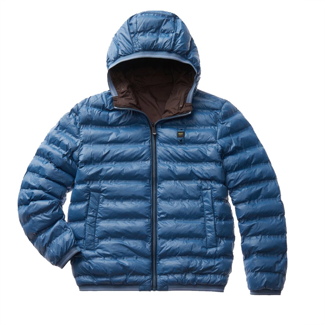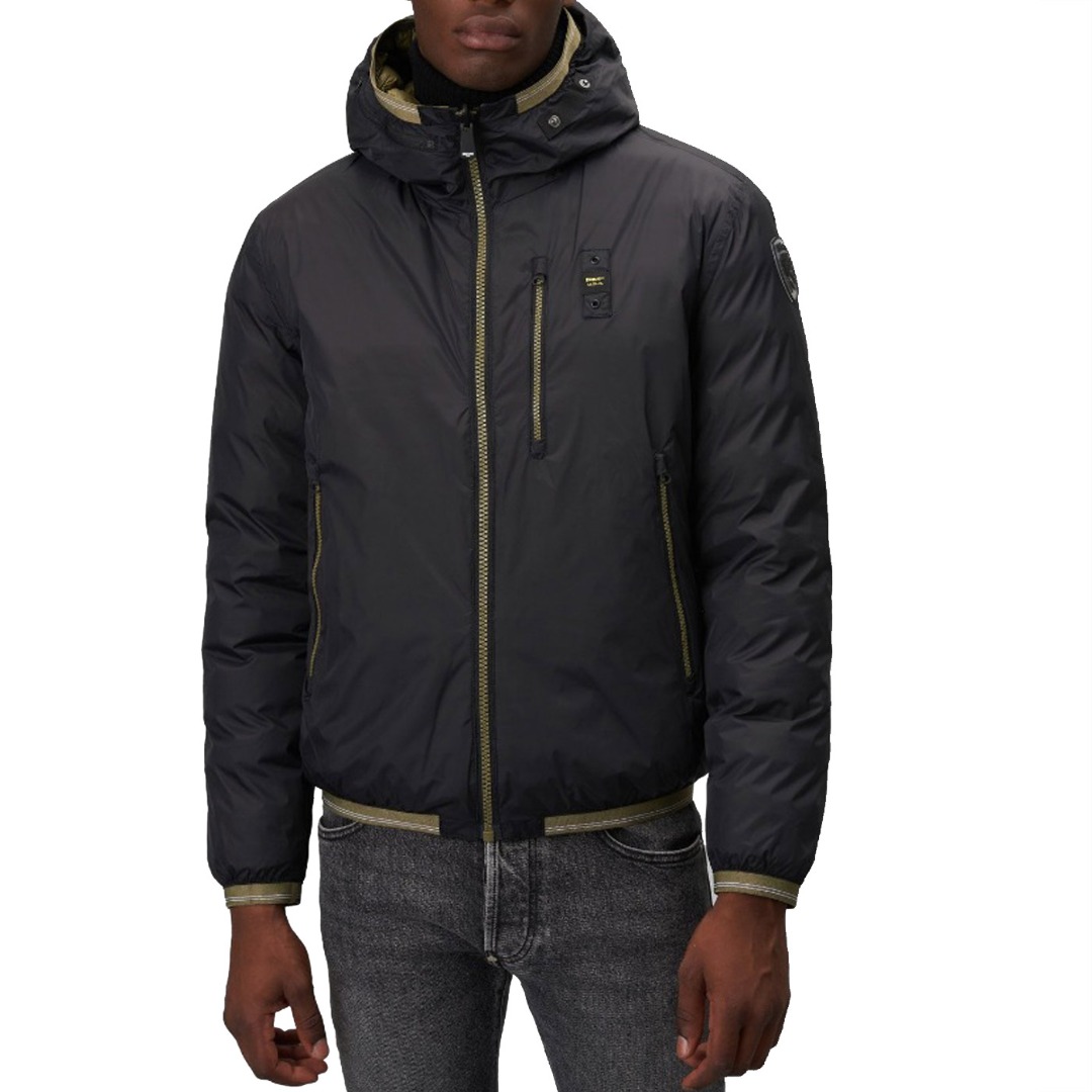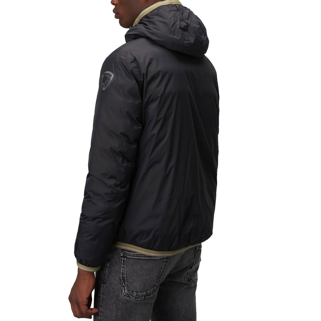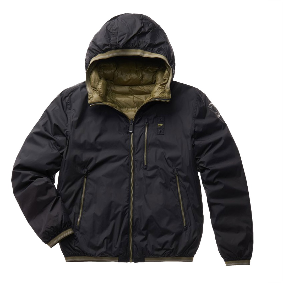 Reversible nylon down jacket with fixed hood and ecological padding obtained from the recycling of plastic bottles. On one side, shiny fabric with striped heat-sealed seams. Two front pockets with invisible snap. On the other side, smooth fabric in contrasting color with respect to the other, two pockets with hidden zip and slider cover and another pocket with vertical zip on the chest. Striped elastic tape, in tone with the shiny nylon fabric, on the edge of the hood, on the bottom of the garment and on the cuffs of the sleeves which also incorporates the color of the reversible zip in the center. Mask hidden in the zip of the hood with two snaps for fastening. On both sides, characteristic Blauer loop on the left chest and transparent rubber Blauer patch on the smooth side.