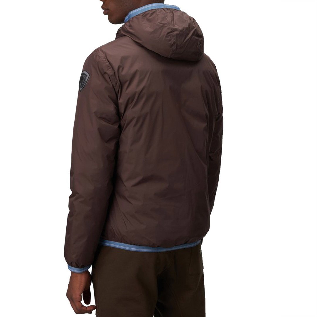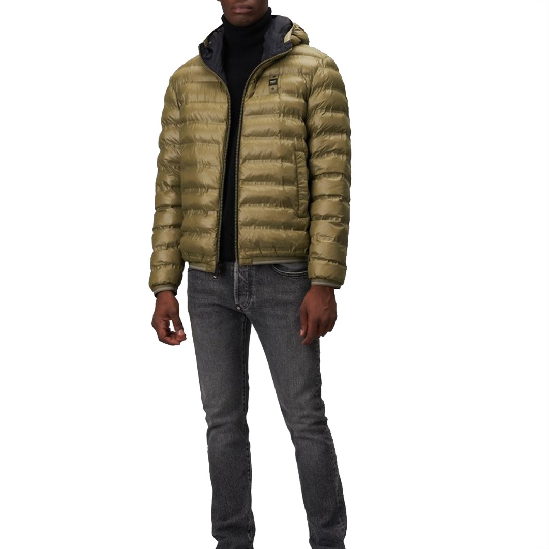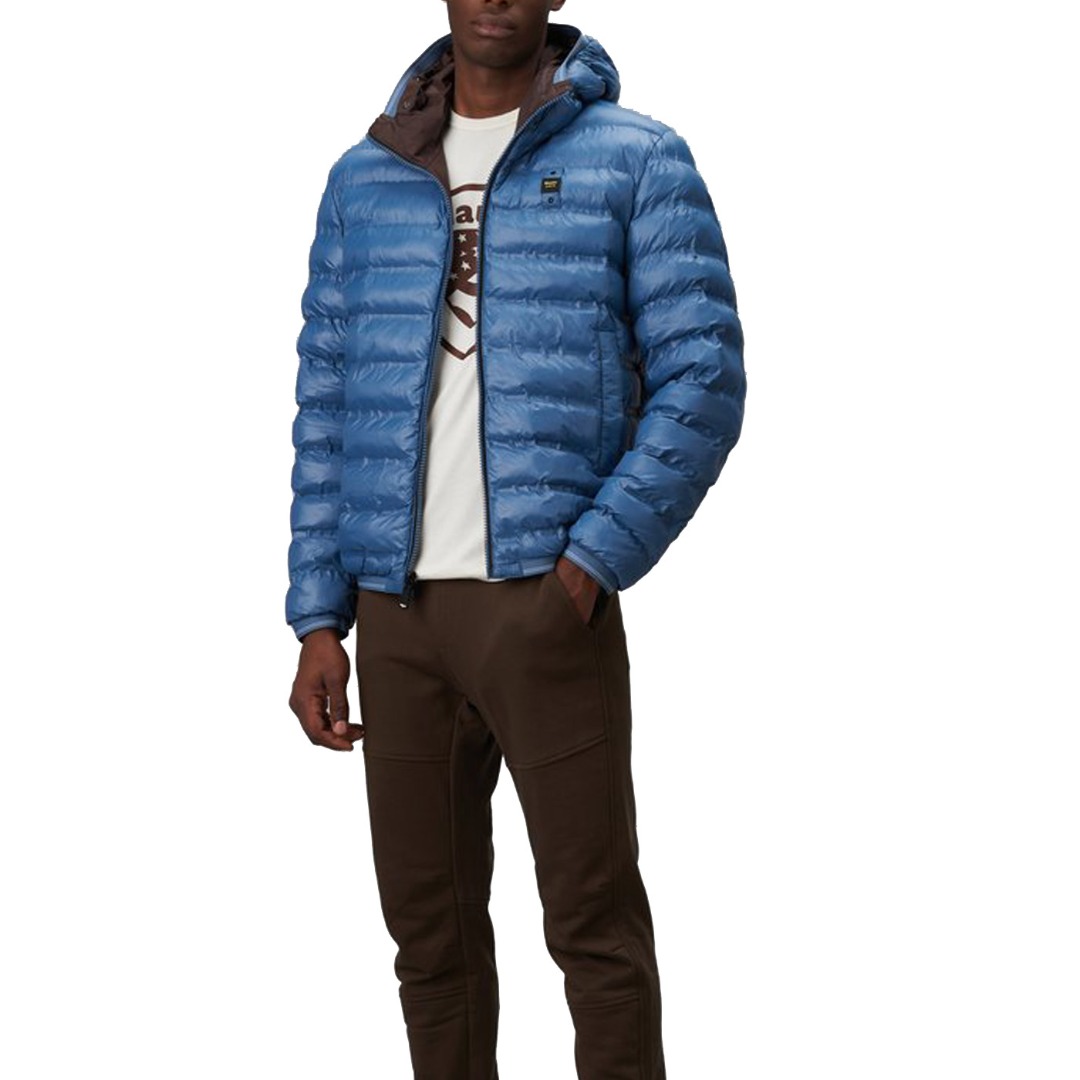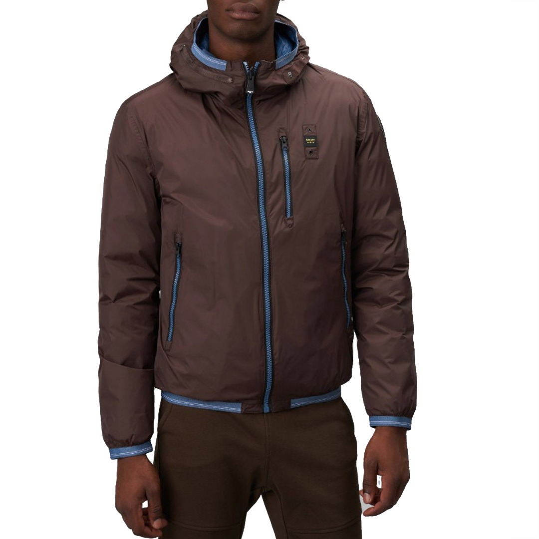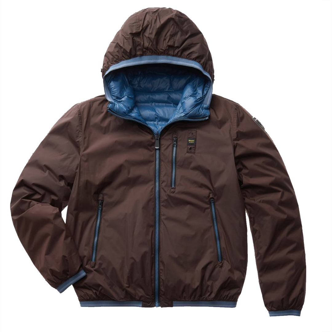 Reversible nylon down jacket with fixed hood and ecological padding obtained from the recycling of plastic bottles. On one side, shiny fabric with striped heat-sealed seams. Two front pockets with invisible snap. On the other side, smooth fabric in contrasting color with respect to the other, two pockets with hidden zip and slider cover and another pocket with vertical zip on the chest. Striped elastic tape, in tone with the shiny nylon fabric, on the edge of the hood, on the bottom of the garment and on the cuffs of the sleeves which also incorporates the color of the reversible zip in the center. Mask hidden in the zip of the hood with two snaps for fastening. On both sides, characteristic Blauer loop on the left chest and transparent rubber Blauer patch on the smooth side.