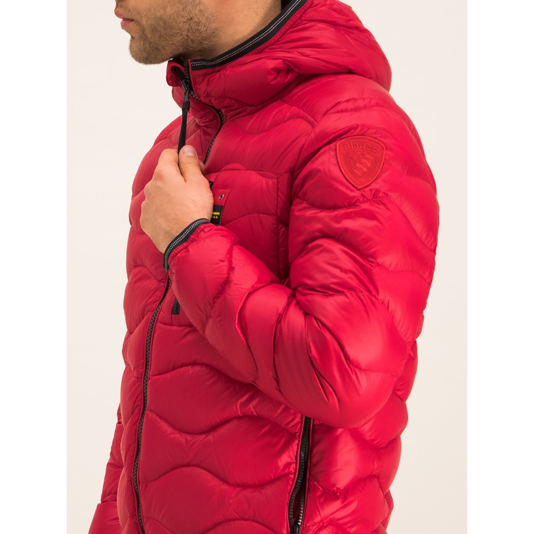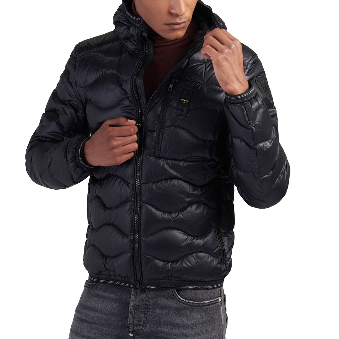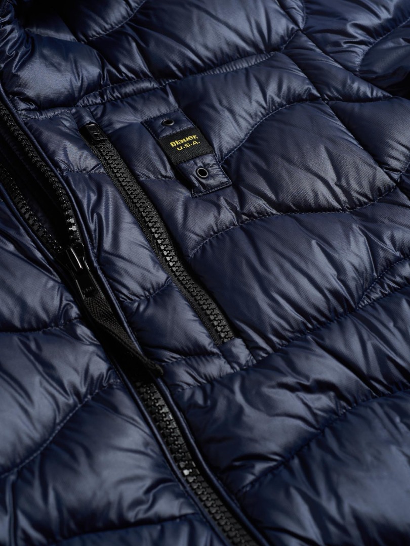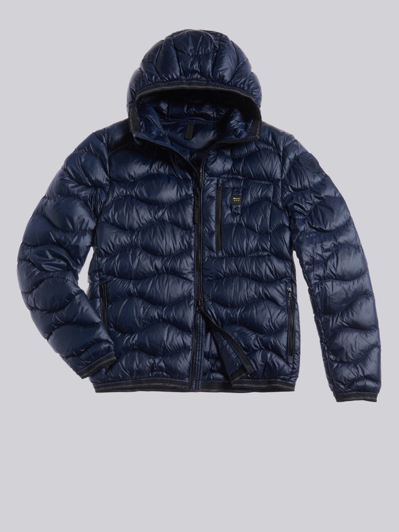 Warm but light down jacket in shiny micro rip nylon with hood, quilted in horizontal waves. Central closure with double-slider zip along the entire length, internal zip protection and slider cover on the neck. Striped elastic tape on the edge of the hood, on the cuffs and on the waistline for a tighter effect. External pocket sewn on the left chest with zip closure. Two front pockets with vertical zip. Inside left pocket with velcro. Characteristic Blauer loop sewn on the left chest and Blauer patch in the same tone cloth on the sleeve. It is recommended to purchase one size up.