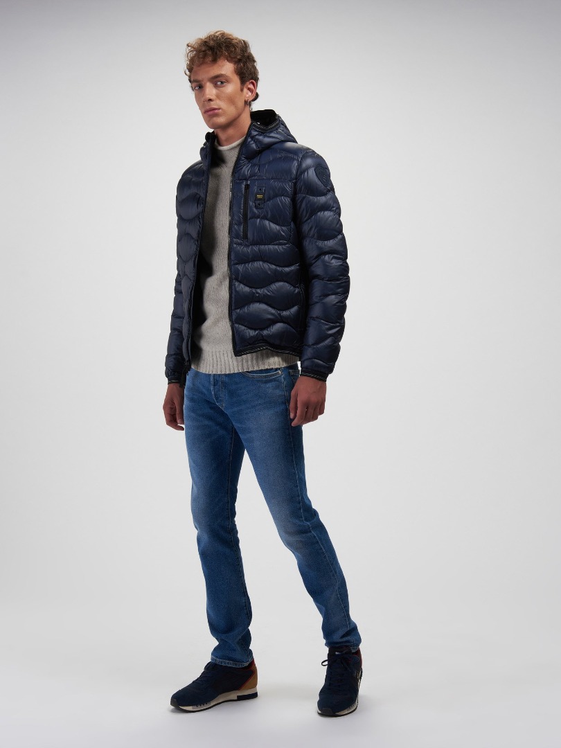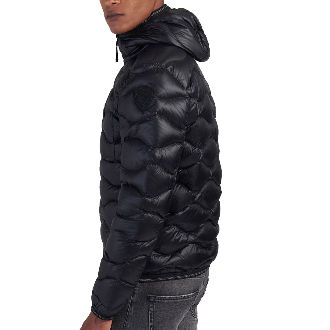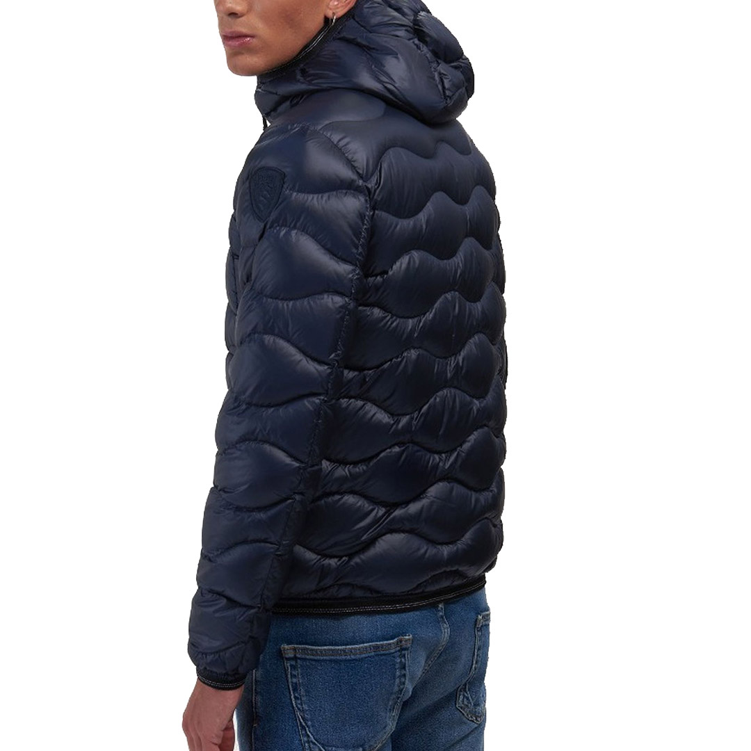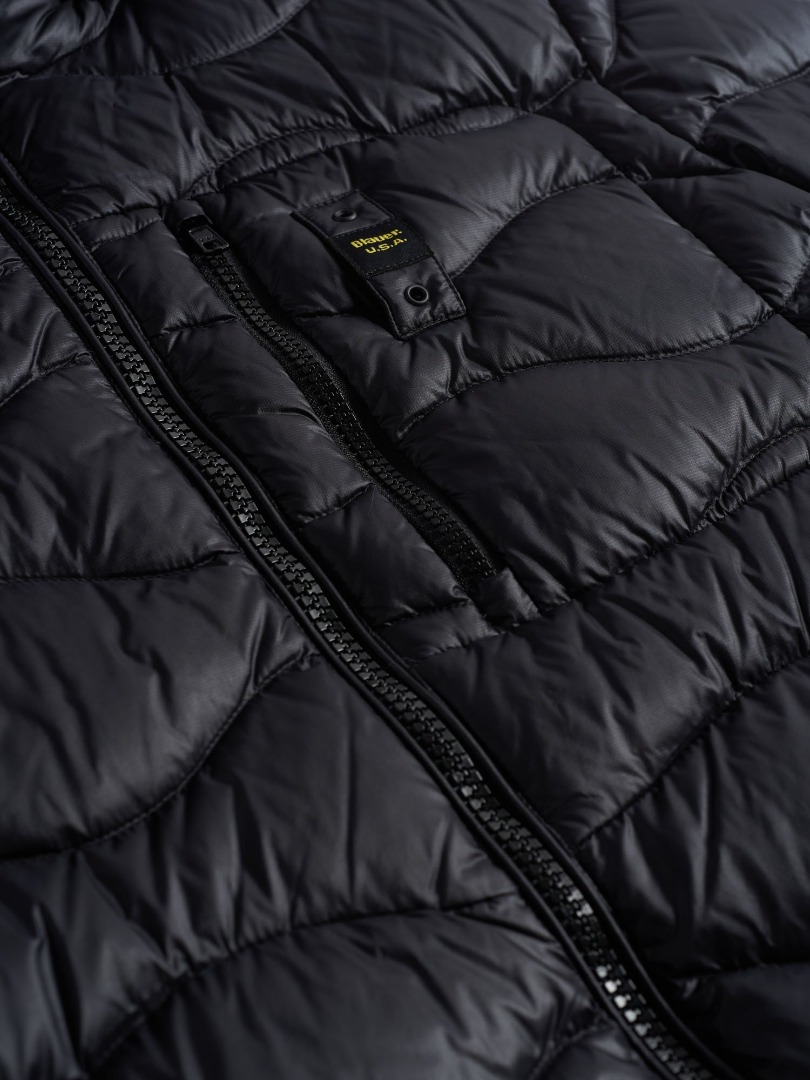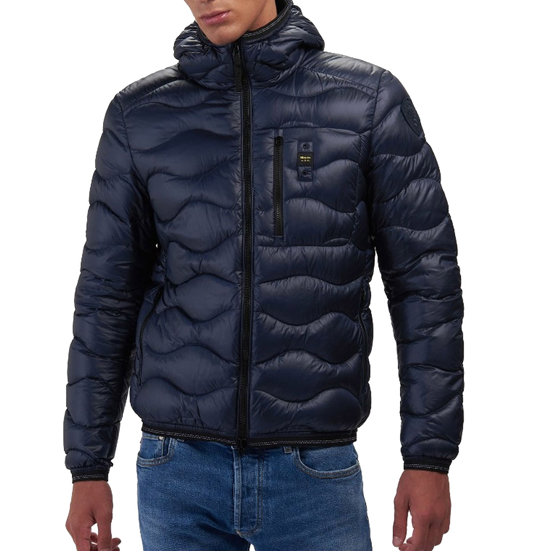 Warm but light down jacket in shiny micro rip nylon with hood, quilted in horizontal waves. Central closure with double-slider zip along the entire length, internal zip protection and slider cover on the neck. Striped elastic tape on the edge of the hood, on the cuffs and on the waistline for a tighter effect. External pocket sewn on the left chest with zip closure. Two front pockets with vertical zip. Inside left pocket with velcro. Characteristic Blauer loop sewn on the left chest and Blauer patch in the same tone cloth on the sleeve. It is recommended to purchase one size up.