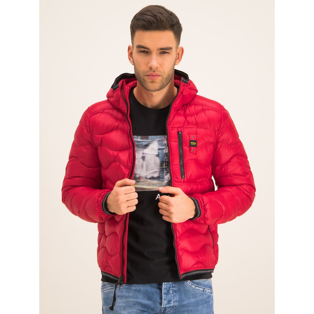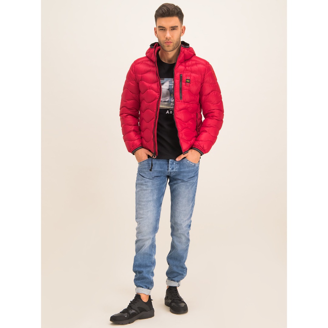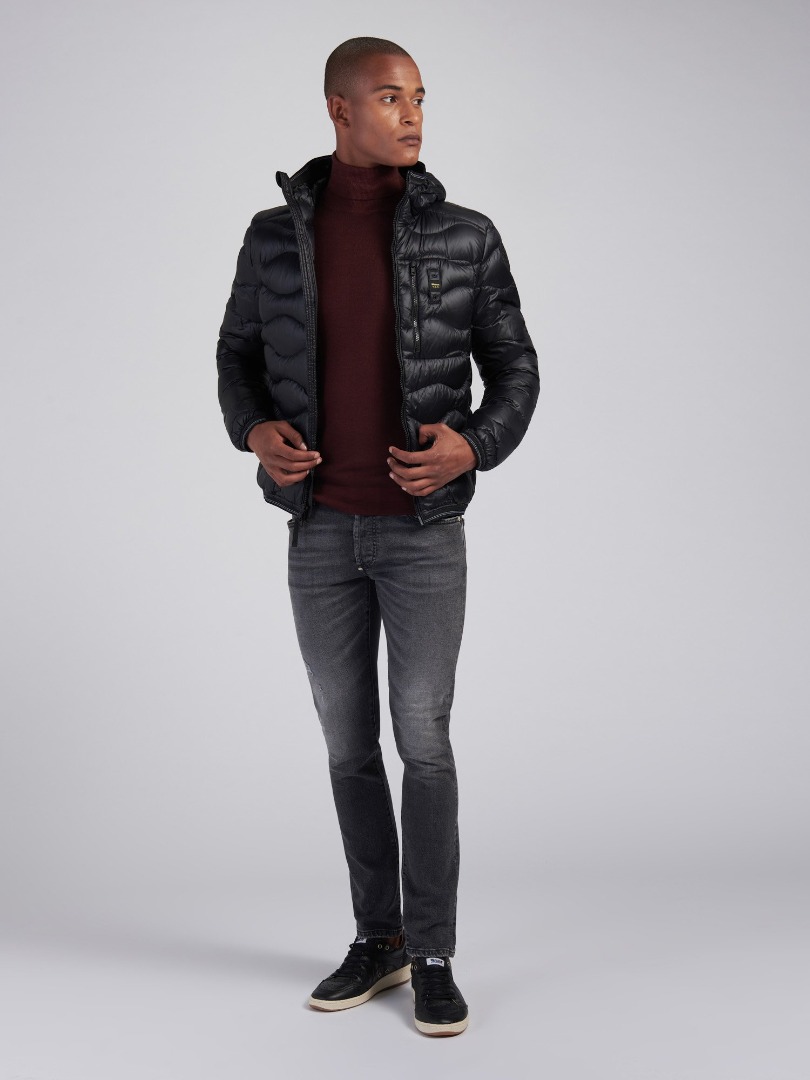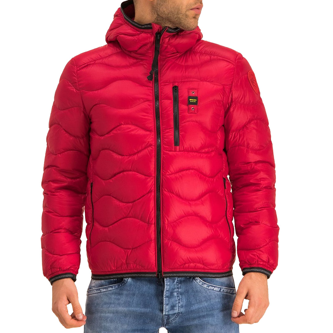 Warm but light down jacket in shiny micro rip nylon with hood, quilted in horizontal waves. Central closure with double-slider zip along the entire length, internal zip protection and slider cover on the neck. Striped elastic tape on the edge of the hood, on the cuffs and on the waistline for a tighter effect. External pocket sewn on the left chest with zip closure. Two front pockets with vertical zip. Inside left pocket with velcro. Characteristic Blauer loop sewn on the left chest and Blauer patch in the same tone cloth on the sleeve. It is recommended to purchase one size up.