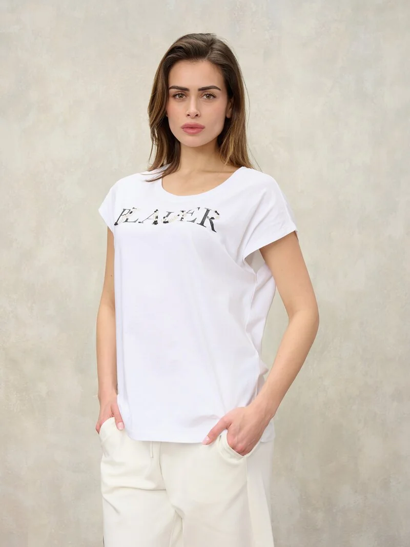 T-shirt with logo decorated with beads and rhinestones on the chest. • Crew neck • Short sleeves • Shield logo on the chest
