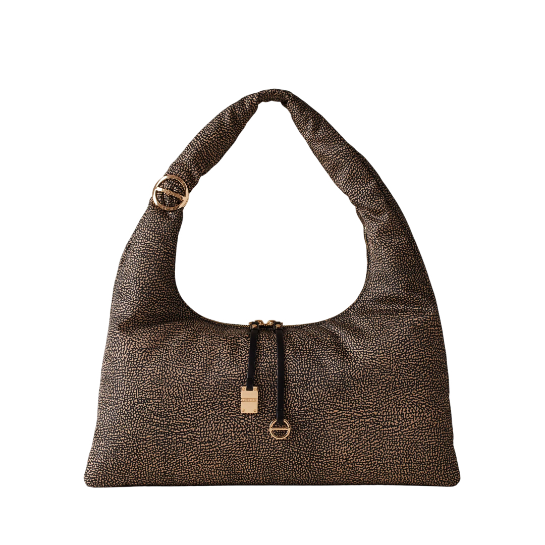 Borbonese Cahier Medium OP Natural Black shoulder bag, half-moon shape with rounded profile and made of padded OP-print fabric. Metal tag, single leather handle, and adjustable, removable logoed shoulder strap. Zippered compartment, lined interior with pocket. Length: 32 cm, Height: 22 cm, Depth: 9 cm.