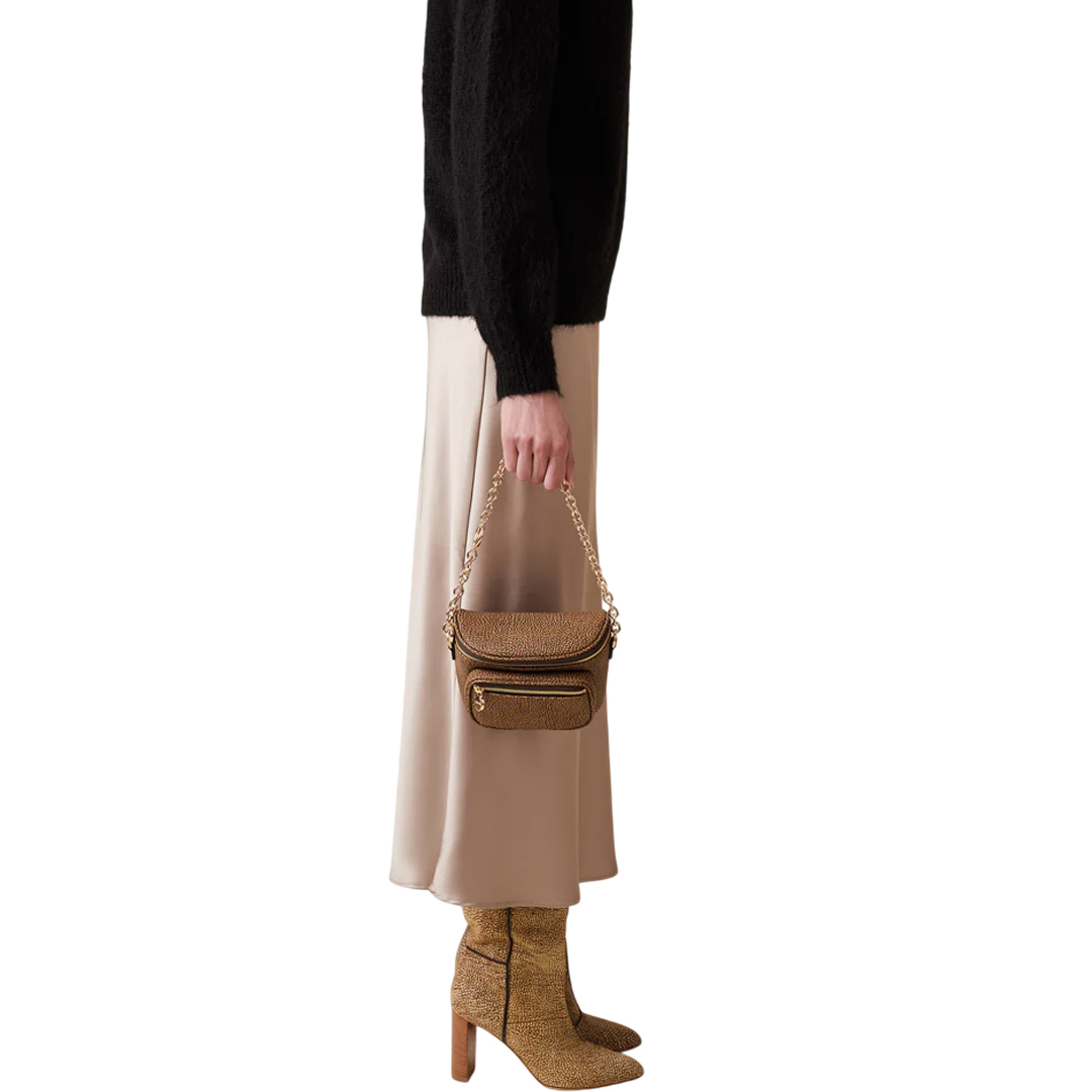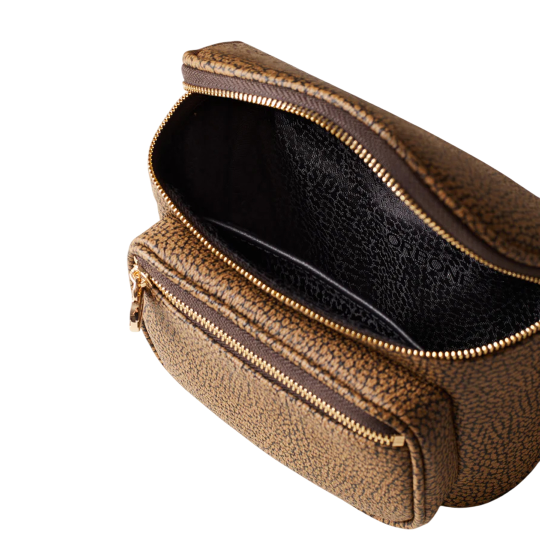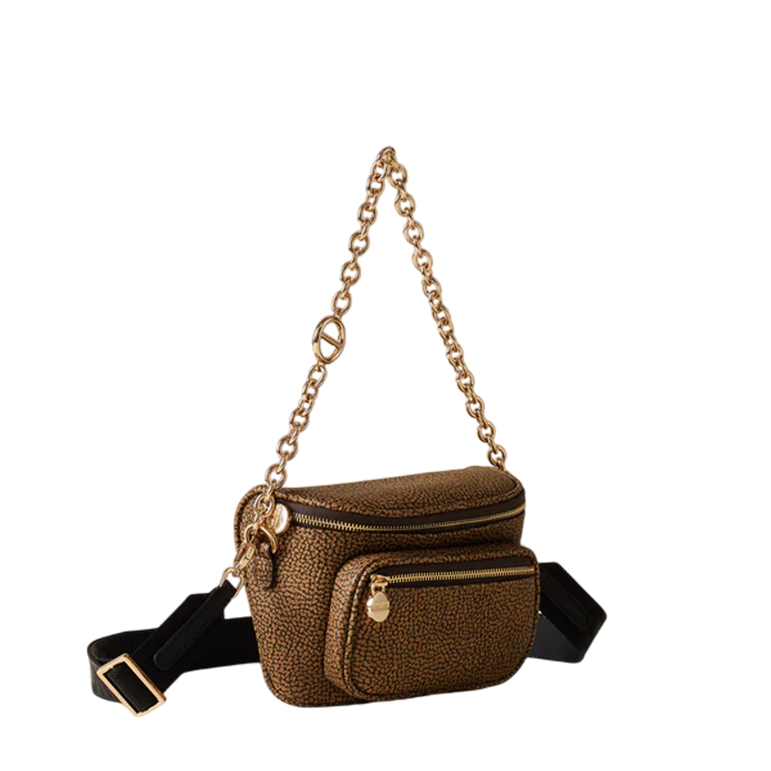 Op print canvas Closure with metal zip and zip pull with logo plate Front pocket with metal zip and logo plate Shoulder strap in metal chain with logo screw Removable and adjustable shoulder strap in logo ribbon Interior lined in jacquard fabric Internal open pocket Mini size Light gold metalwork Width 18 cm Height 11 cm Depth 8 cm