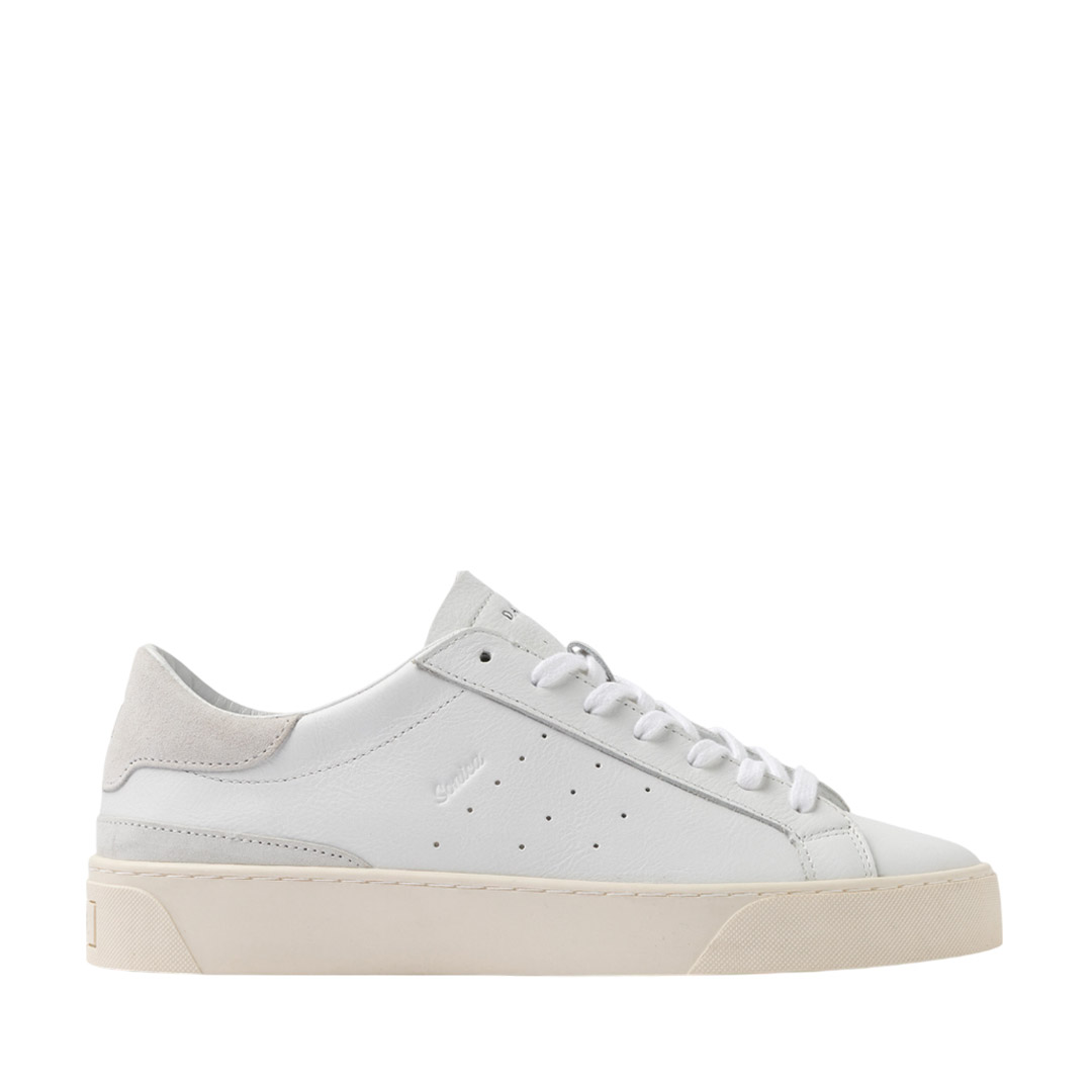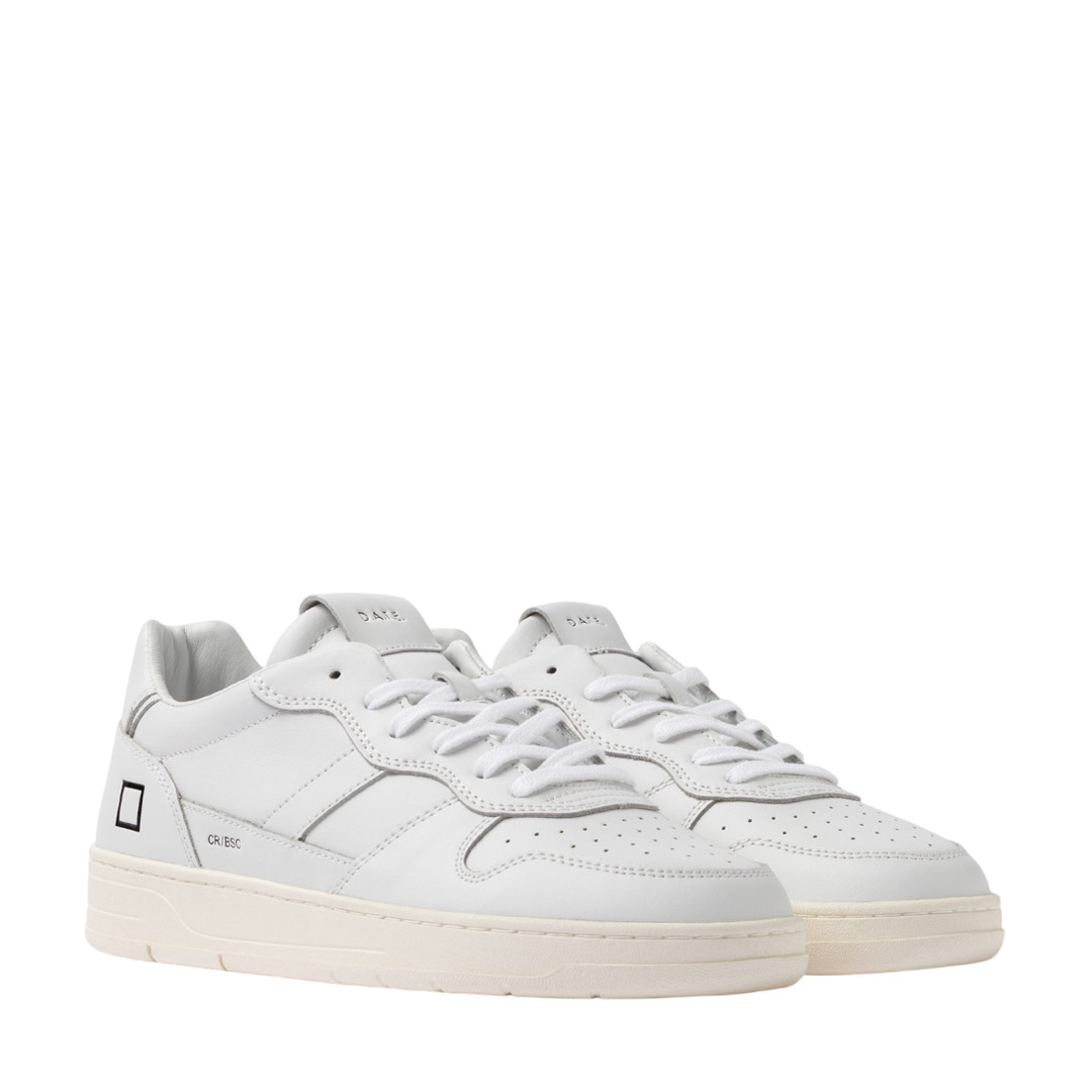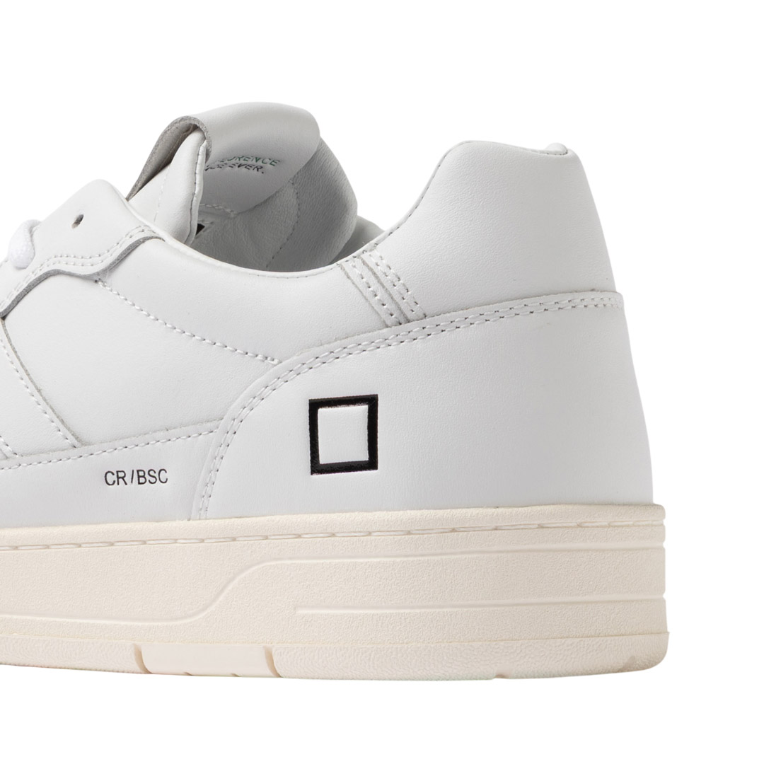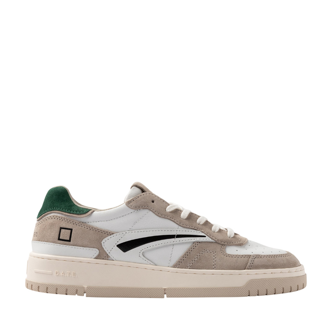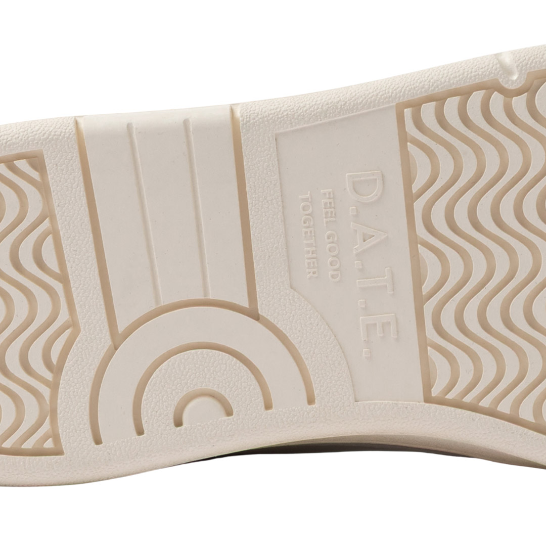 The toe is perforated for greater breathability. Label sewn onto the tongue with DATE embossed. The laces are made of cotton and the code and square logo are embossed on the side. The side band is made of white leather. The back patch is made of white leather. Lining is leather and cotton terry. The insole is raised by 2.5 cm for greater comfort. The 3 cm high rubber sole is stitched. Fit: REGULAR