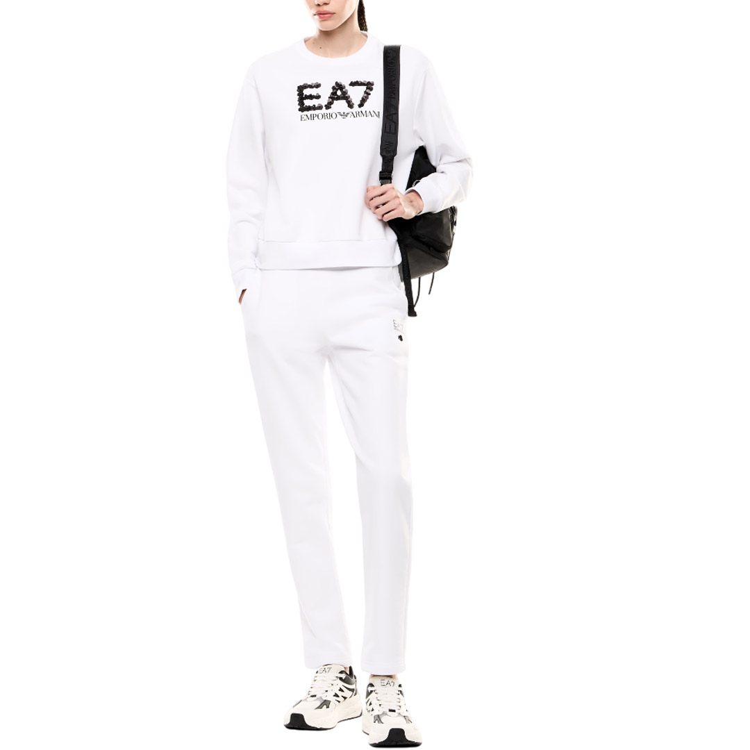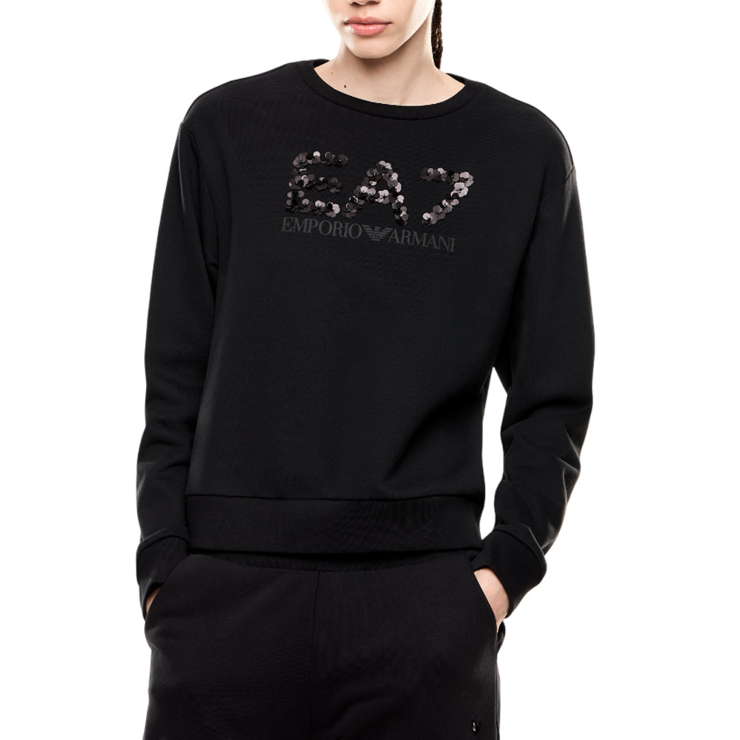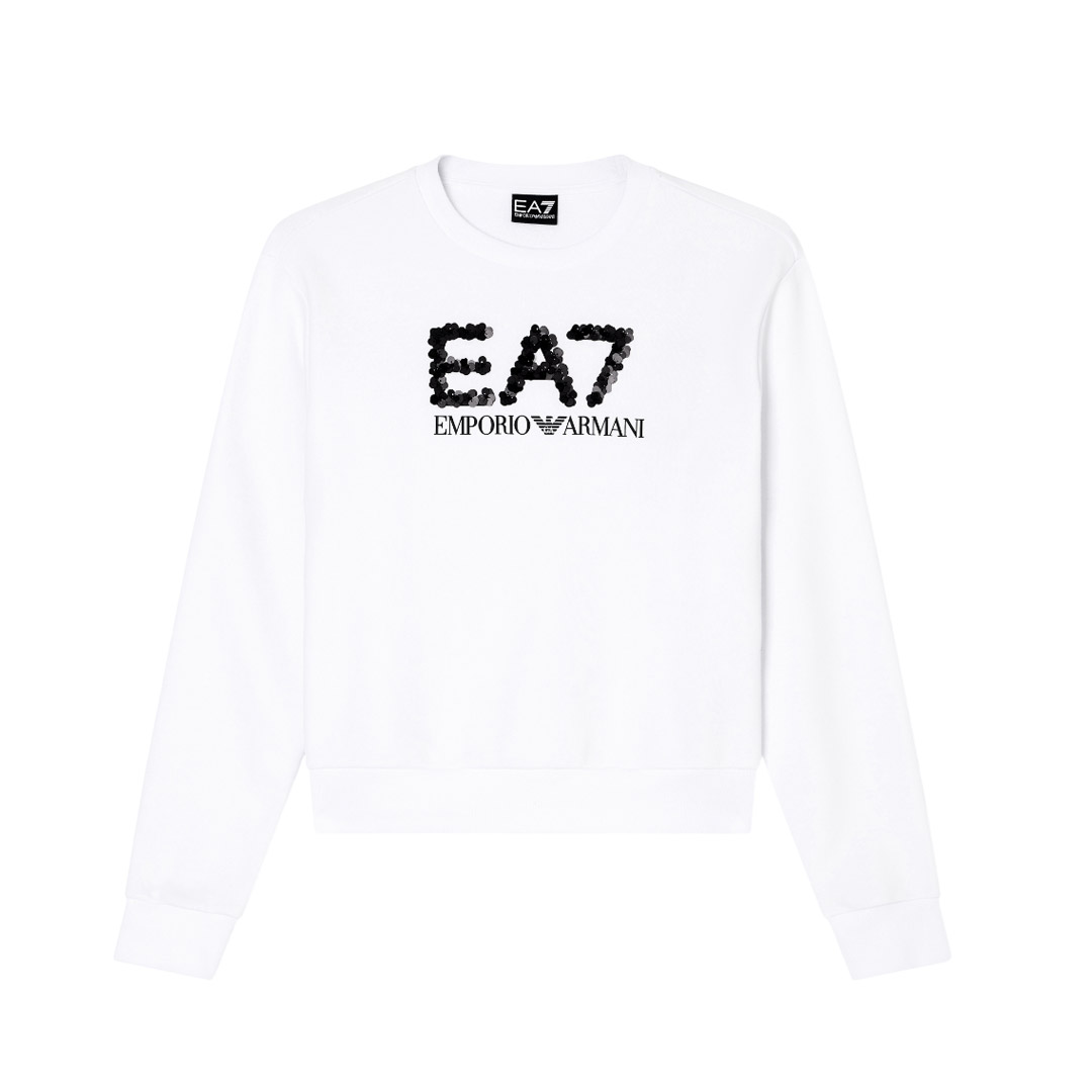 The maxi EA7 logo made with tone-on-tone sequins is the real protagonist of this cotton blend crewneck sweatshirt. This long-sleeved model has an extremely versatile attitude and is suitable for sporty or leisure outfits.