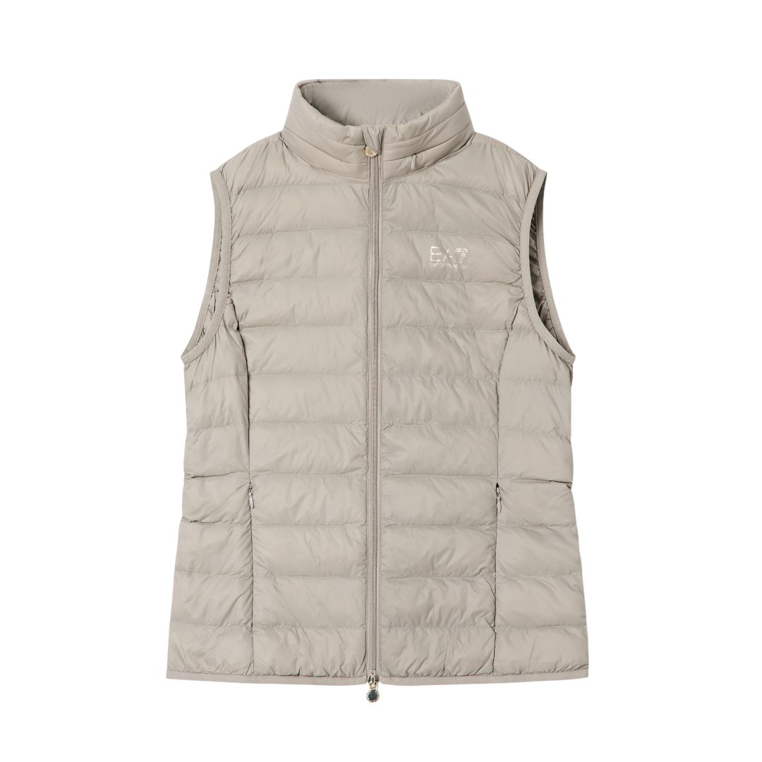 Padded zip-up vest with two zipped side pockets, made of lightweight, windproof nylon. This comfortable and versatile piece is embellished with the iconic contrasting EA7 logo, perfect for traveling thanks to its convenient dust bag.