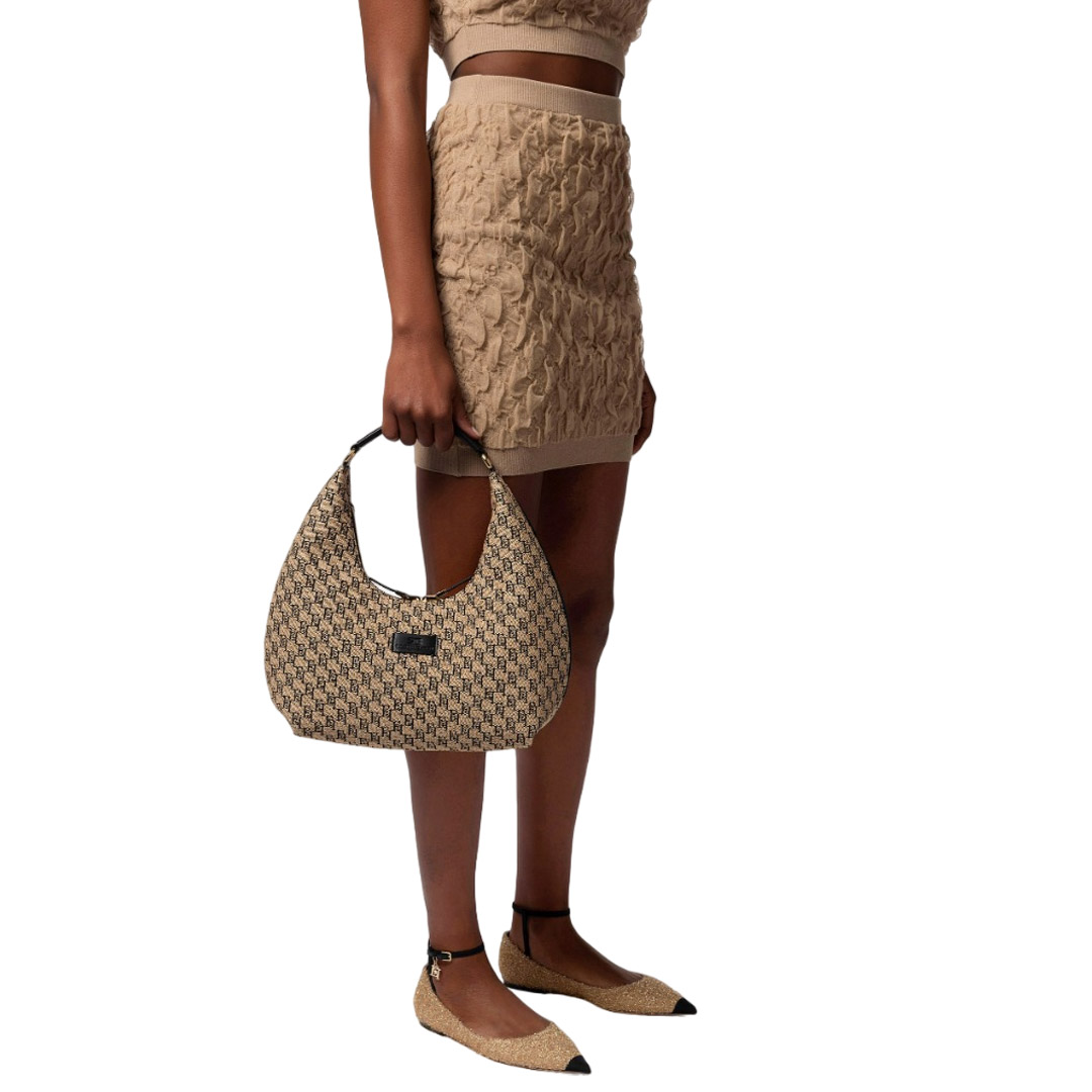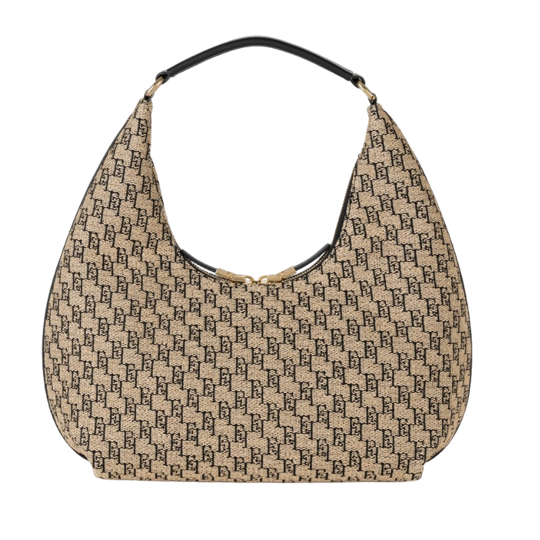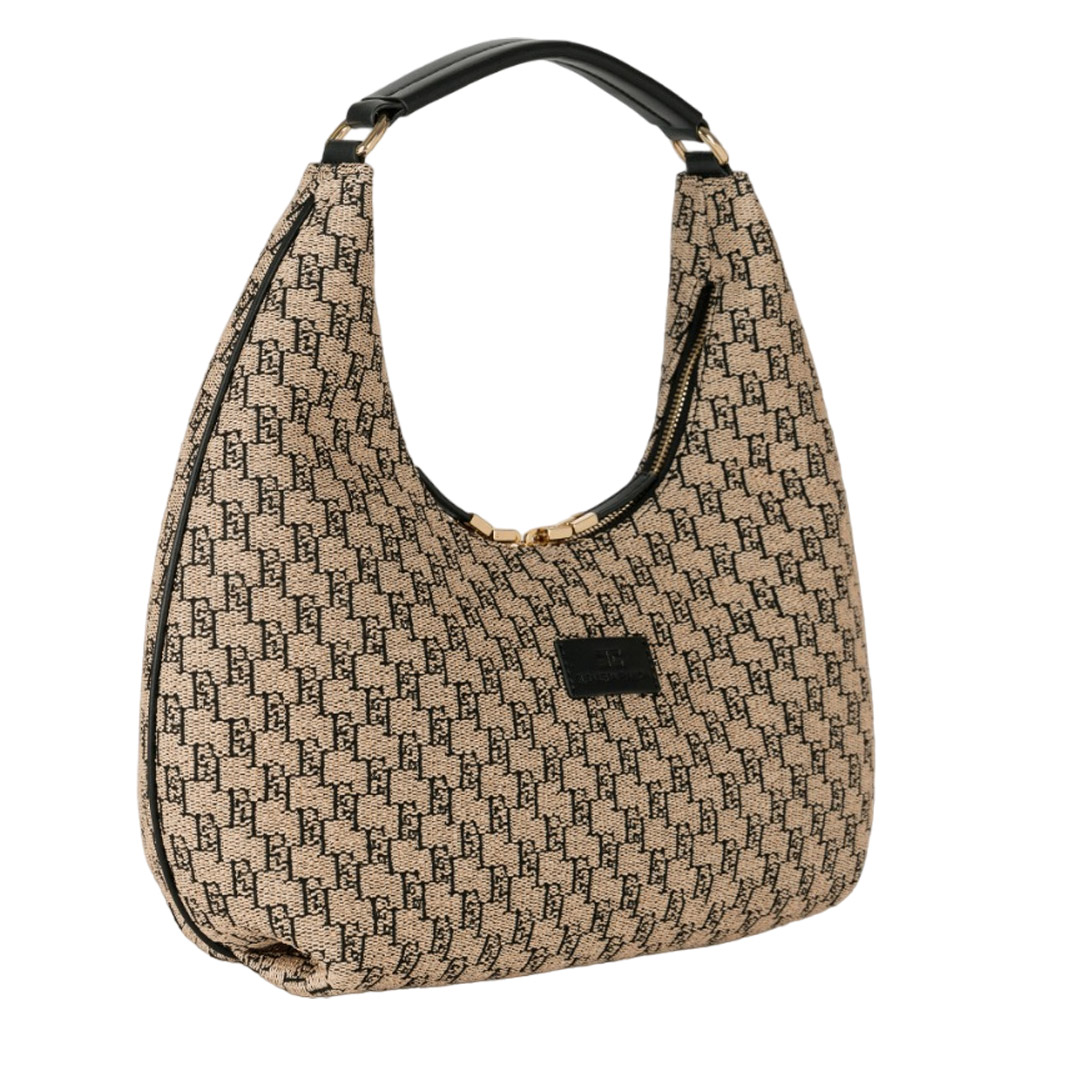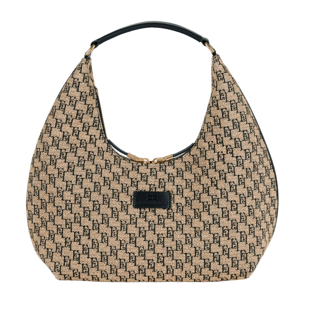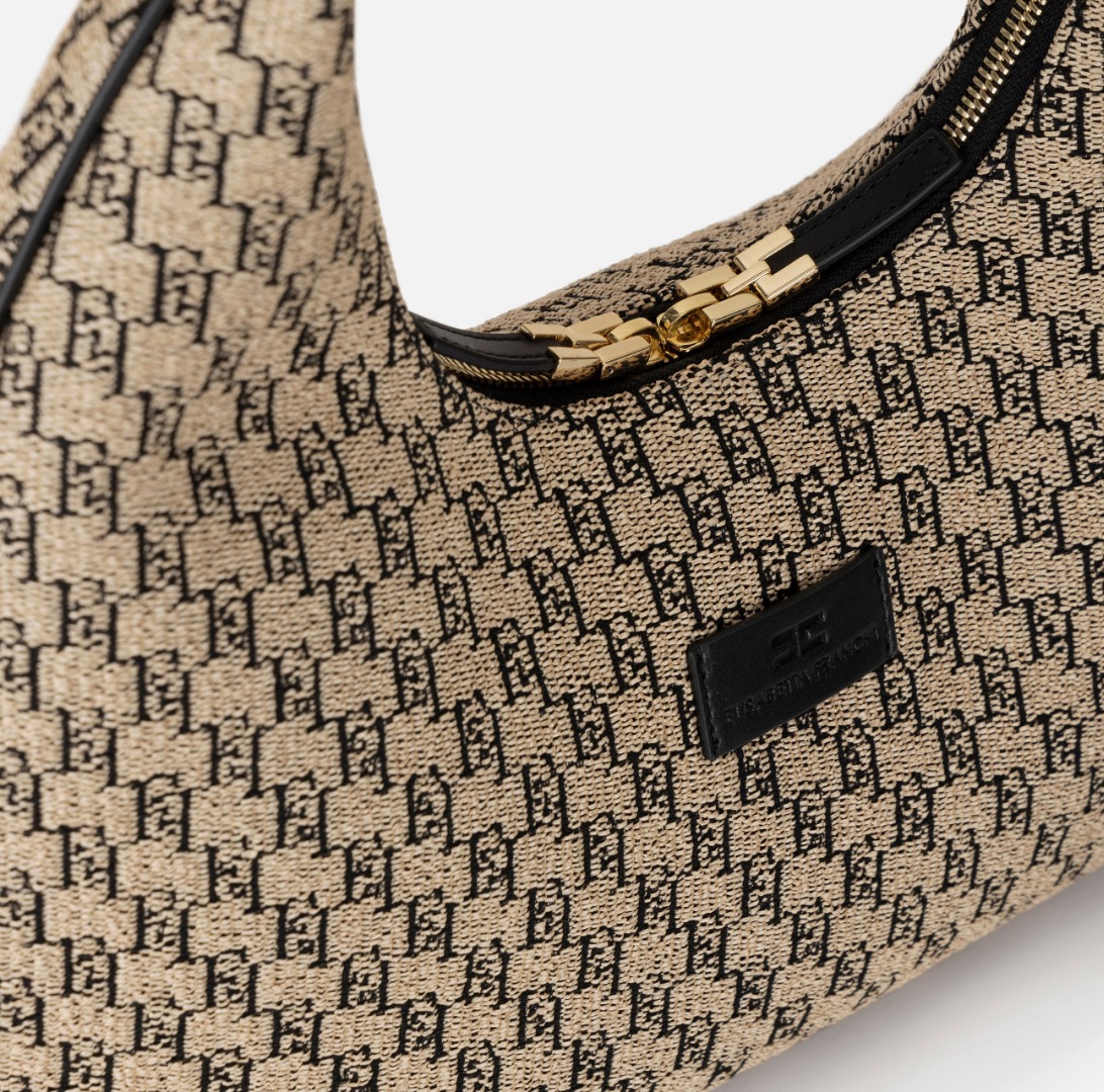 Large jacquard raffia hobo with leather-effect fabric shoulder strap. It is characterized by a heat-engraved logo plaque and double zip closure. Cotton lining. Dimensions 24 x 37 x 12 cm.