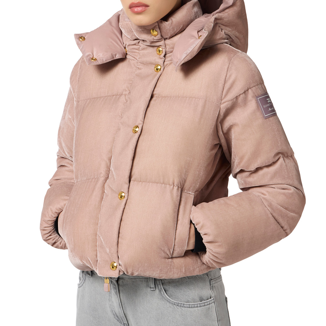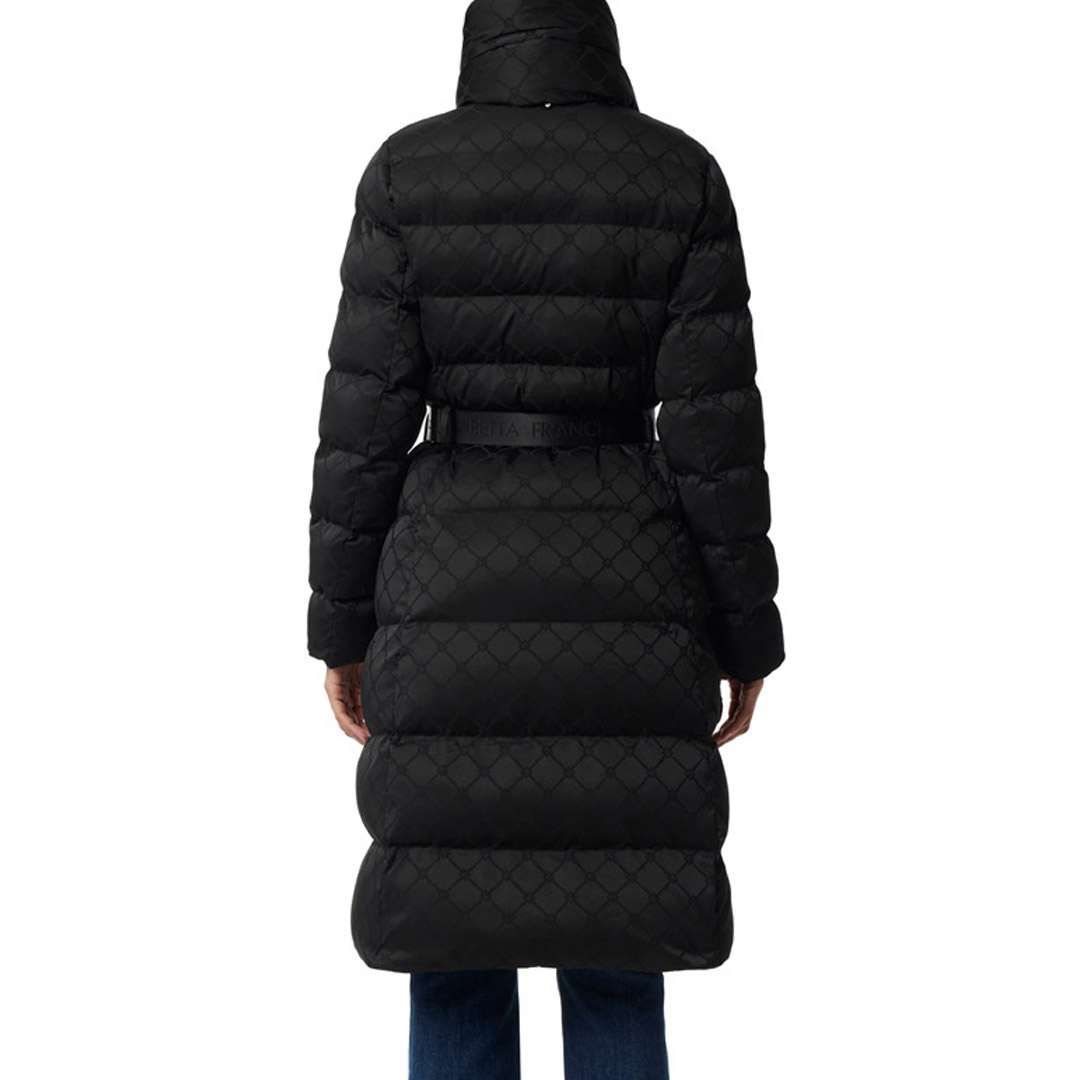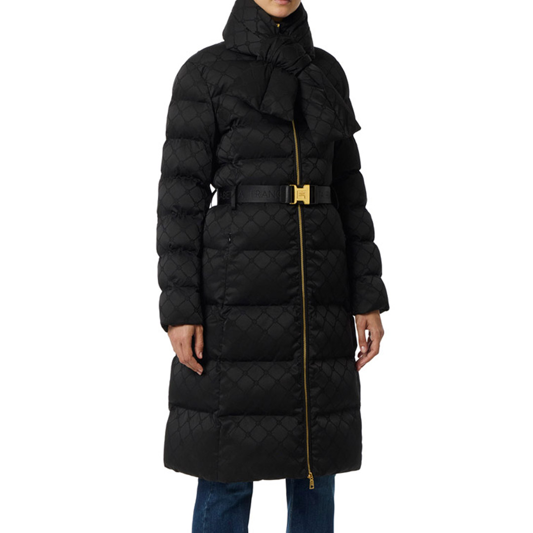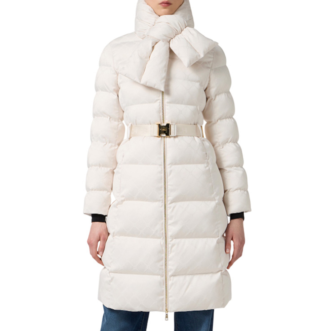 Long down jacket in sail fabric with a regular fit. It features a collar with a removable padded scarf and pockets with invisible zips. The all-over jacquard diamond pattern adds a luxurious touch. A belt with a buckle defines the waist. Technical fabric padding. Removable padded scarf. Pockets with invisible zips. Belt with buckle. Zip closure. Length: 110 cm for size 40 IT.