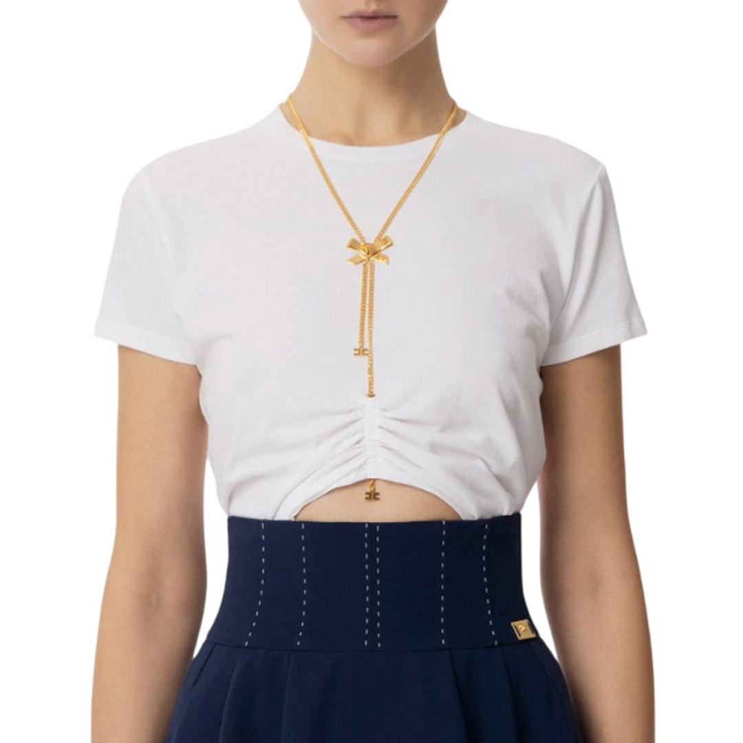 From casual garment for freetime to glamorous ally for multiple occasions: the T-Shirt is the must-have of every modern wardrobe. This model stands out for the elegant archive image of the Maison printed both on a first layer of light organza, and on the fabric itself, so as to overlap the images and recreate an original three-dimensional effect. Jersey Print Solid color Round collar Short sleeves