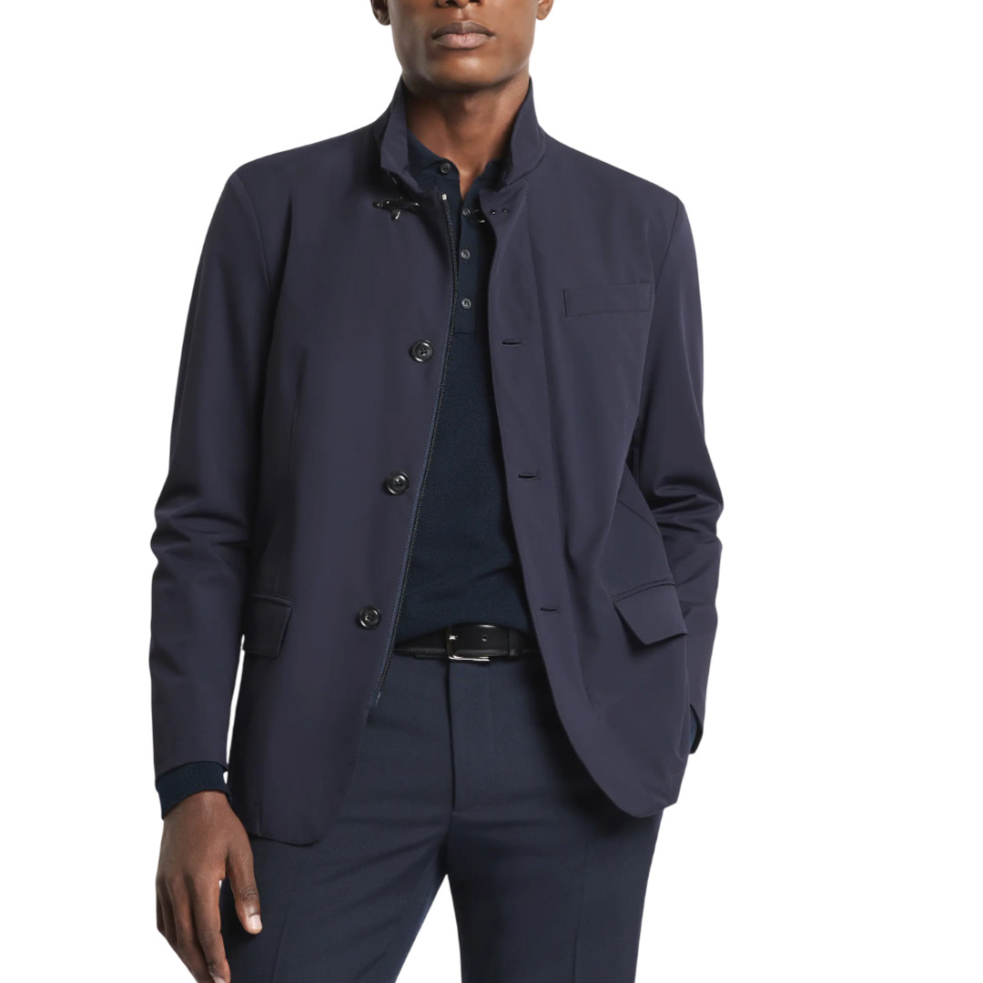 Unlined travel jacket made of water-repellent stretch nylon with a stand-up collar and front pleats. Featuring a zip closure, exposed buttons, and the iconic Fay hook at the collar, it features welt pockets with flaps, a chest pocket, and an inside pocket. Made in Italy. Fit: regular.