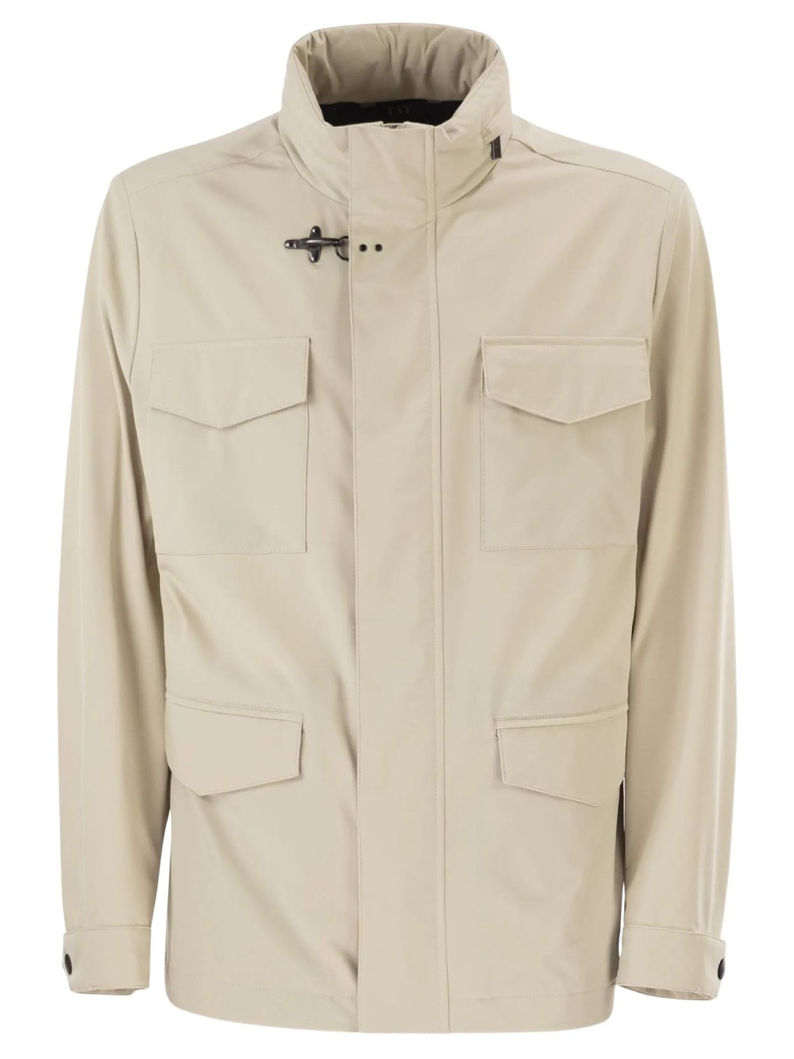 Unlined Travel jacket made of stretch nylon with anti-drop treatment, stand collar, featuring a zip fastening, hidden buttons and iconic Fay hook at the collar, features welt pockets with flap, a chest pocket and an internal pocket
