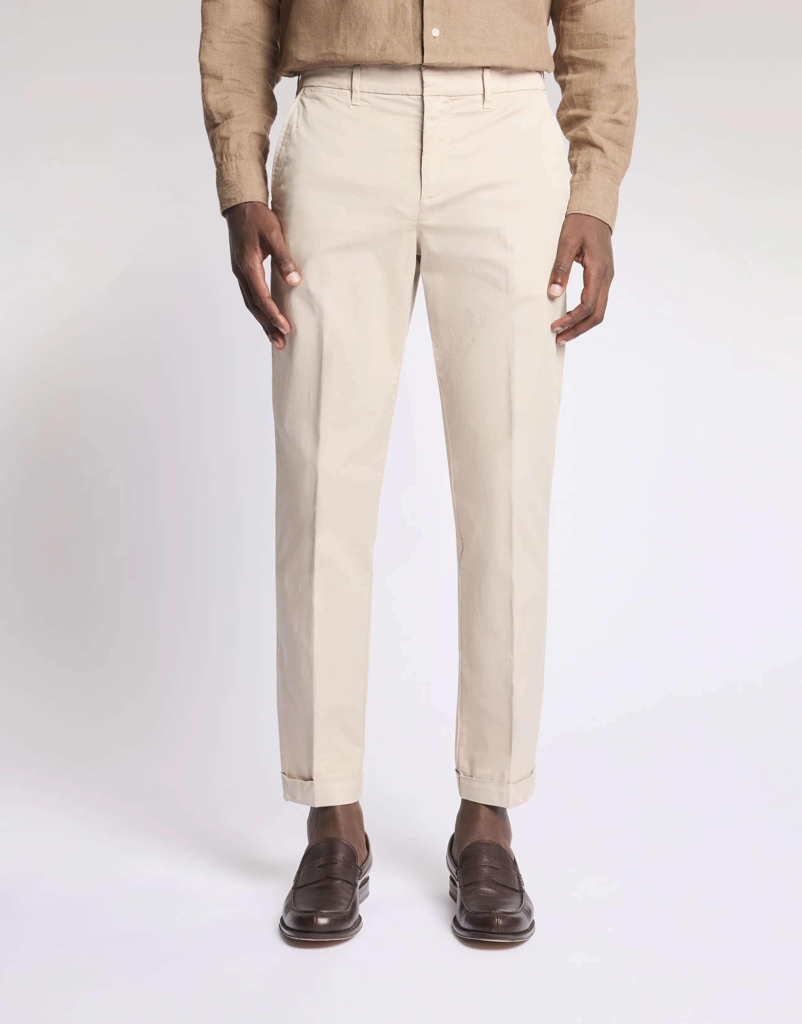 Slim-fit capri pants in garment-dyed stretch gabardine with rolled hems. Featuring slanted front pockets, a coin pocket, and buttoned back welt pockets, they have a zip and button closure. The style is enhanced by a personalized Fay label on the back and rolled hems. Made in Italy. Fit: slim.