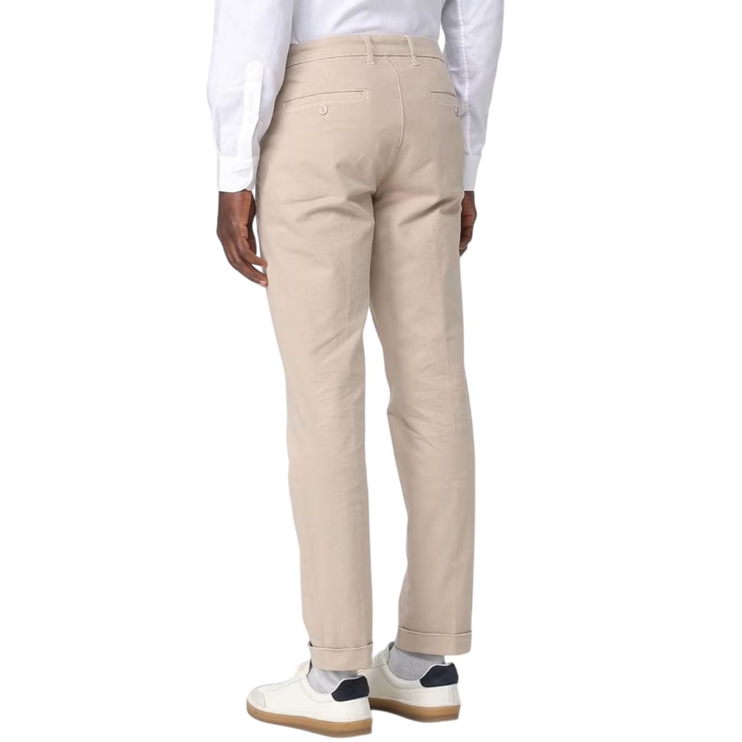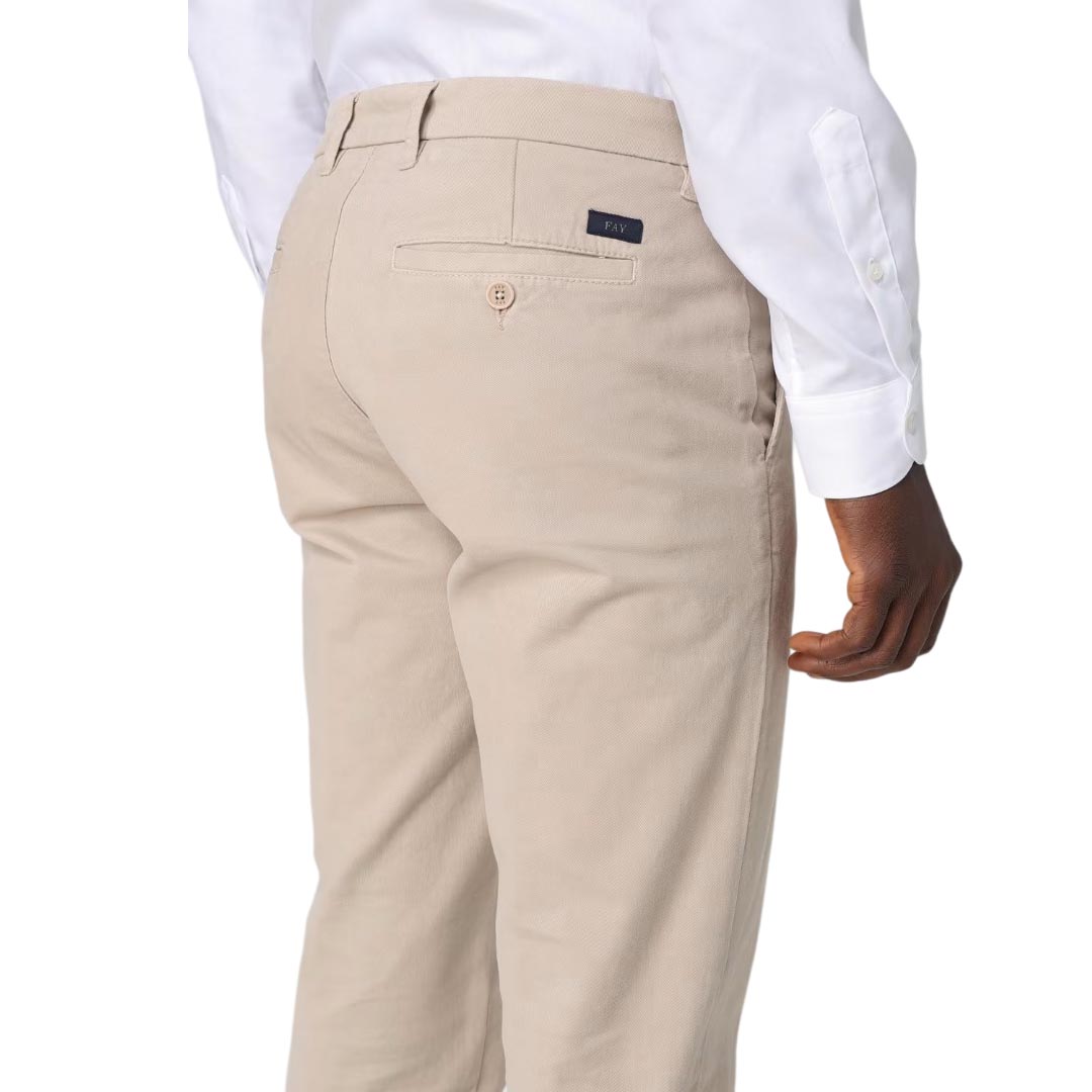 Garment-dyed cotton gabardine trousers with a personalized Fay label on the back and rolled hems. Featuring slanted front pockets, a coin pocket, and buttoned back welt pockets, they have a zip and button closure. Made in Italy. Fit: slim fit.