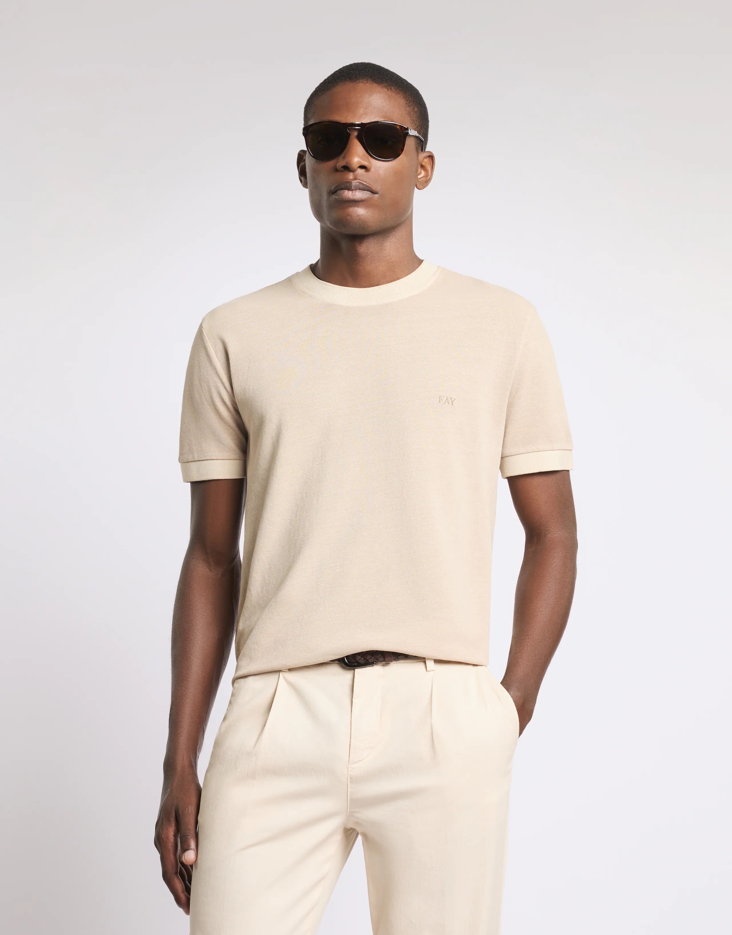 Cotton piqué T-shirt with a frosted garment dye treatment and a slightly faded effect. Featuring ribbed knit edges, it features the Fay logo embroidered on the chest. Fit: comfort.