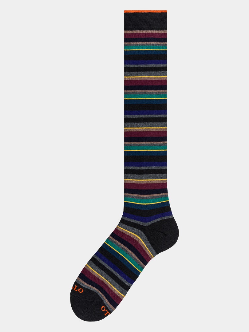 Long man stocking handmade in Italy in cotton and cashmere stocking st. Of Gallo Collection line suitable for everyday wear. Fantasy micro multicolor stripes all over. Written Gallo nell'iconica color of the brand at the tip