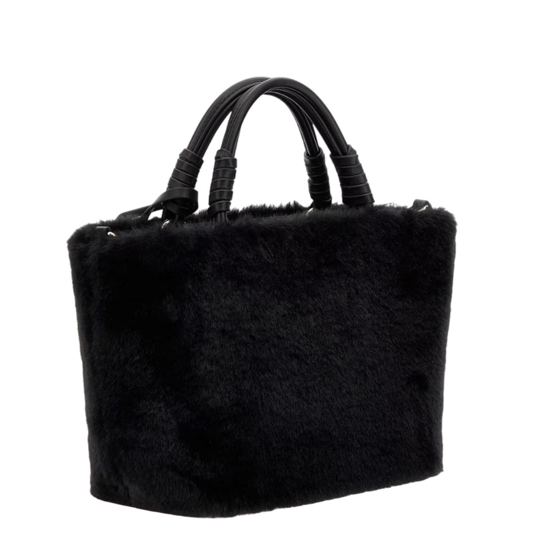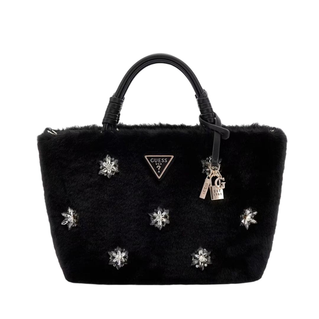 Faux fur exterior. Zipper closure. Pale gold-tone hardware. Family: Shaida. Flower jewel appliqués on the front. Removable logo charm at the base of the handle. Personalized logo lining. Interior zipper pocket. Metal logo triangle on the front.