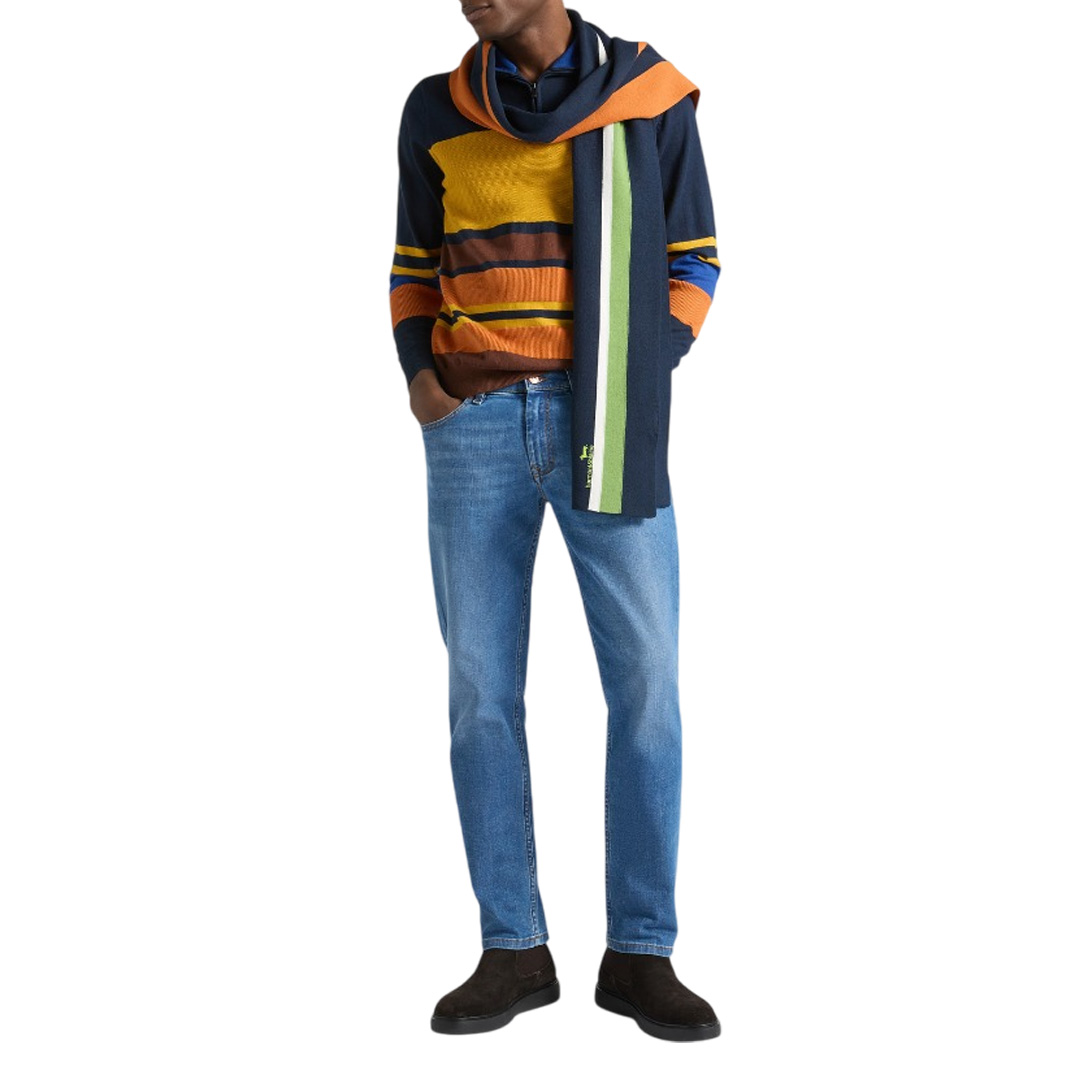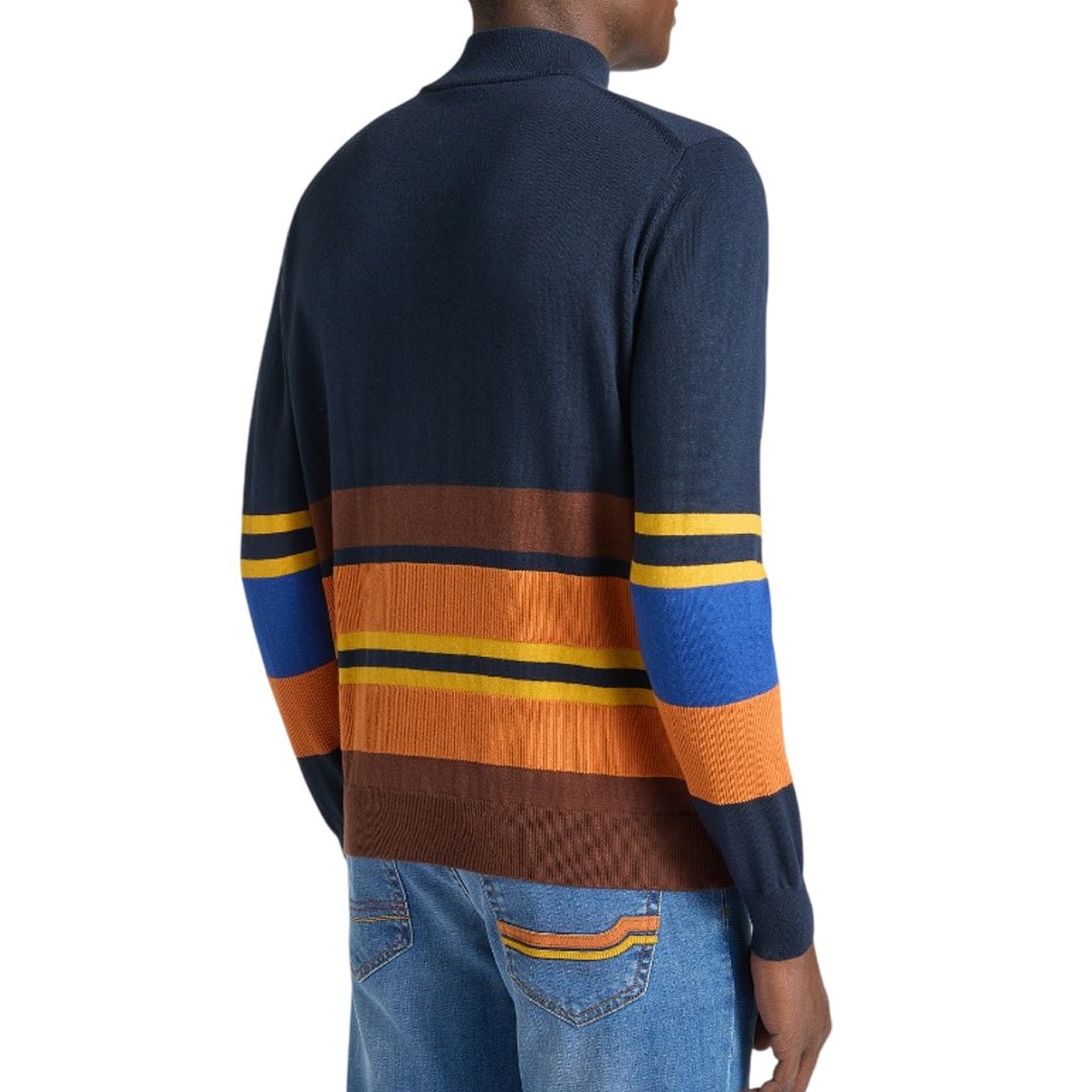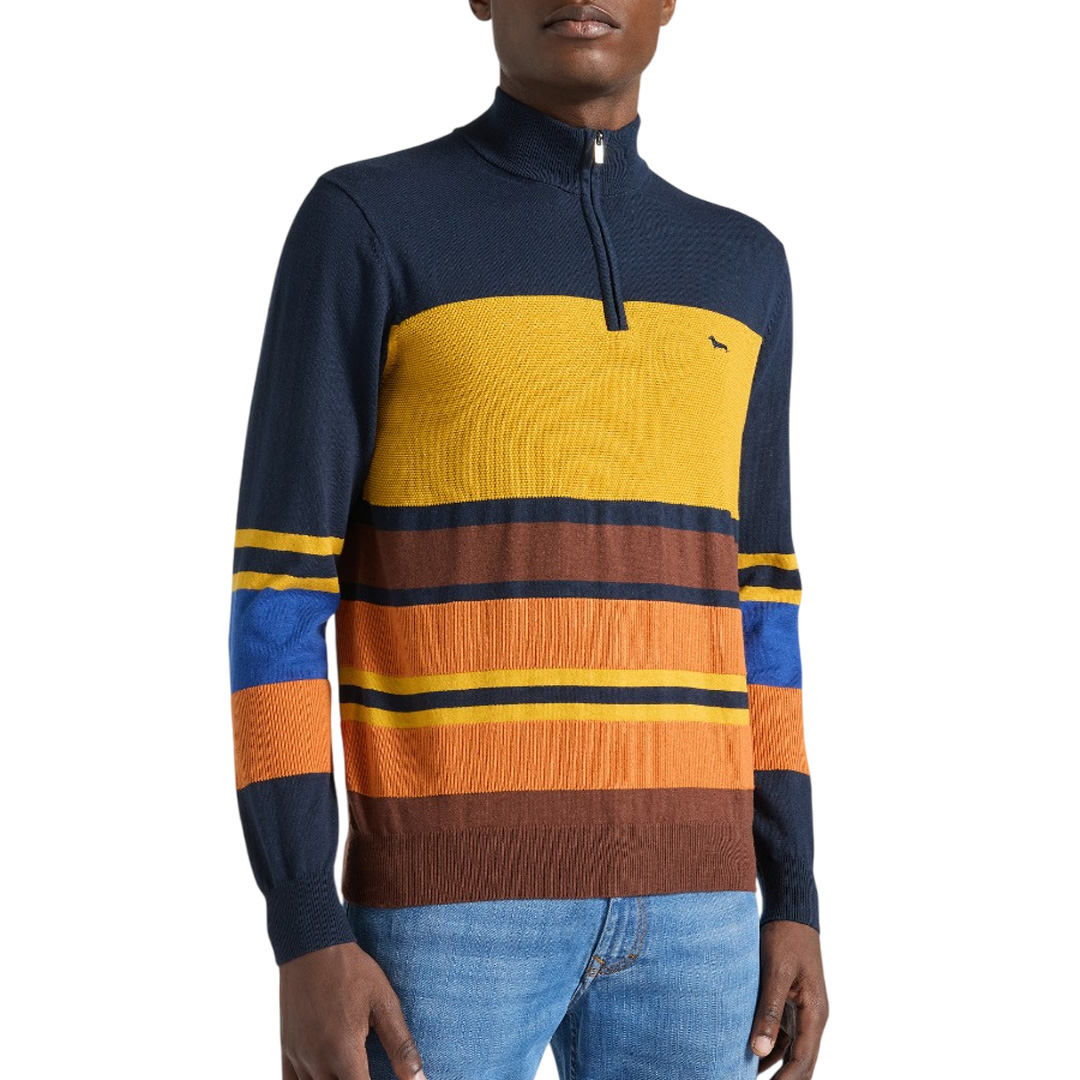 Harmont & Blaine designs this men's sweater in a soft and comfortable cotton and wool blend, perfect for completing your casual winter outfits. Featuring a stand-up collar with a zip, it's enlivened by the brand's signature touch of vivacity: a multicolored stripe pattern of varying thicknesses and a ribbed knit that extends through the pattern, collar, cuffs, and hem. The sweater, presented in a comfortable regular fit, is finished with an embroidered dachshund on the chest.