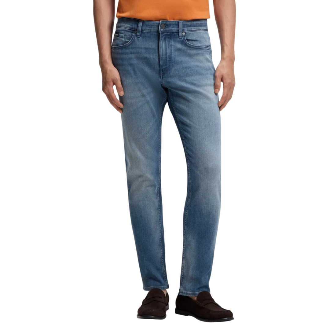 BOSS Men's slim-fit jeans with a regular waist, crafted from lightweight denim for comfort. Logo detail on the coin pocket. Slim fit. Regular waist. Button and zip fastening. Lower front pockets: Side pockets. Slim leg. Lower back pockets: Patch pocket. Standard length.