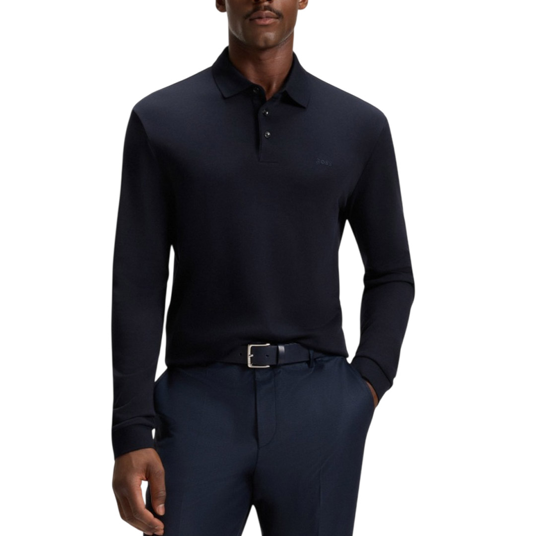 A true must-have for any man's wardrobe, this long-sleeved polo shirt from BOSS Men is a refined classic. Crafted from soft cotton with a straight fit. Regular fit. Flat-knit collar. Number of buttons: 3. Long sleeve. Standard length.