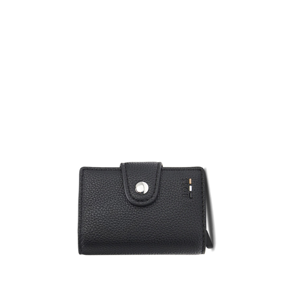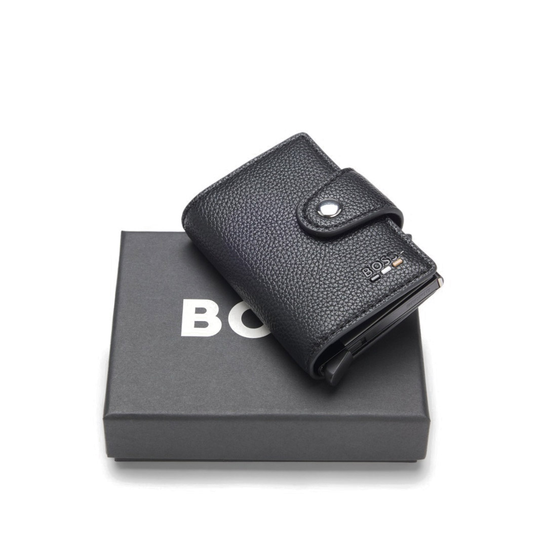 Featuring a snap closure, this BOSS Men's card holder is an innovative accessory for frequent travellers. Crafted from coated synthetic fabric with a hammered finish, this exclusive BOSS card holder features Secrid technology. Its patented system allows for easy access to cards, and the aluminum casing protects against unwanted wireless communications. The coated synthetic fabric, sometimes called faux leather, is designed to resemble genuine leather and features a matte, shiny, smooth, or textured coated effect. Dimensions: 9 x 7 x 1 cm Length: 7.0 cm Width: 1.0 cm Height: 9.0 cm