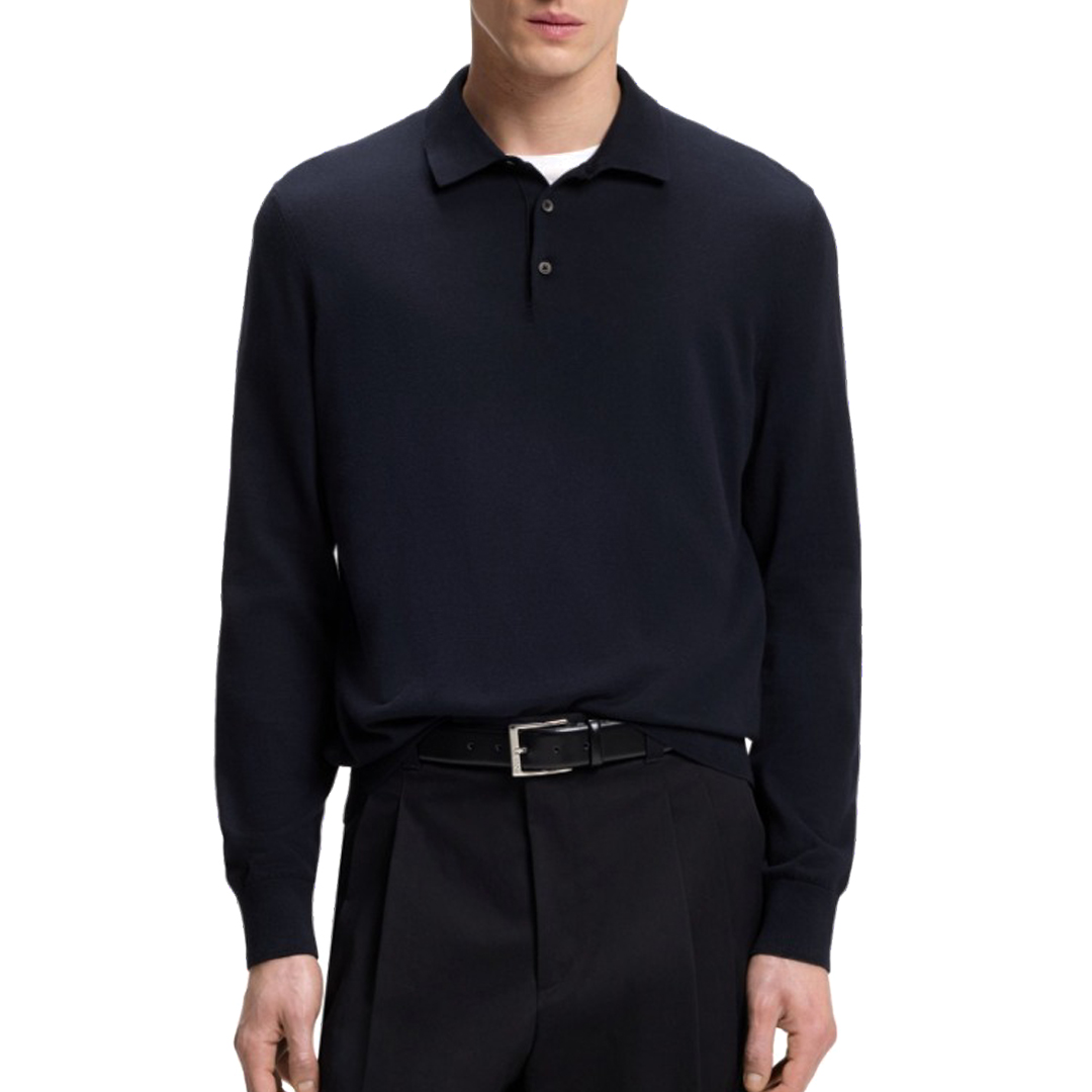 Create classic casual looks with the polo collar and premium cotton knit of this BOSS Men's sweater. Straight fit. Regular fit. Polo collar. Long sleeve. Ribbed cuffs. Standard length.