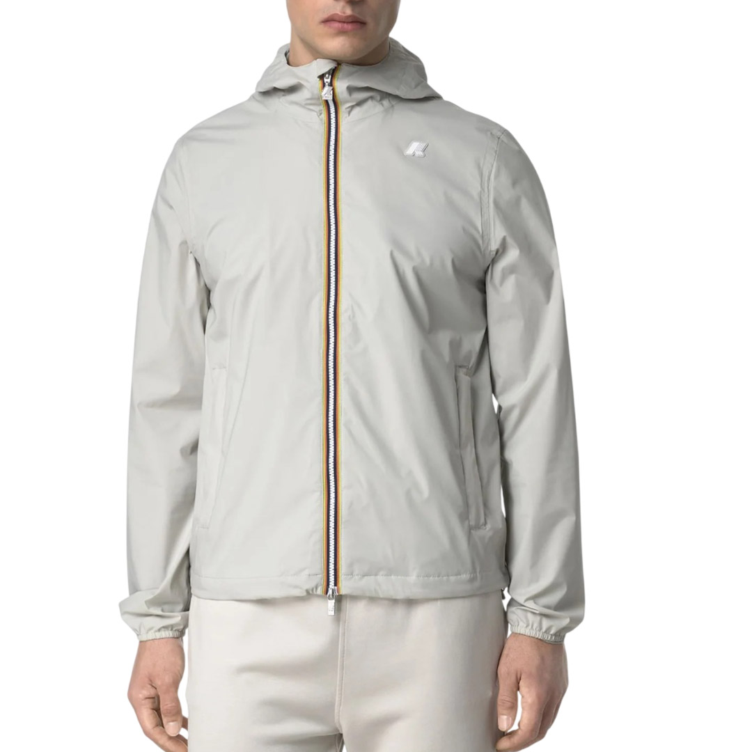 Jack is a slim-fit men's jacket made of weather-resistant stretch nylon and finished with a soft melange grey cotton jersey lining on the front and back for superior comfort and a pleasant feel against the skin. The interior features meticulous attention to detail, with heat-taped seams and the iconic multicolor K-Way tape at the waist, adding a distinctive touch to the design. Waterproof, windproof, and breathable stretch nylon fabric. Cotton jersey lining. Heat-taped seams. Fixed, adjustable hood. Ventilation cut on the back. Zip closure. Elasticated cuffs. Adjustable drawstring hem. Two zip pockets. Slim fit.