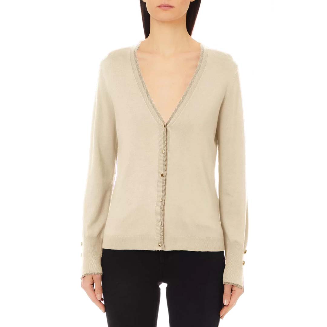 Women's long-sleeved viscose shirt with sparkling effect. The garment is characterized by high cuffs with matching buttons. The model is 182 cm tall and wears a S/42/28