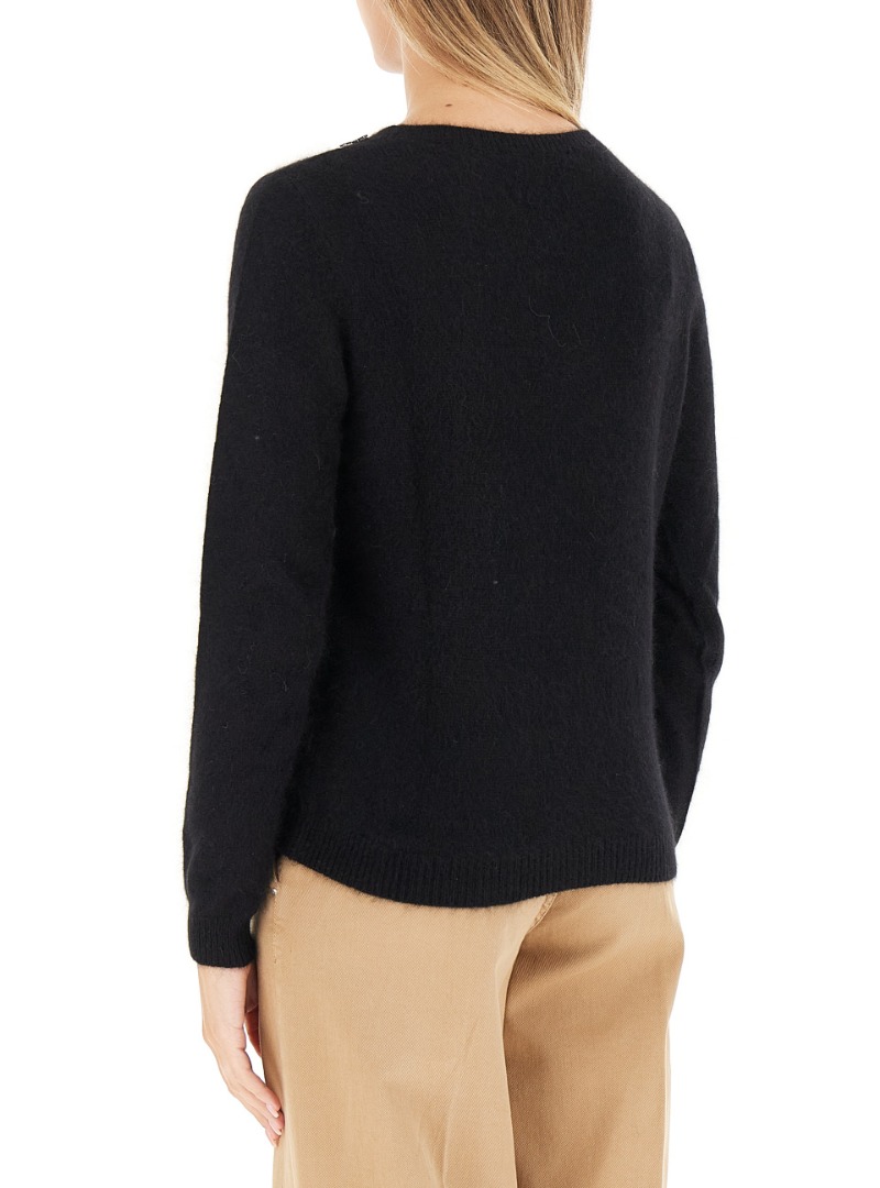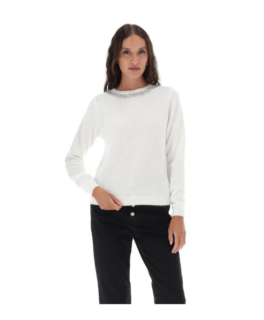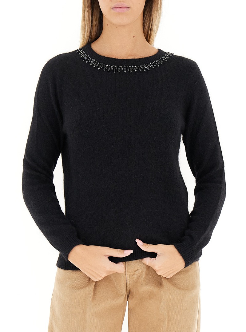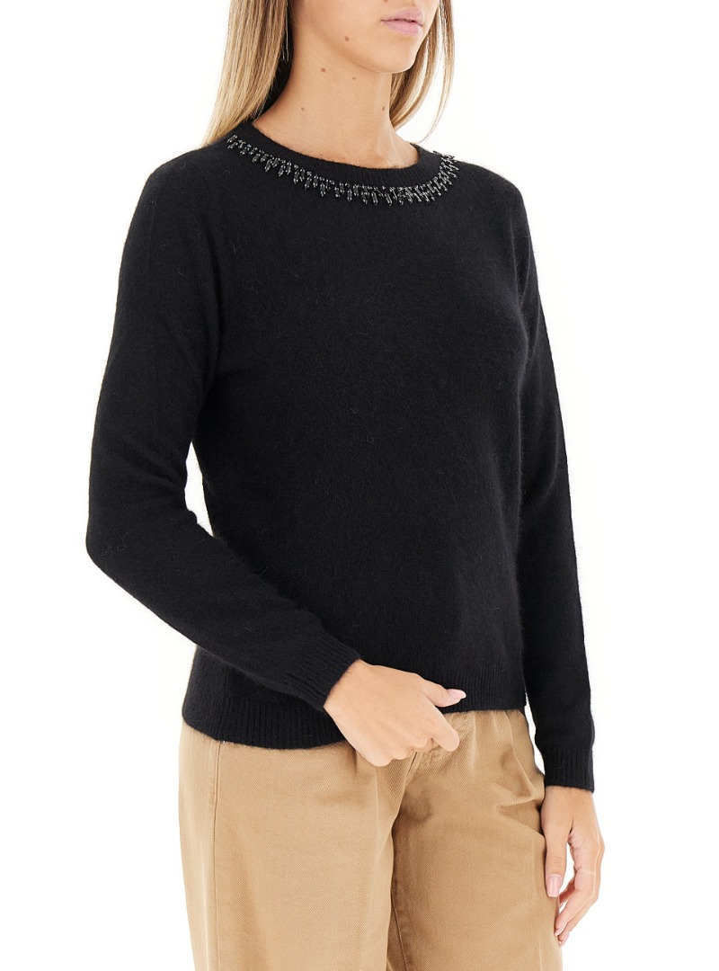 This sweater features a neckline embellished with a stone necklace that adds style and sophistication. It has a straight cut, regular fit, and ribbed edges.